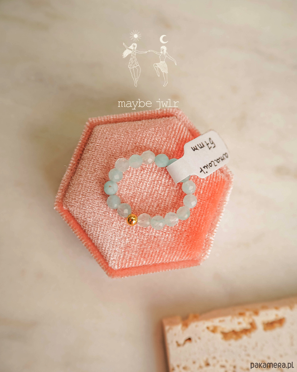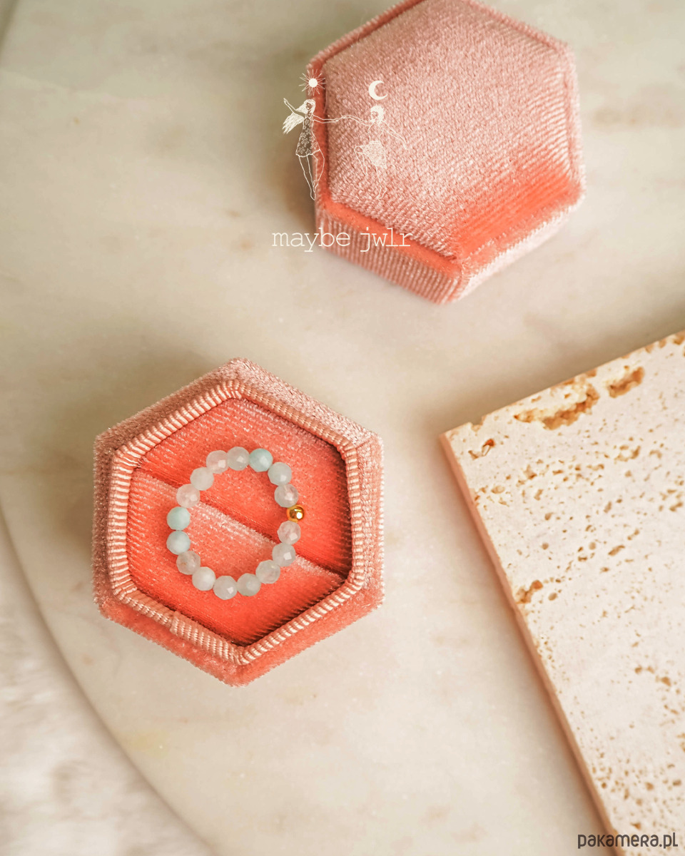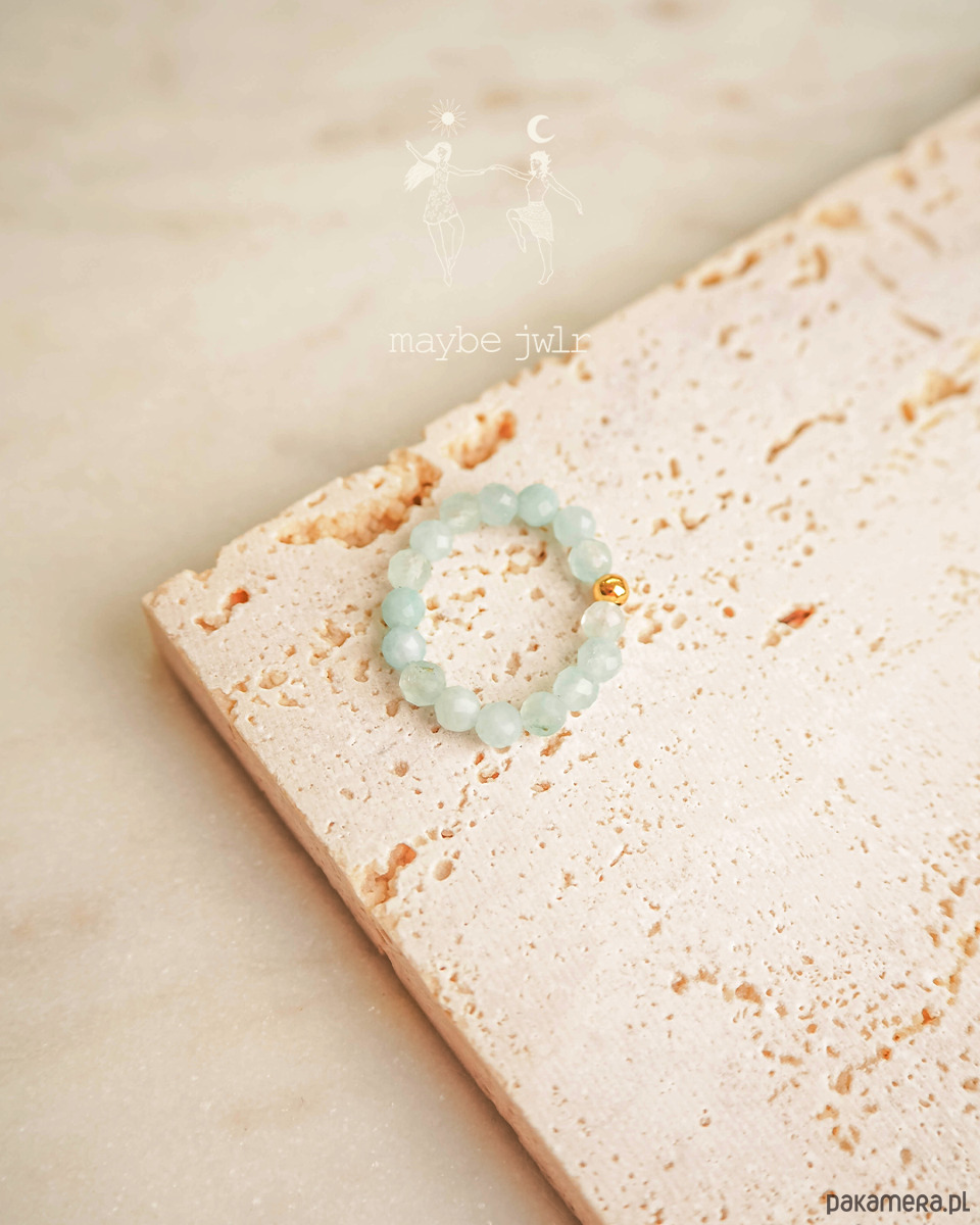 Pierścionek jest w całości zrobiony z kamieni naturalnych, a zakończony jest pozłoconą kuleczką ze