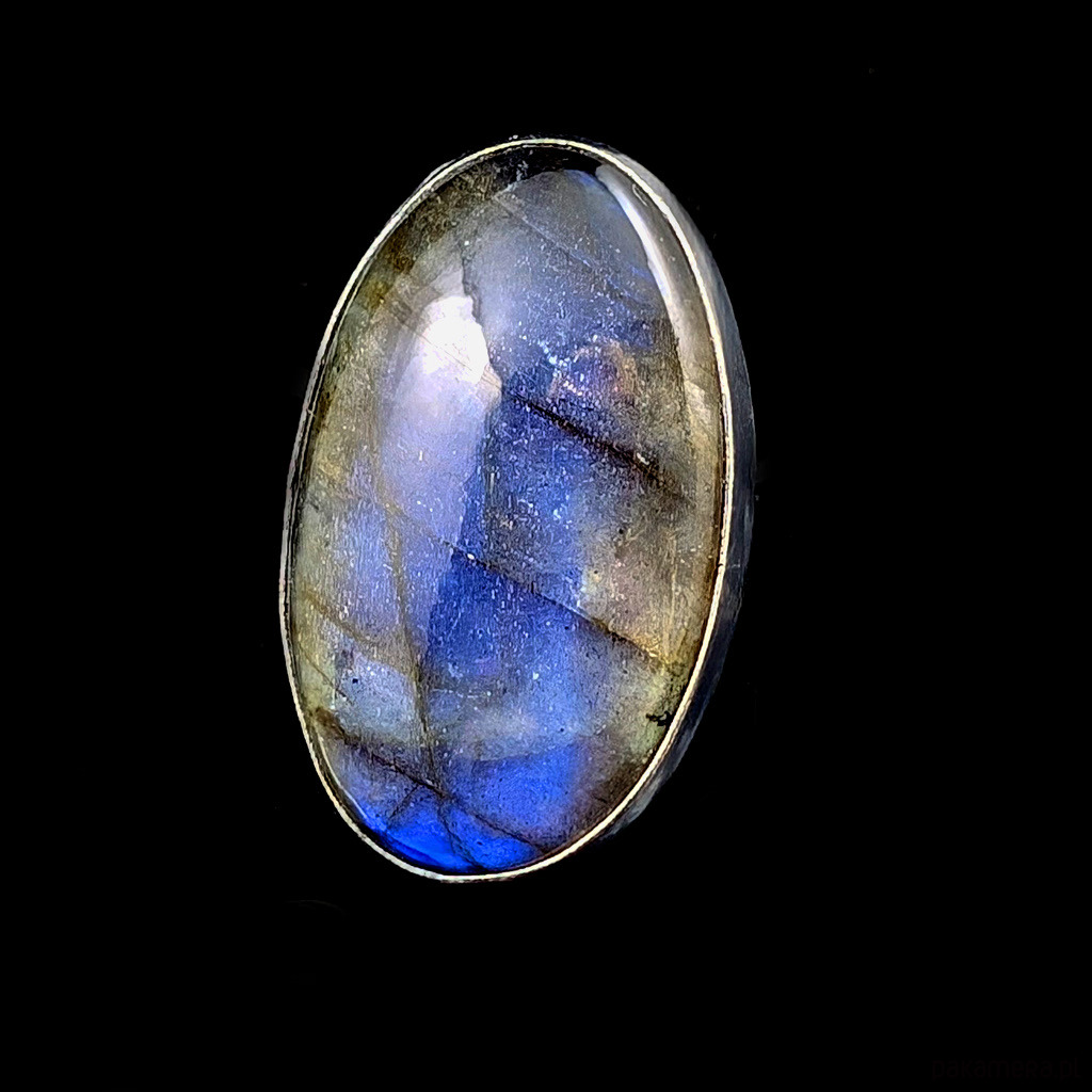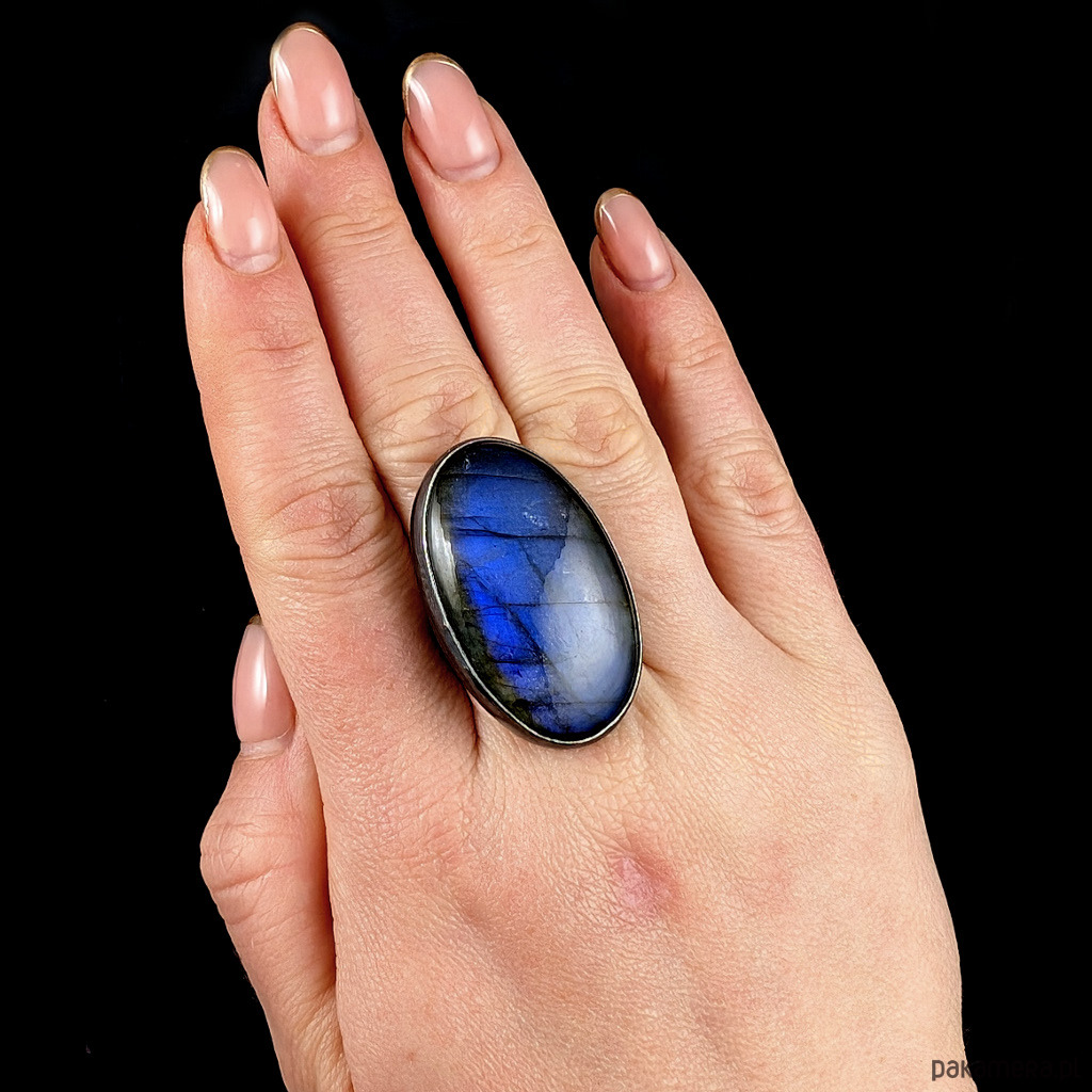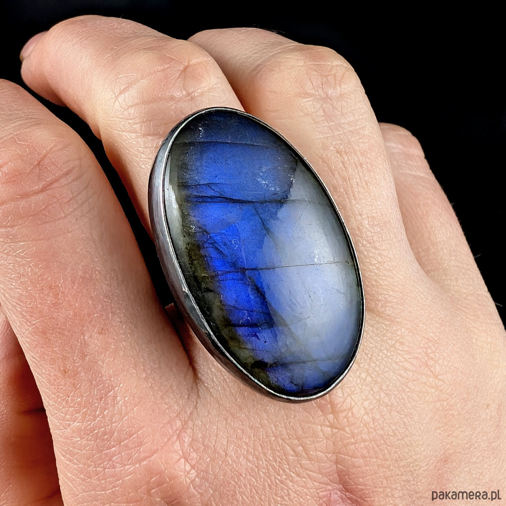 Okazały pierścień wykonany własnoręcznie ze srebra próby 925 oraz naturalnego labradorytu. Oprawa oksydowana. Wymiary oprawy 38 x 24 mm. Rozmiar jubilerski 17, mogę powiększyć obrączkę do rozmiaru max. 22. Obrączka ma 5 mm szerokości, waga 20 g. Pierścionek zostanie zapakowany w ozdobne pudełeczko.