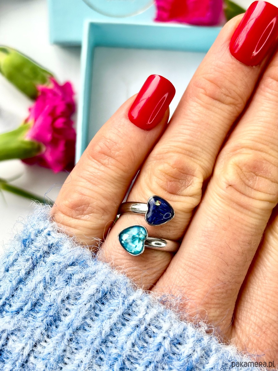 Ręcznie wykonany pierścionek dwoma oczkami w kształcie serca. Biżuteria wykonana jest z wyselekcjonowanych kawałków masy perłowej, drobinek szkła w odcieniu niebieskim oraz suszonych kwiatów bławatka. Pierścionek pięknie prezentuje się na dłoni, dzięki możliwości regulacji można dopasować go do większości placów.