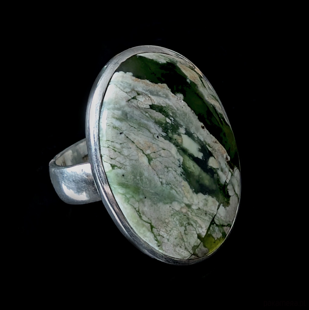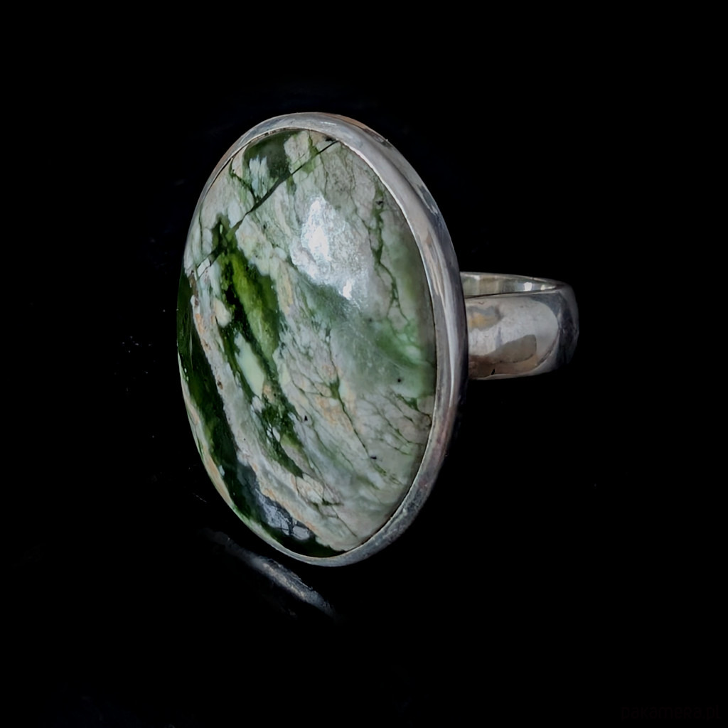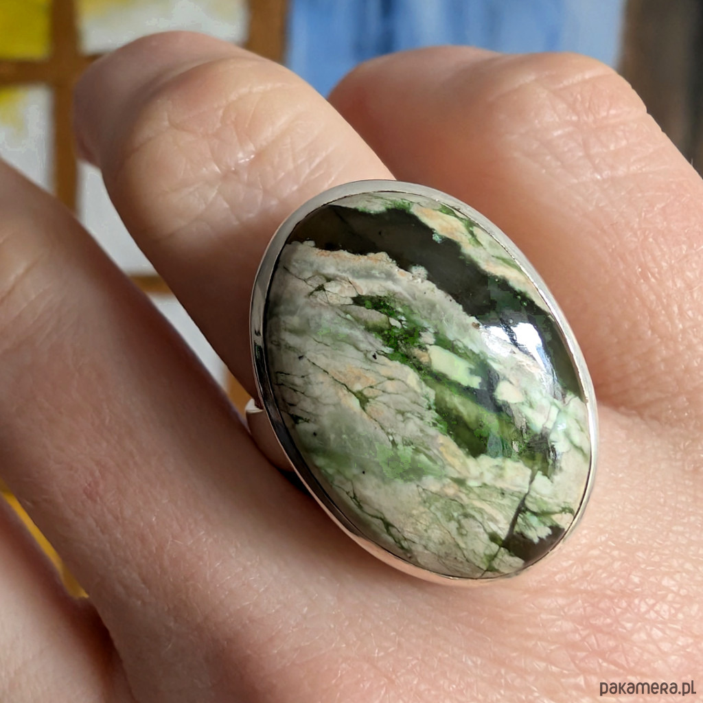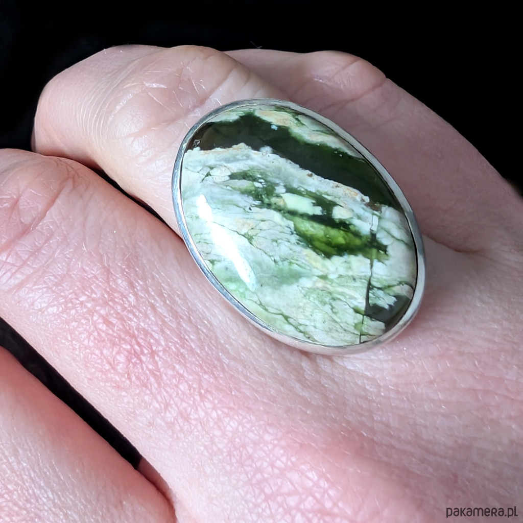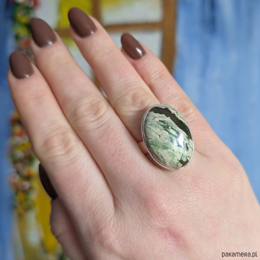 Pierścień z oprawionym w srebro próby 925 przepięknym chalcedonem chromowym. Piękny egzemplarz, ciemnozielony fragment minerał u pięknie wygląda pod światło. Waga 10 gramów. Obrączka ma 5 mm szerokości. Wymiary oprawy 27 x 20 mm, rozmiar jubilerski regulowany w wąskim zakresie -13- 18. Proszę napisać na jaki dopasować. Zostanie zapakowany w ozdobne pudełeczko. Wykonany przez dostawcę kamieni.