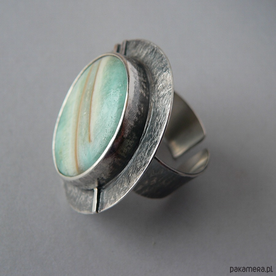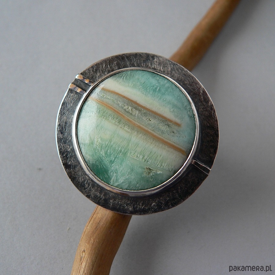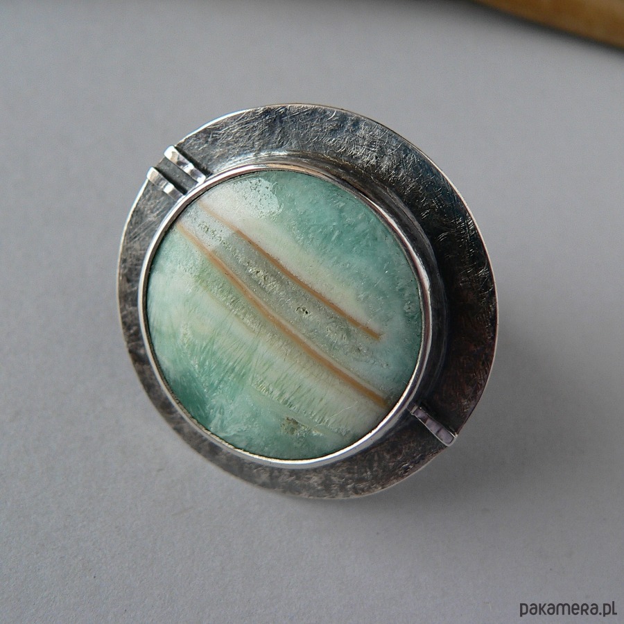 Duży pierścień wykonany z chalcedonu chromowego o ciekawym rysunku i srebra. Srebro kute i oksydowane, oprawa kamienia i detale polerowane. Średnica kamienia 2,7 cm, średnica całego frontu pierścienia 3,8 cm Obrączka regulowana, przy zakupie proszę podać noszony rozmiar , ustawię obrączkę. Kamień posiada naturalne skazy i uszczerbki.