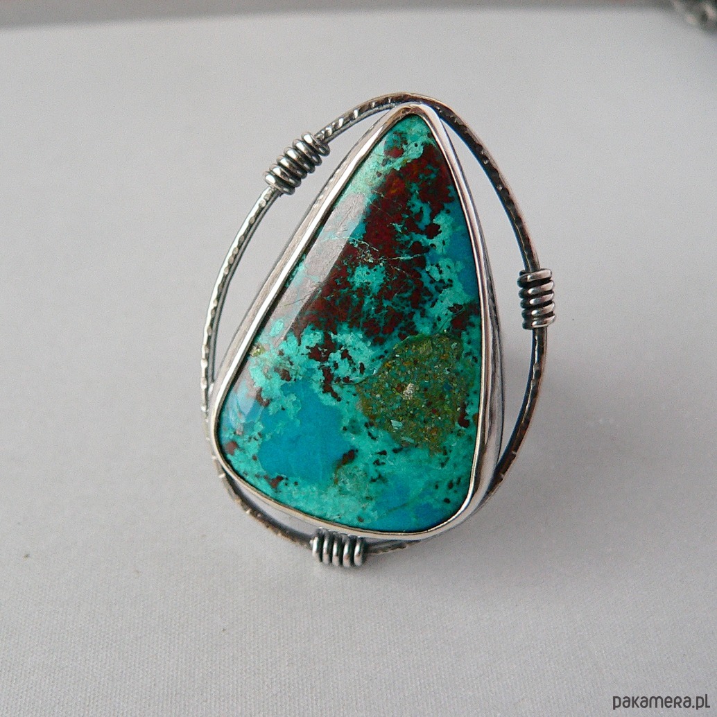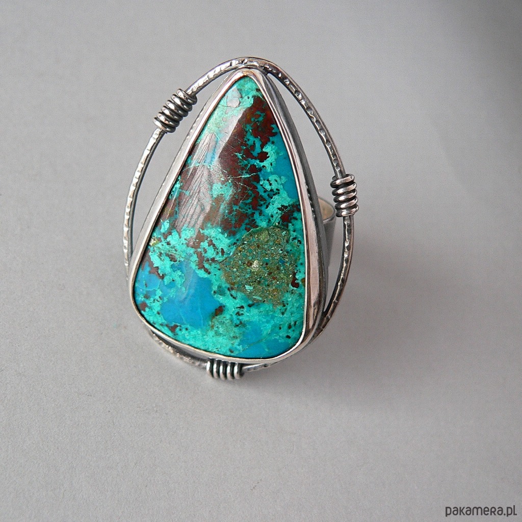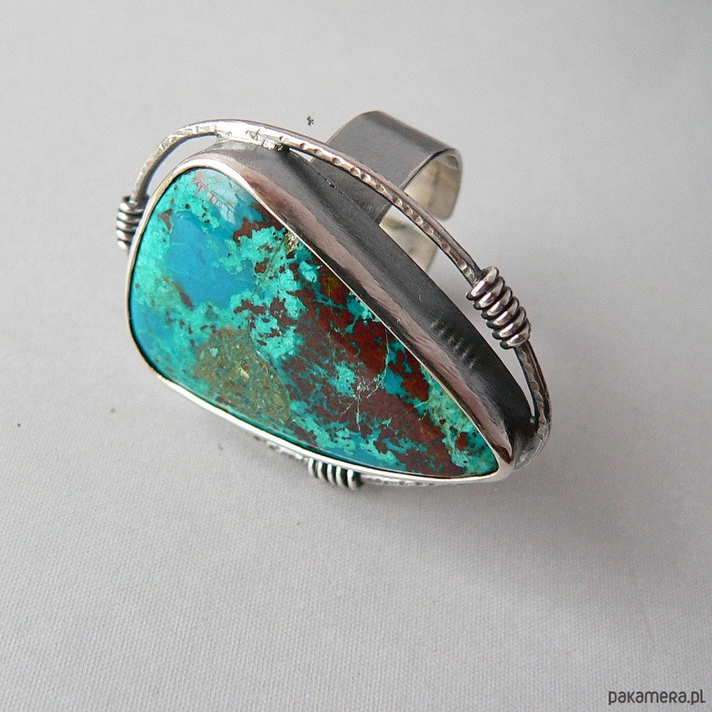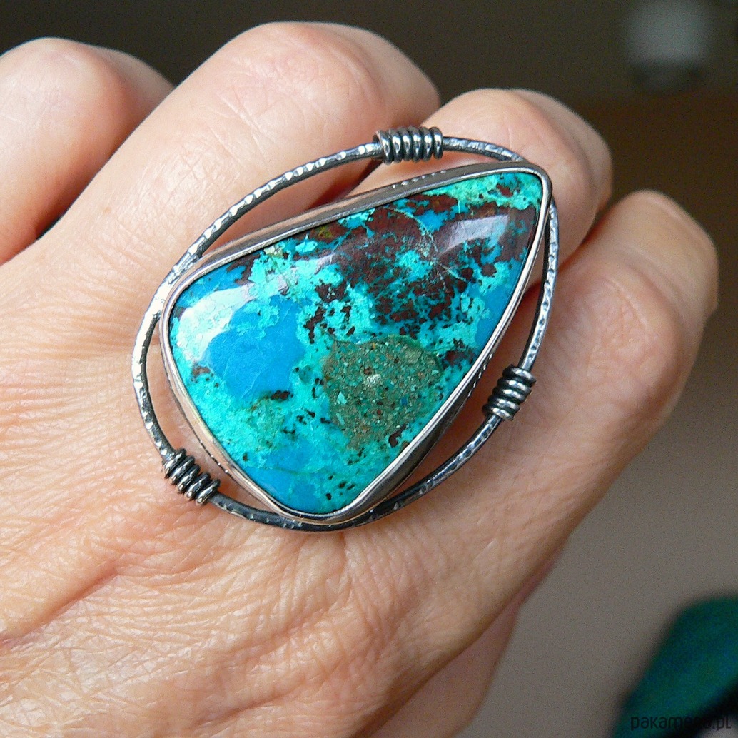 Duży, zwracający uwagę pierścień wykonany ze srebra i dużego okazu chryzokoli o pięknym rysunku i barwach . Wymiary kamienia- 2,6/3,8 cm , Całkowity wymiar frontu 4,5/3,2 cm Srebro kute, oksydowane i polerowane. Szerokość obrączki- 1 cm Rozmiar regulowany, przy zakupie proszę podać noszony rozmiar, ustawię obrączkę. Mimo dużych rozmiarów pierścień nie jest bardzo ciężki.