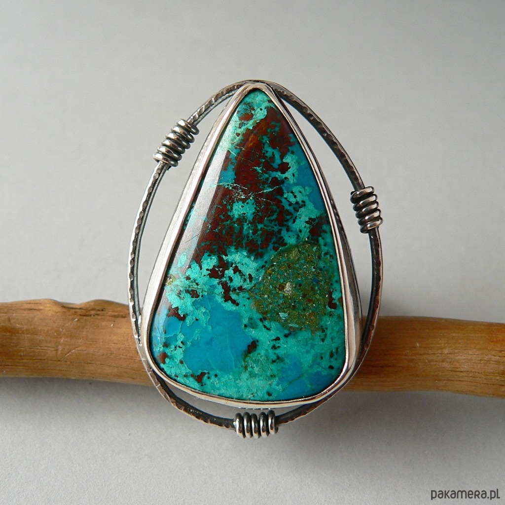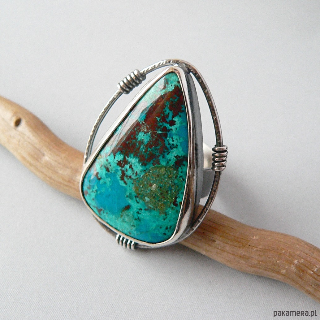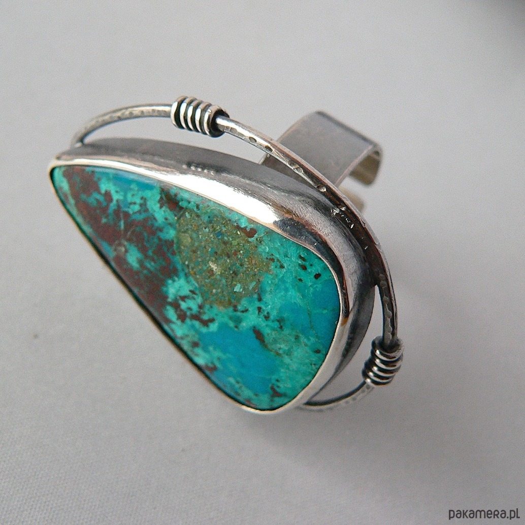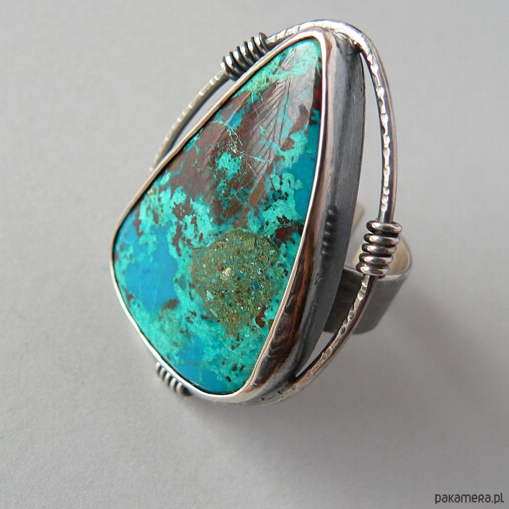 Duży, zwracający uwagę pierścień wykonany ze srebra i dużego okazu chryzokoli o pięknym rysunku i barwach . Wymiary kamienia- 2,6/3,8 cm , Całkowity wymiar frontu 4,5/3,2 cm Srebro kute, oksydowane i polerowane. Szerokość obrączki- 1 cm Rozmiar regulowany, przy zakupie proszę podać noszony rozmiar, ustawię obrączkę. Mimo dużych rozmiarów pierścień nie jest bardzo ciężki.