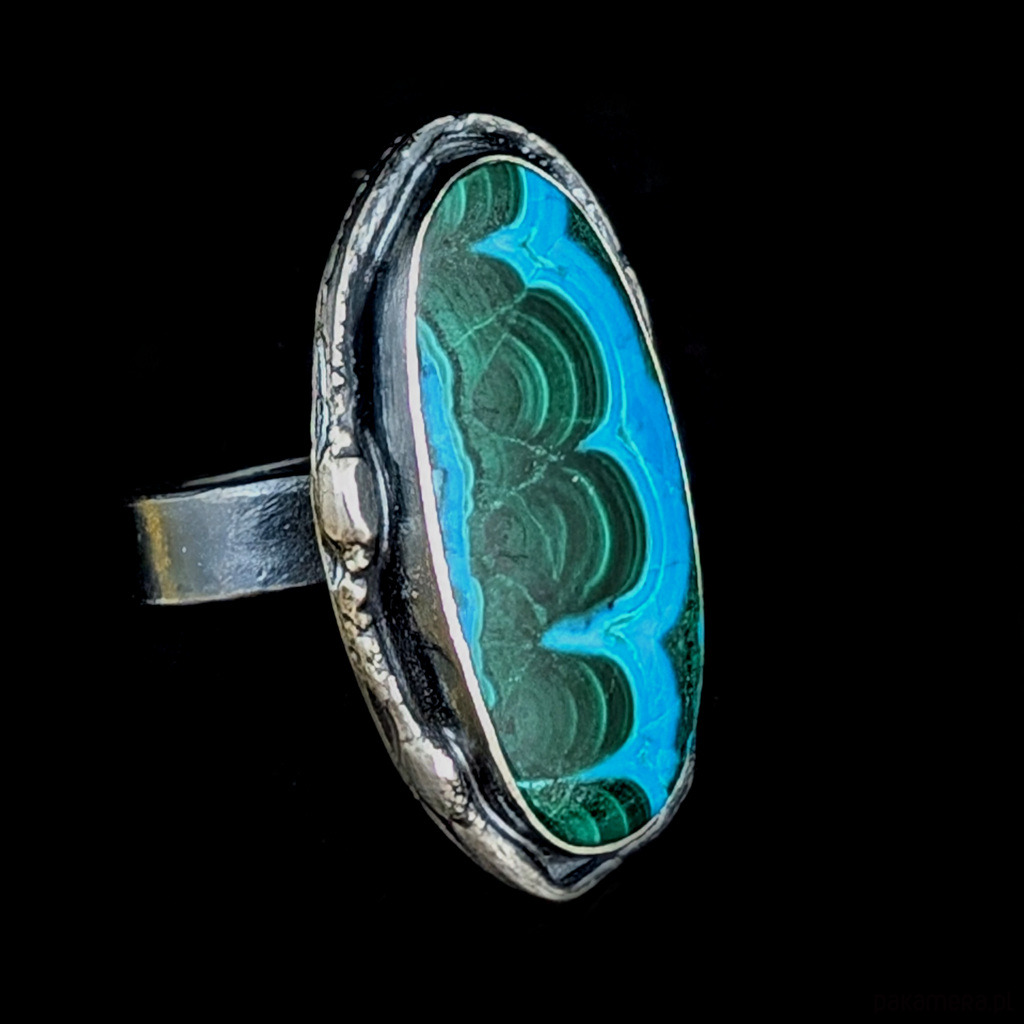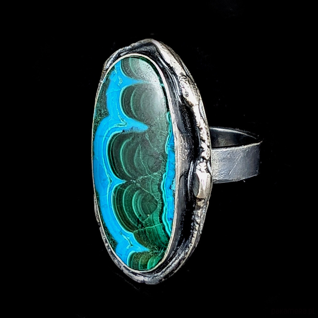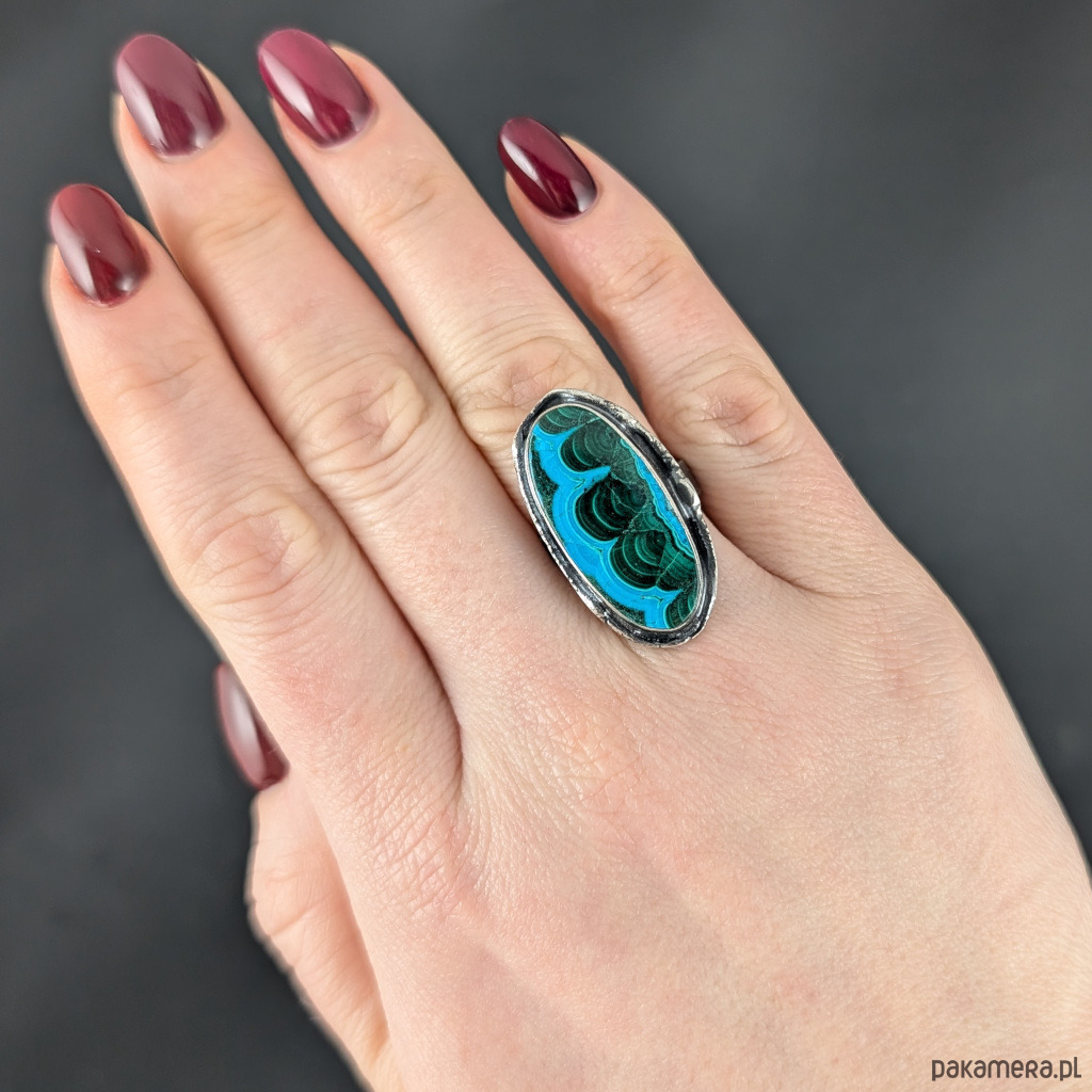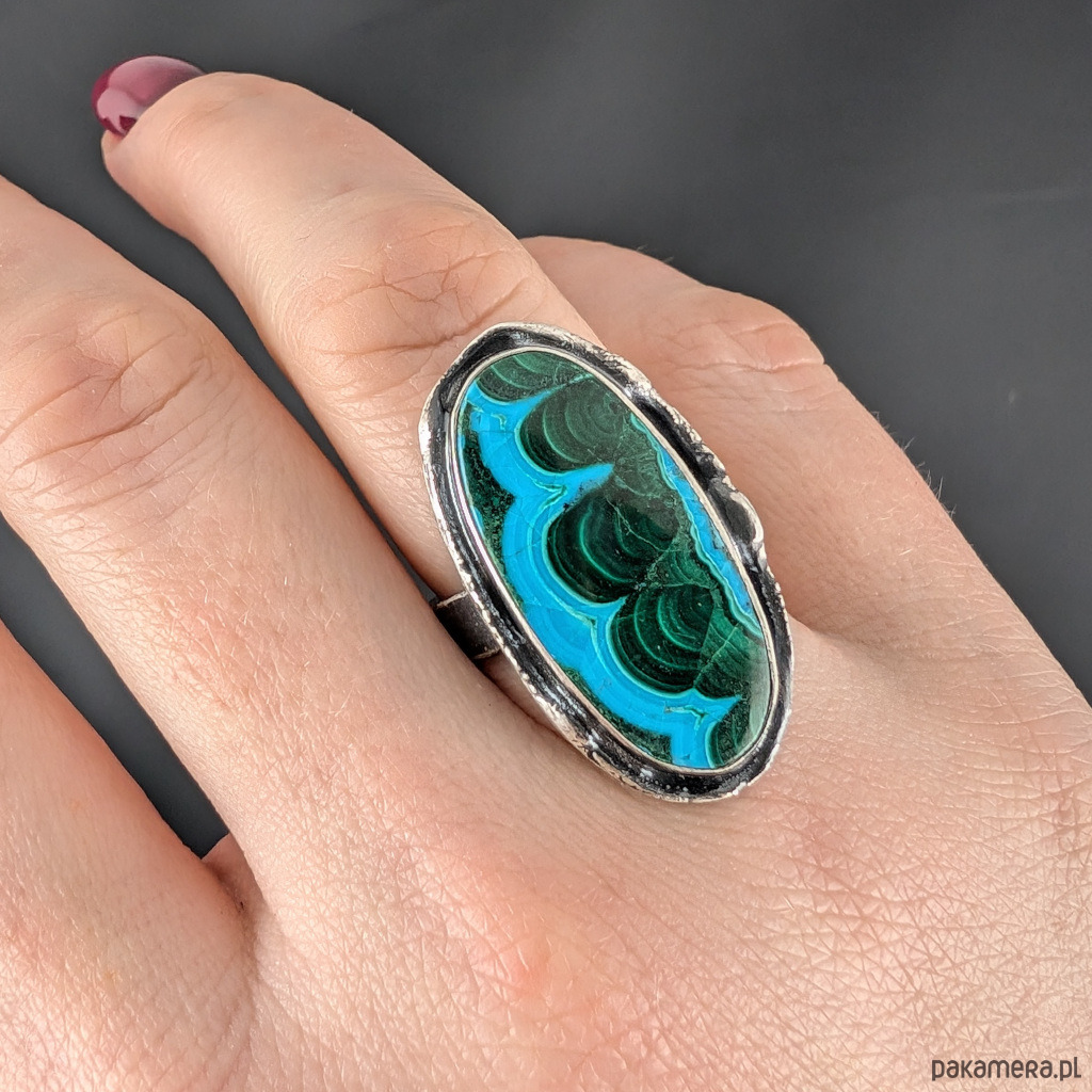 Pierścień z oprawionym w oksydowane srebro próby 925 przepięknym kamieniem chryzokoli z wrostem malachitu. Piękny egzemplarz. Waga 10 gramów. Obrączka ma 5 mm szerokości. Wymiary oprawy 30 x 17 mm, rozmiar jubilerski 14, mogę powiększyć na max 15. Zostanie zapakowany w ozdobne pudełeczko.