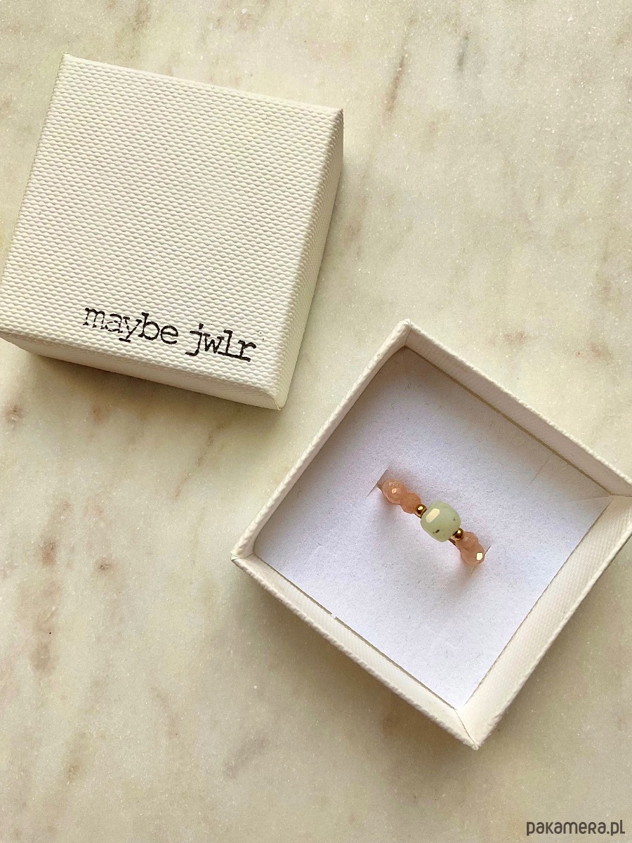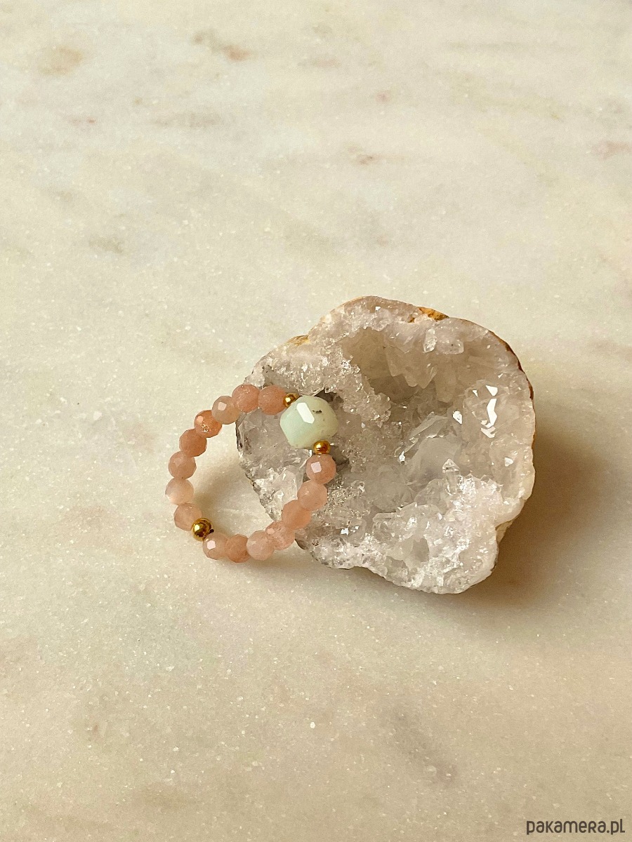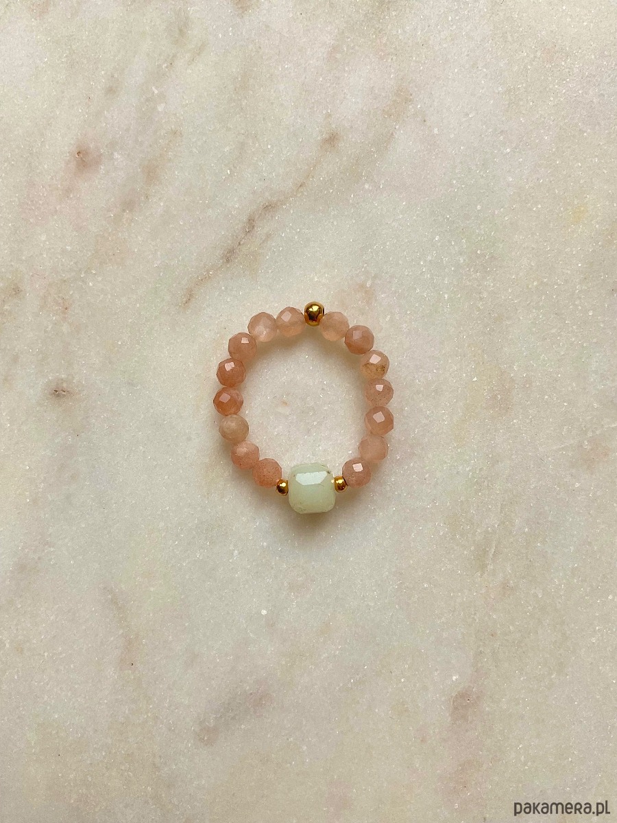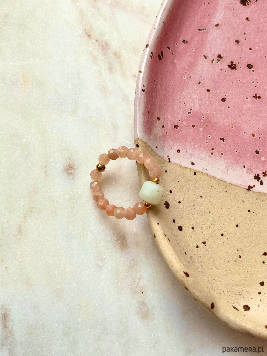 Pierścionek na gumce jubilerskiej wykonany z kamieni słonecznych i kostki amazonitu oraz kuleczki ze stali chirurgicznej.