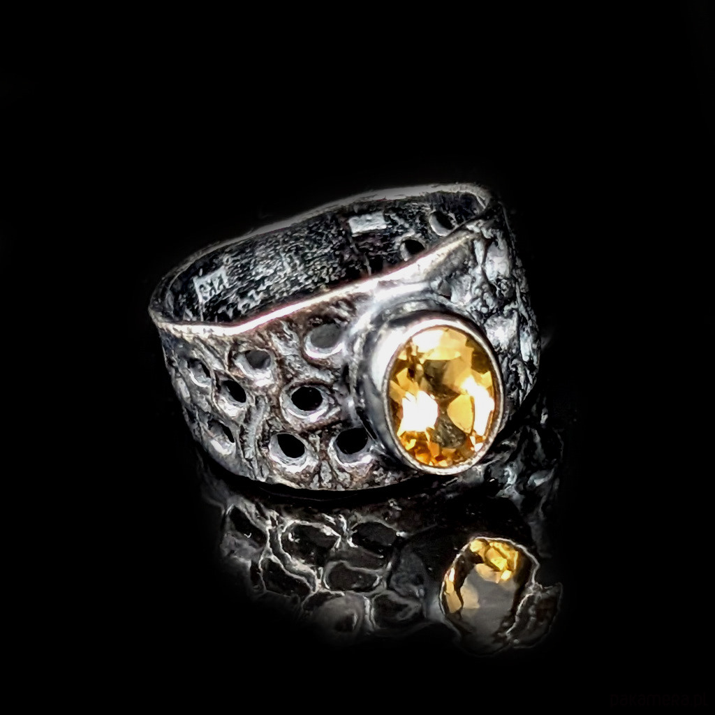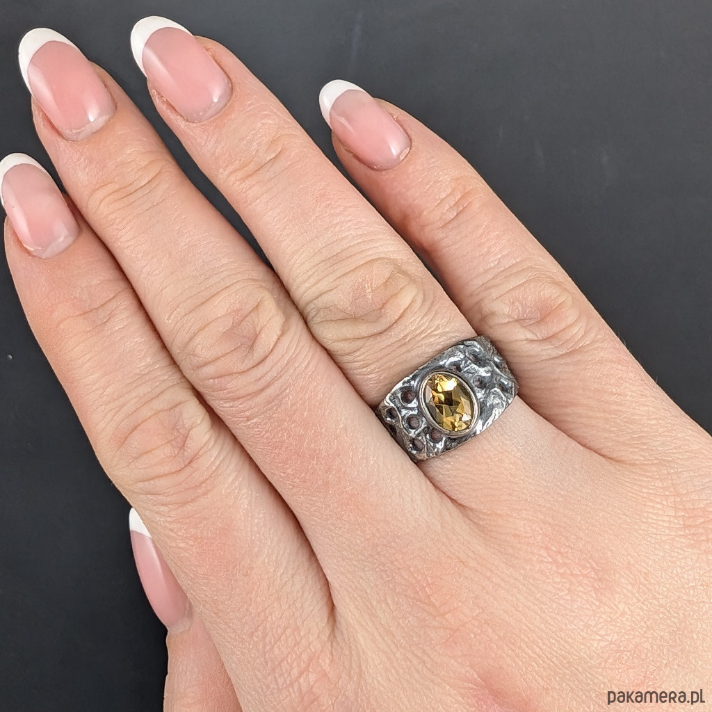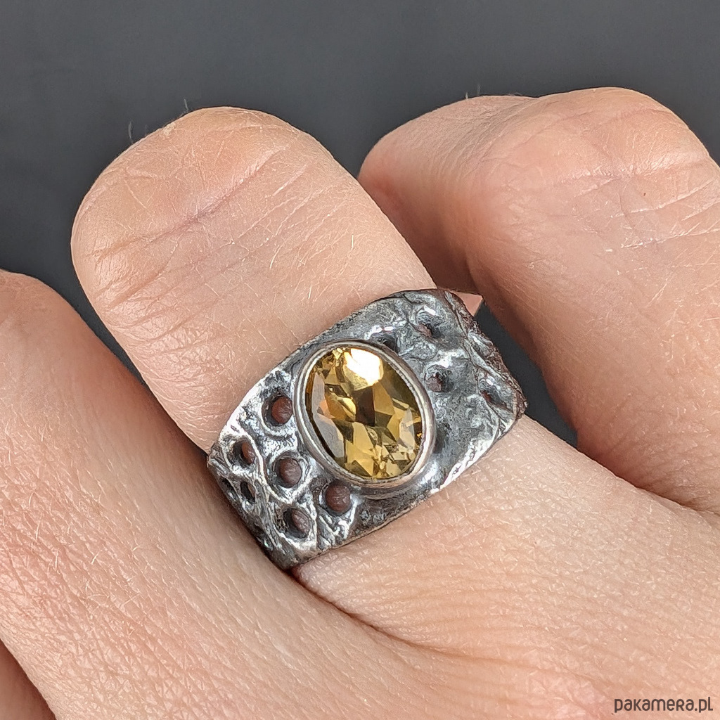 Przepiękny, szlifowany cytryn oprawiony w surową ramę. Wymiary oprawy kamienia 9 x 7 mm. Pierścień waży 5,4 g. Naturalny cytryn ciekawie zakomponowany w oksydowane. Rozmiar jubilerski 15. Możliwe powiększenie na rozmiar max. 16. Pierścień zostanie zapakowany w ozdobne pudełeczko.