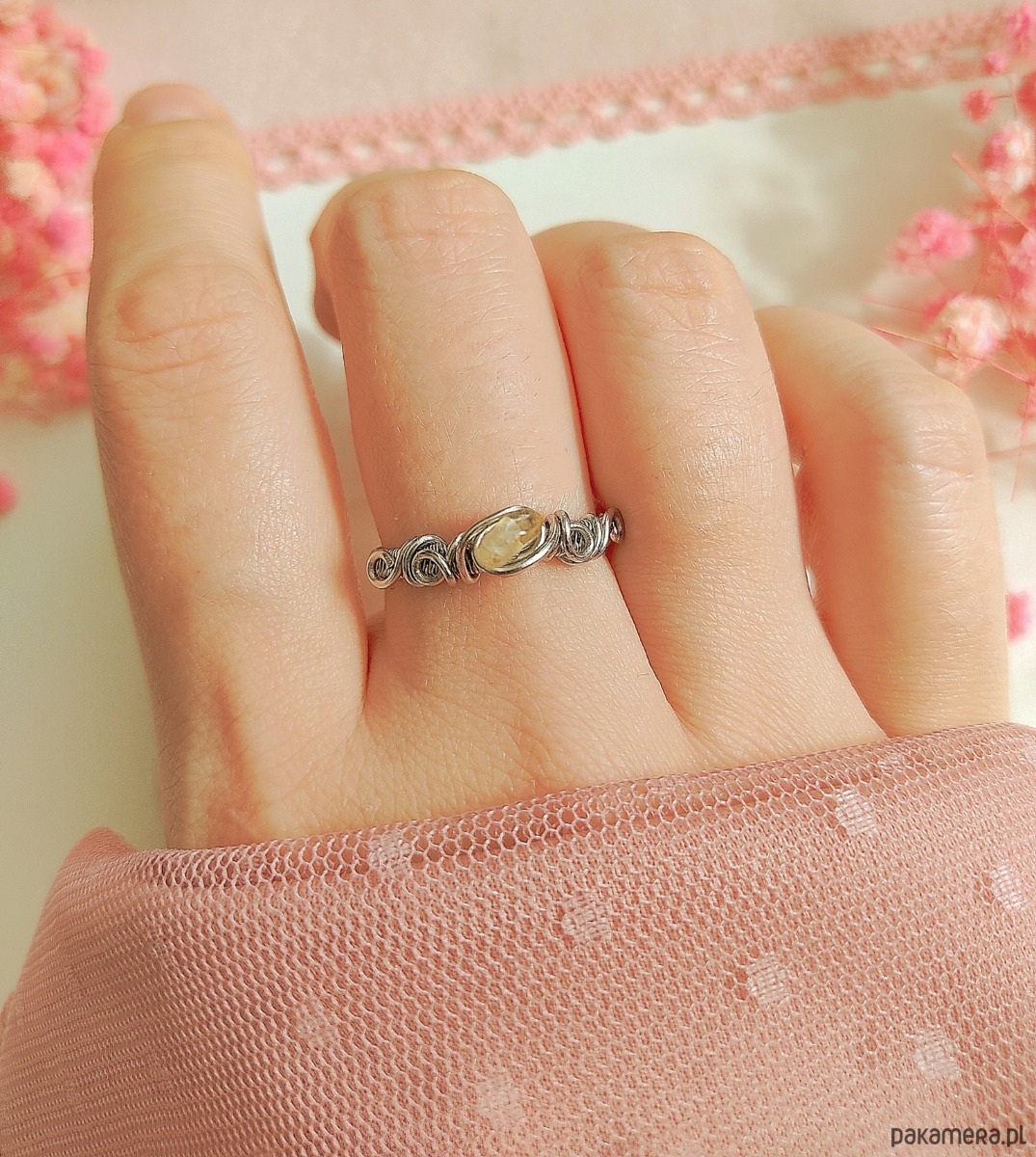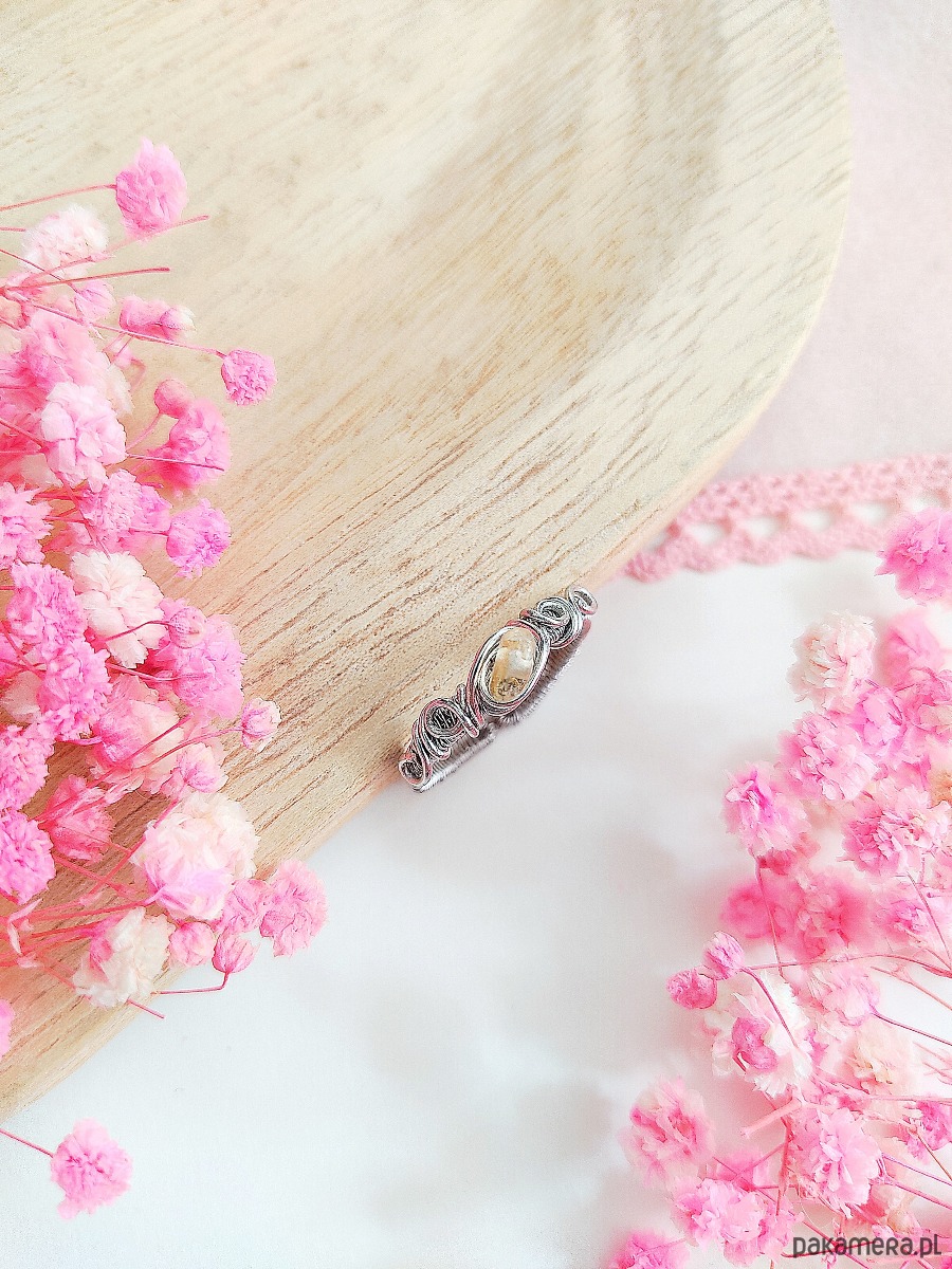 Pierścionek został wykonany ręcznie metodą wire wrapping, co oznacza, że drut stalowy został starannie opleciony wokół kamienia, tworząc unikalny wzór. Stal chirurgiczna, z której powstała ta biżuteria, jest materiałem hipoalergicznym, odpornym na działanie wilgoci i czynników zewnętrznych. Dzięki temu pierścionek może być noszony na co dzień bez obaw o jego trwałość czy reakcje alergiczne.