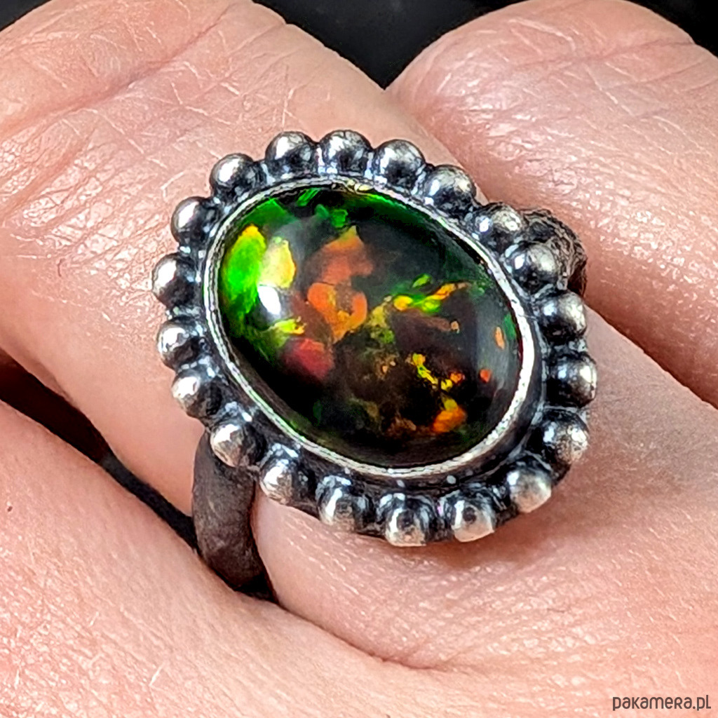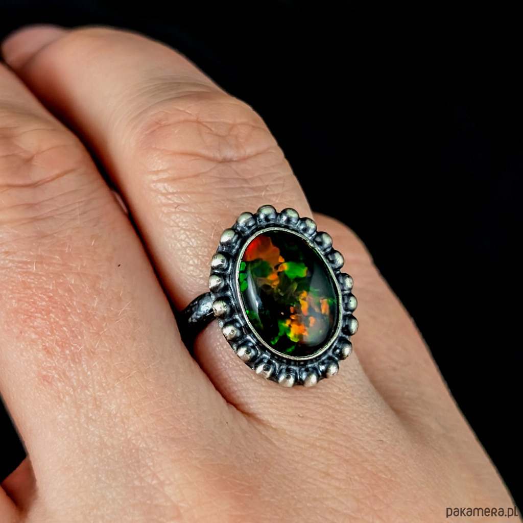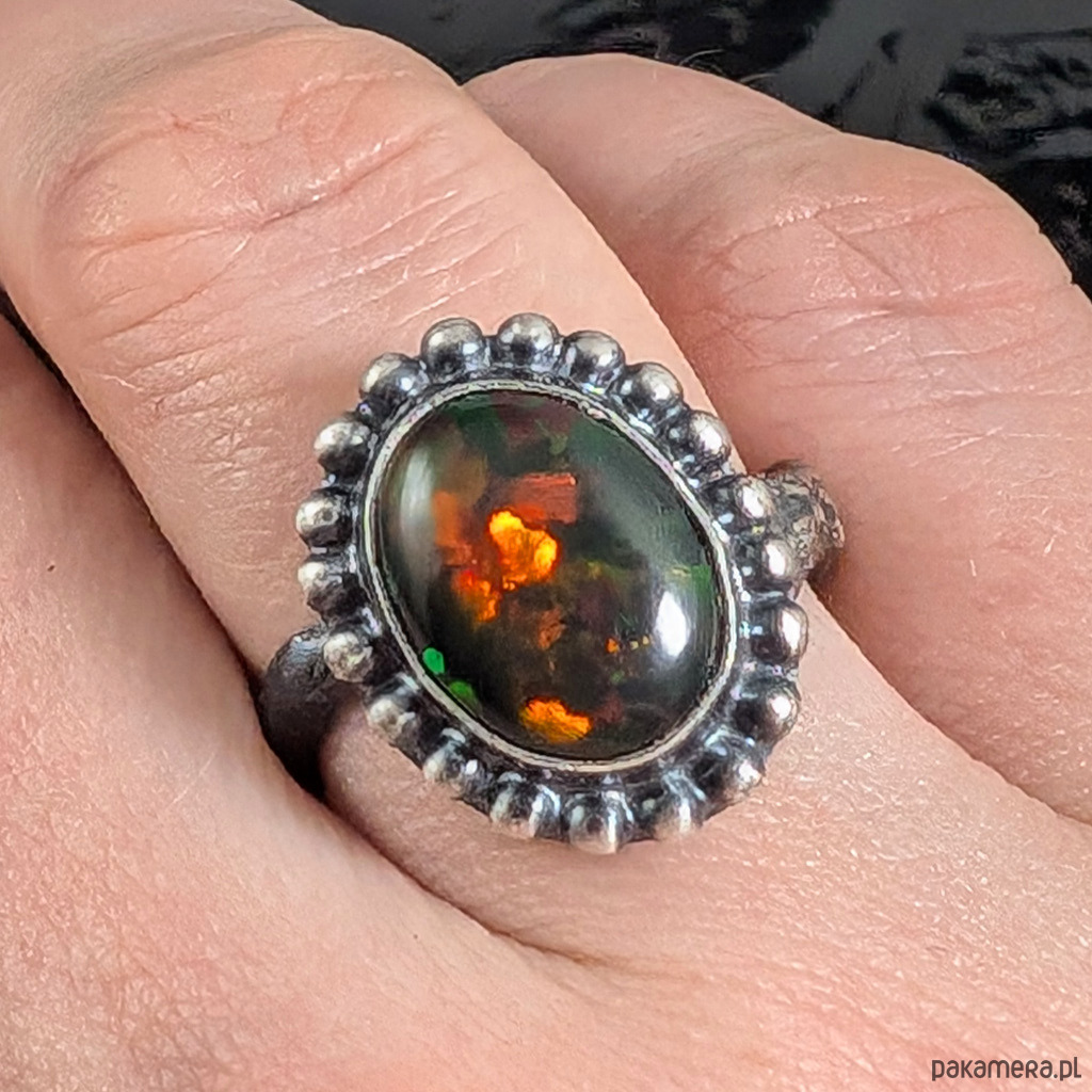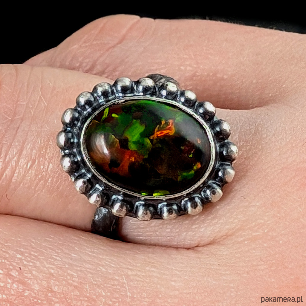 Pierścionek wykonany z oksydowanego srebra próby 925. Rozmiar pierścionka dzięki otwartej podstawie regulowany, mogę dopasować na dowolny rozmiar w zakresie 9-23, proszę napisać na jaki ustawić. Ozdobą pierścionka jest zjawiskowy czarny opal z Etiopii. Wymiary oprawy kamienia 19 x 15 mm, szerokość maksymalna obrączki mm, min. 4 mm. Waga 6,6 g. Pierścień zostanie zapakowany w ozdobne pudełeczko.