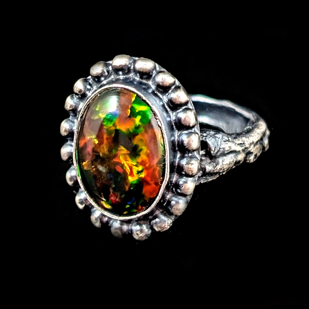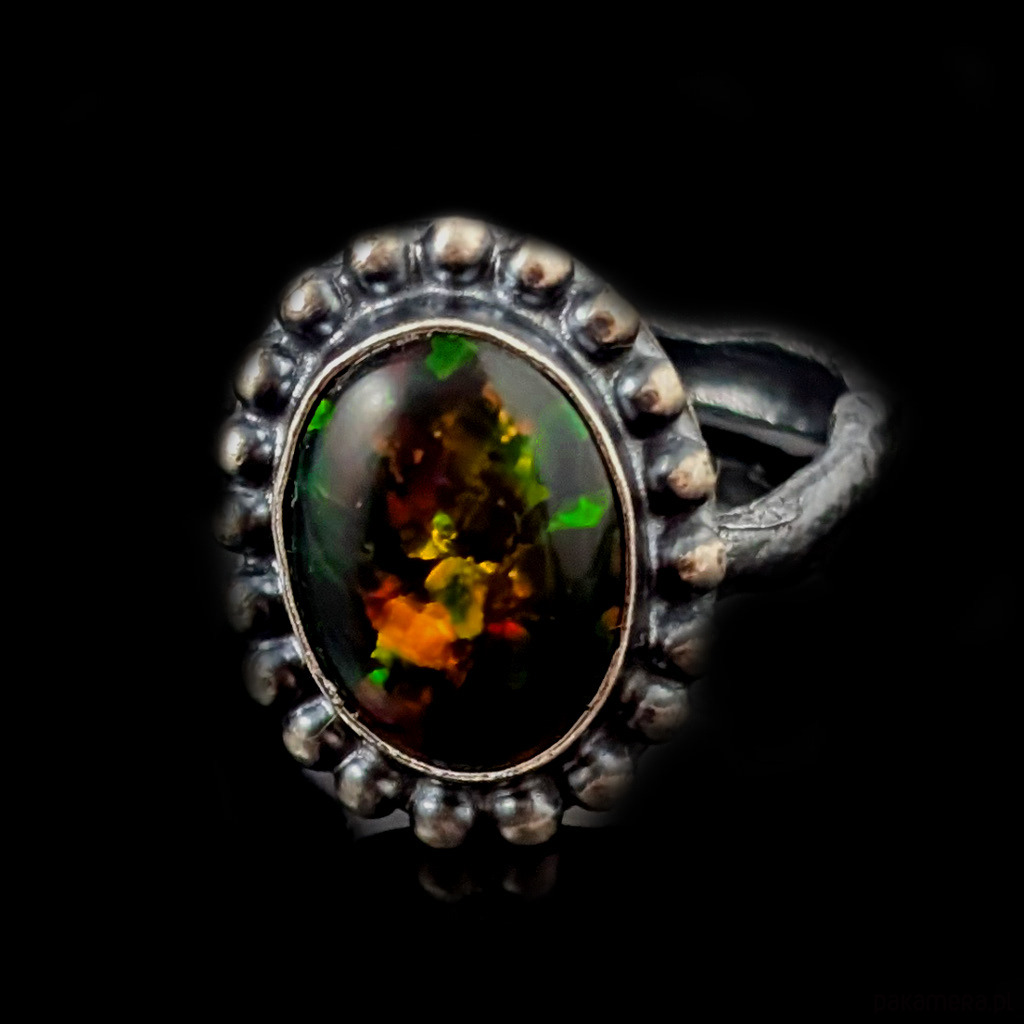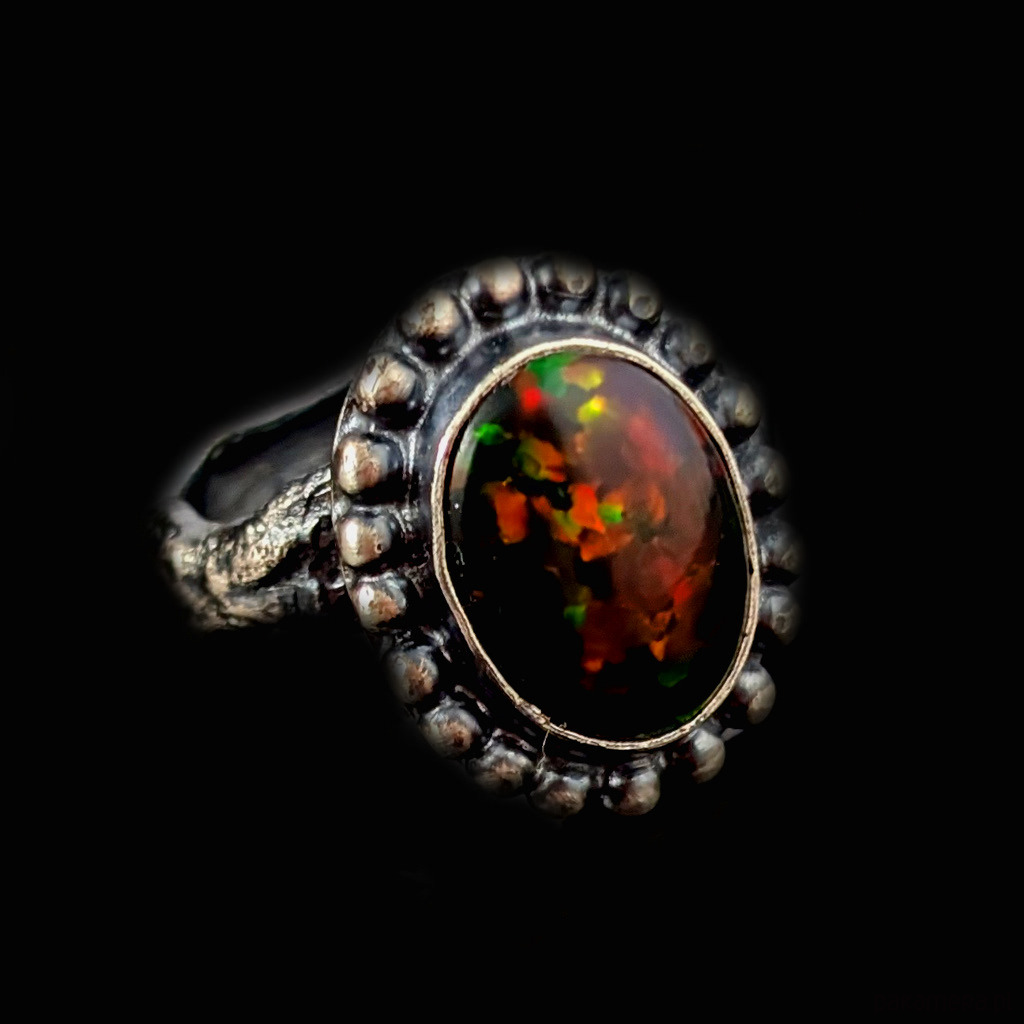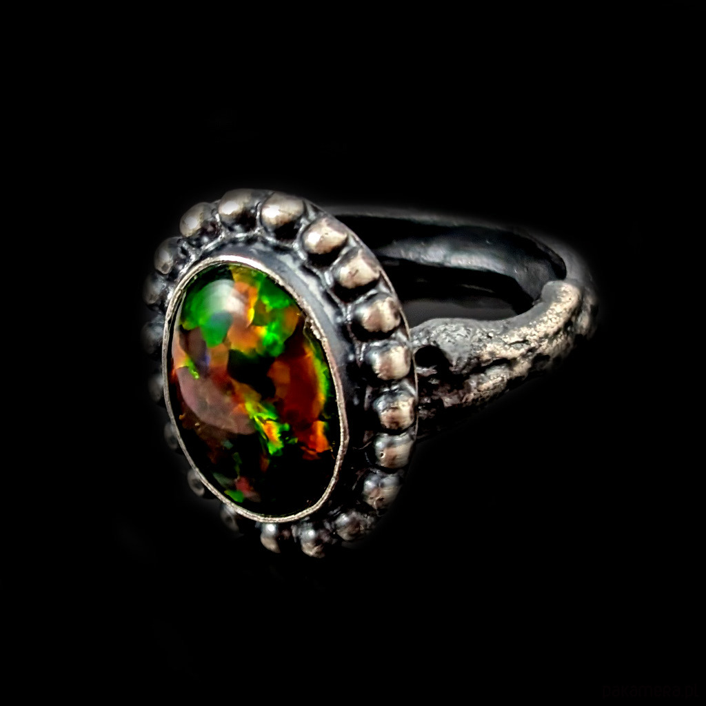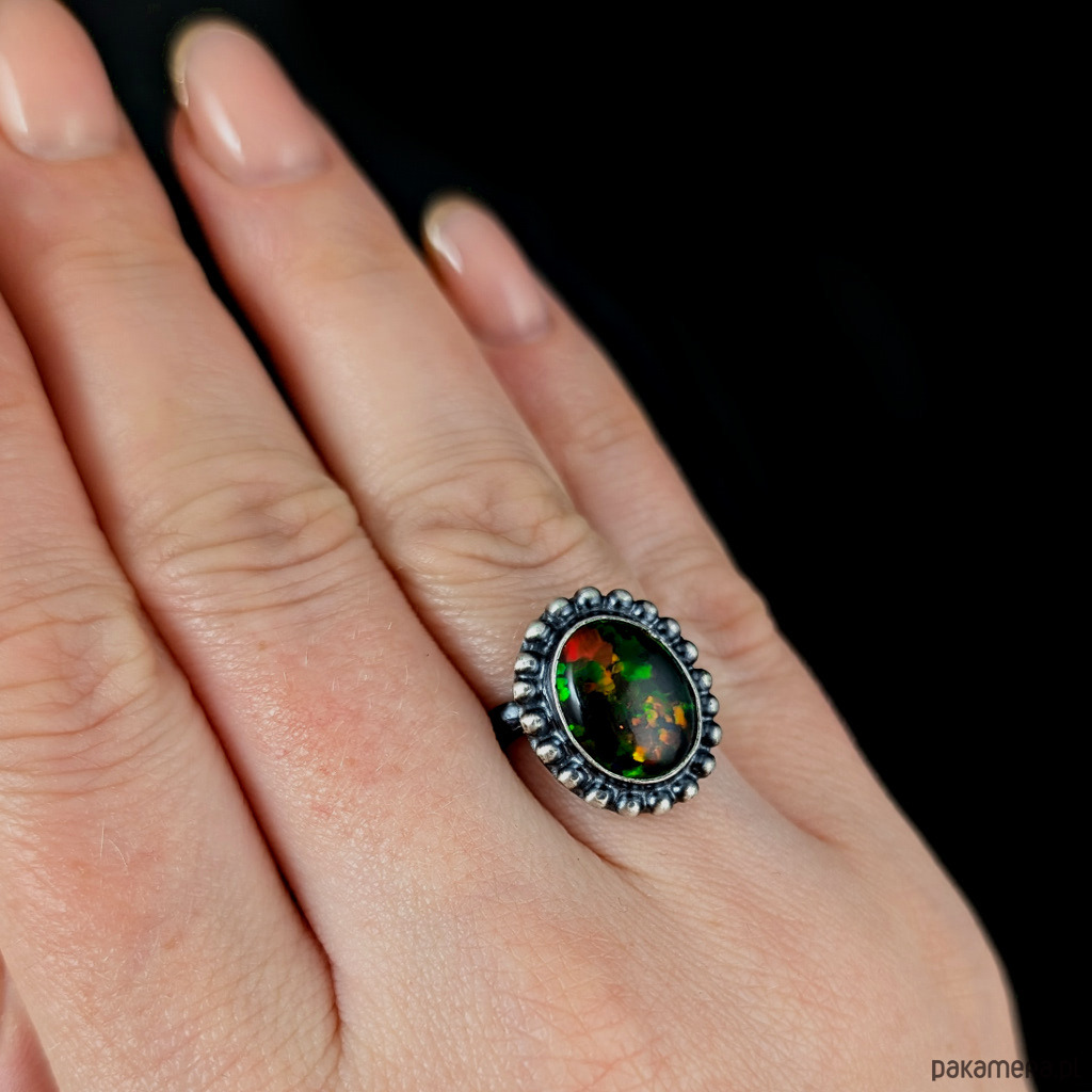 Pierścionek wykonany z oksydowanego srebra próby 925. Rozmiar pierścionka dzięki otwartej podstawie regulowany, mogę dopasować na dowolny rozmiar w zakresie 9-23, proszę napisać na jaki ustawić. Ozdobą pierścionka jest zjawiskowy czarny opal z Etiopii. Wymiary oprawy kamienia 19 x 15 mm, szerokość maksymalna obrączki mm, min. 4 mm. Waga 6,6 g. Pierścień zostanie zapakowany w ozdobne pudełeczko.