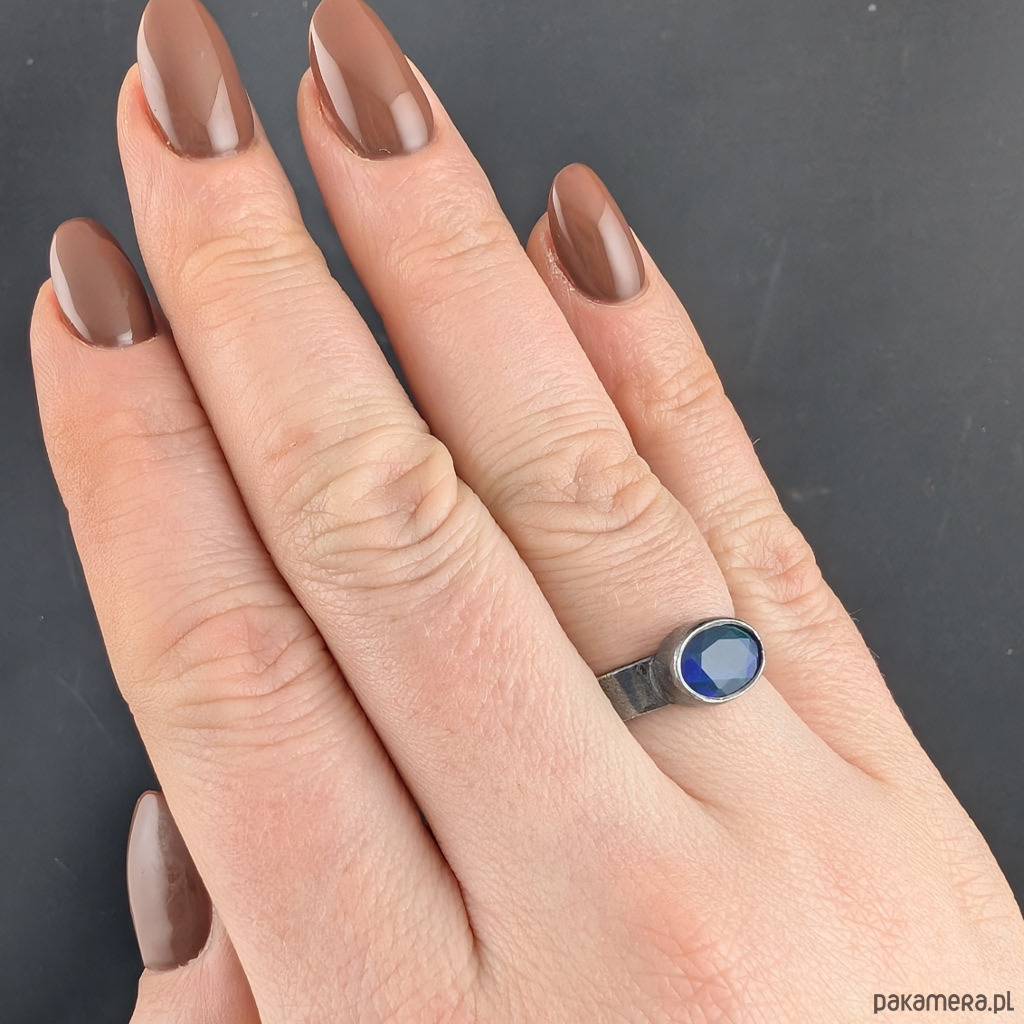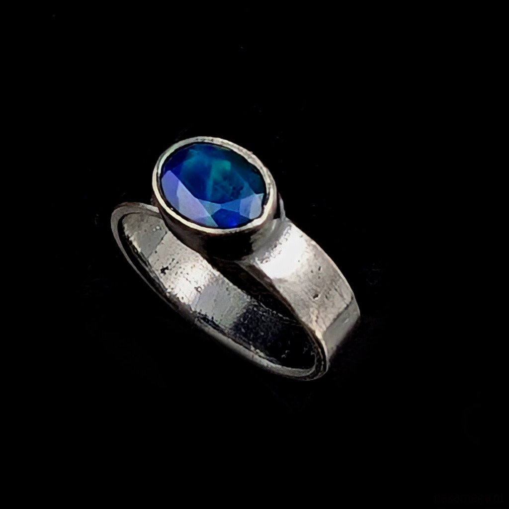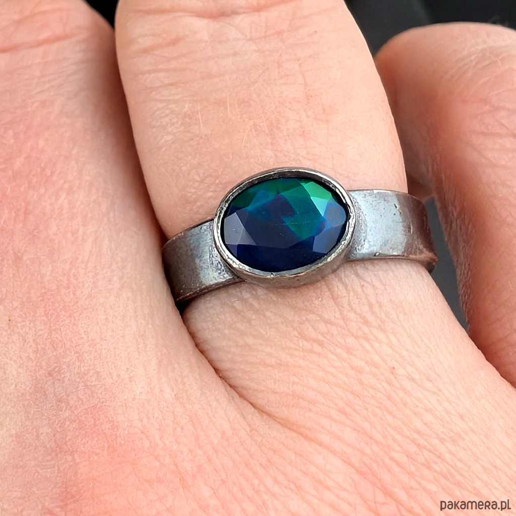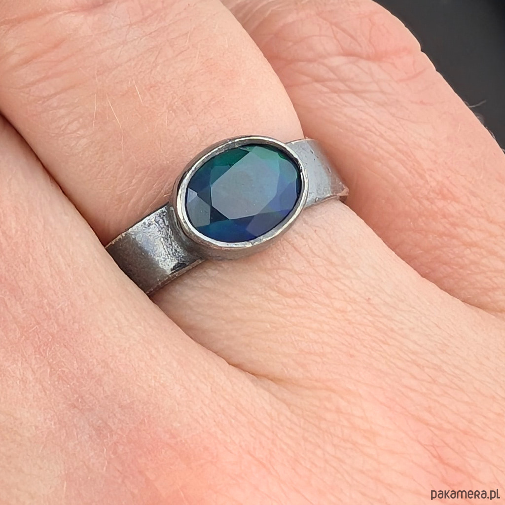 Pierścionek z przepięknym czarnym opalem etiopskim oprawionym w oksydowane srebro 925. Rozmiar jubilerski 14, moge powiększyć na max 15. Możliwe wykonanie podobnego. Obrączka ma 5 mm szerokości. Oprawa kamienia 9 x 7 mm. Waga 4,23 g.