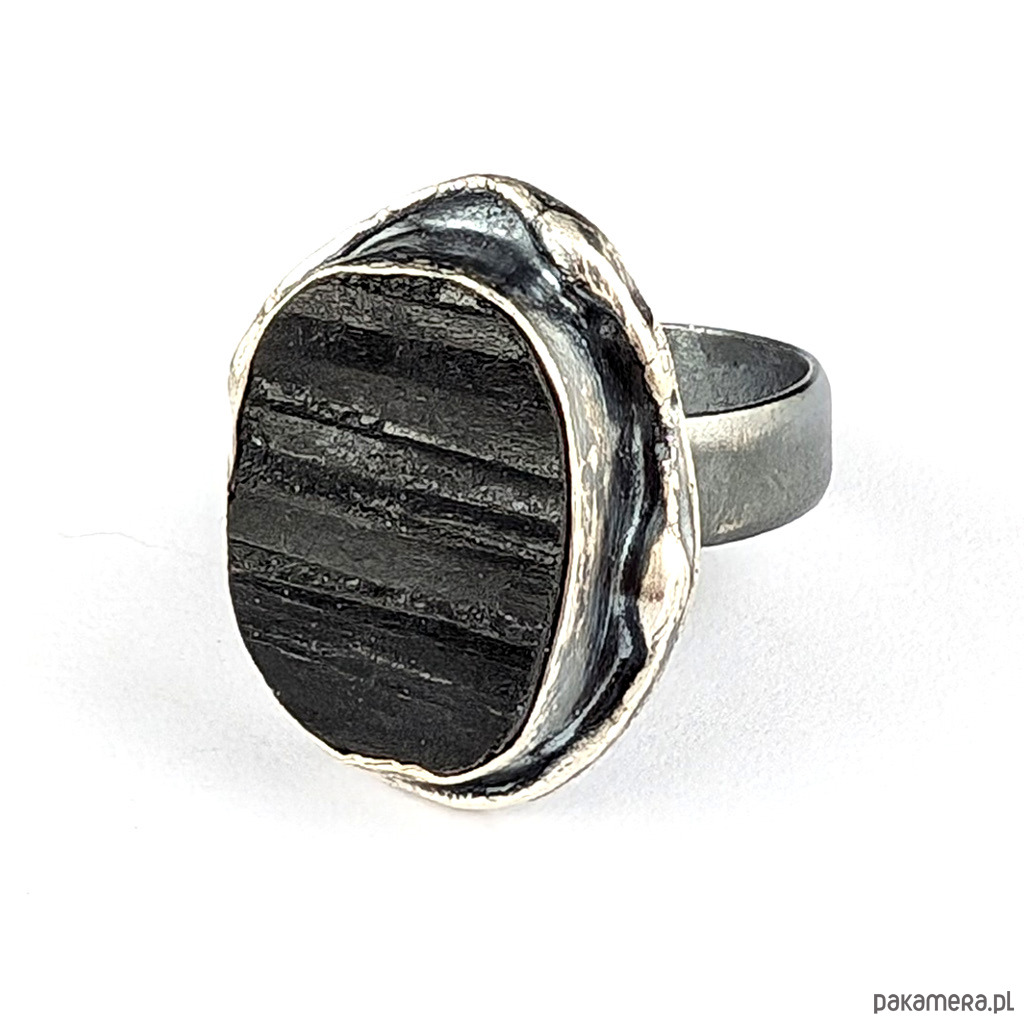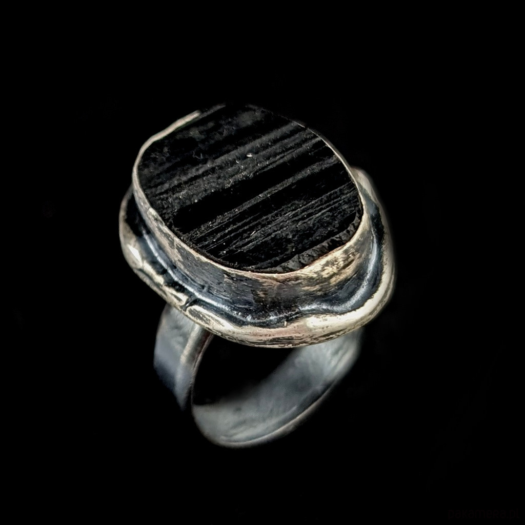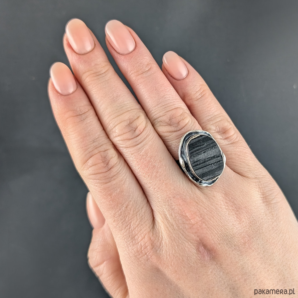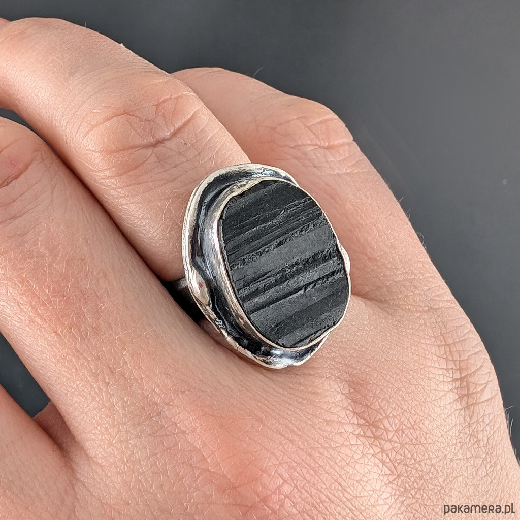 Pierścień z oprawionym w oksydowane srebro o pr. 925 czarnym turmalinem. Wymiary oprawy kamienia 25 x 18 mm. Szerokość obrączki 5 mm. Rozmiar jubilerski regulowany, mogę dopasować w zakresie 9-24. Pierścień waży 11gramów, zostanie wysłany w ozdobnym pudełeczku.