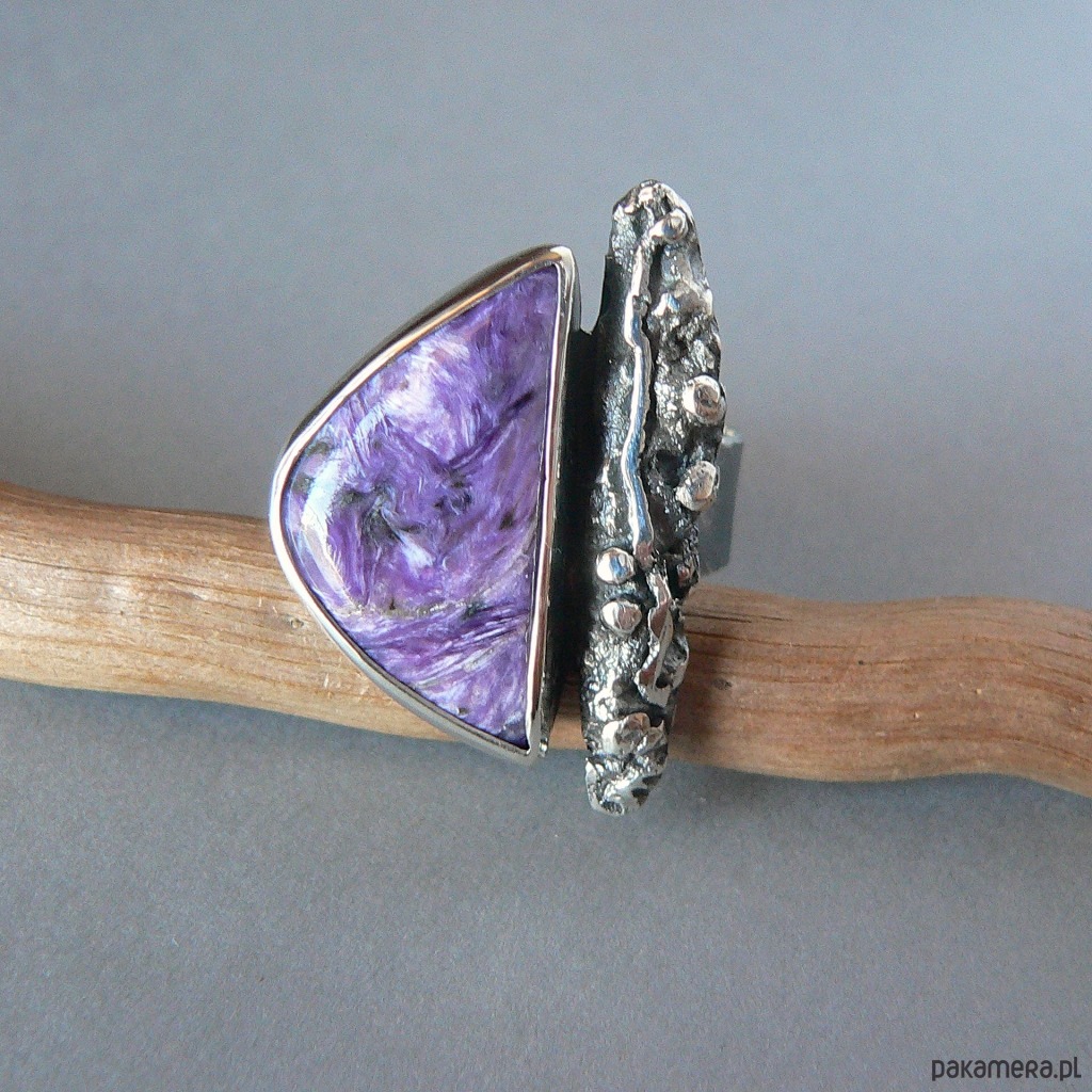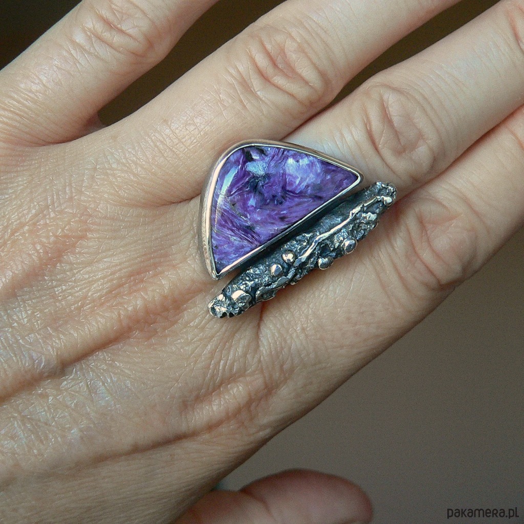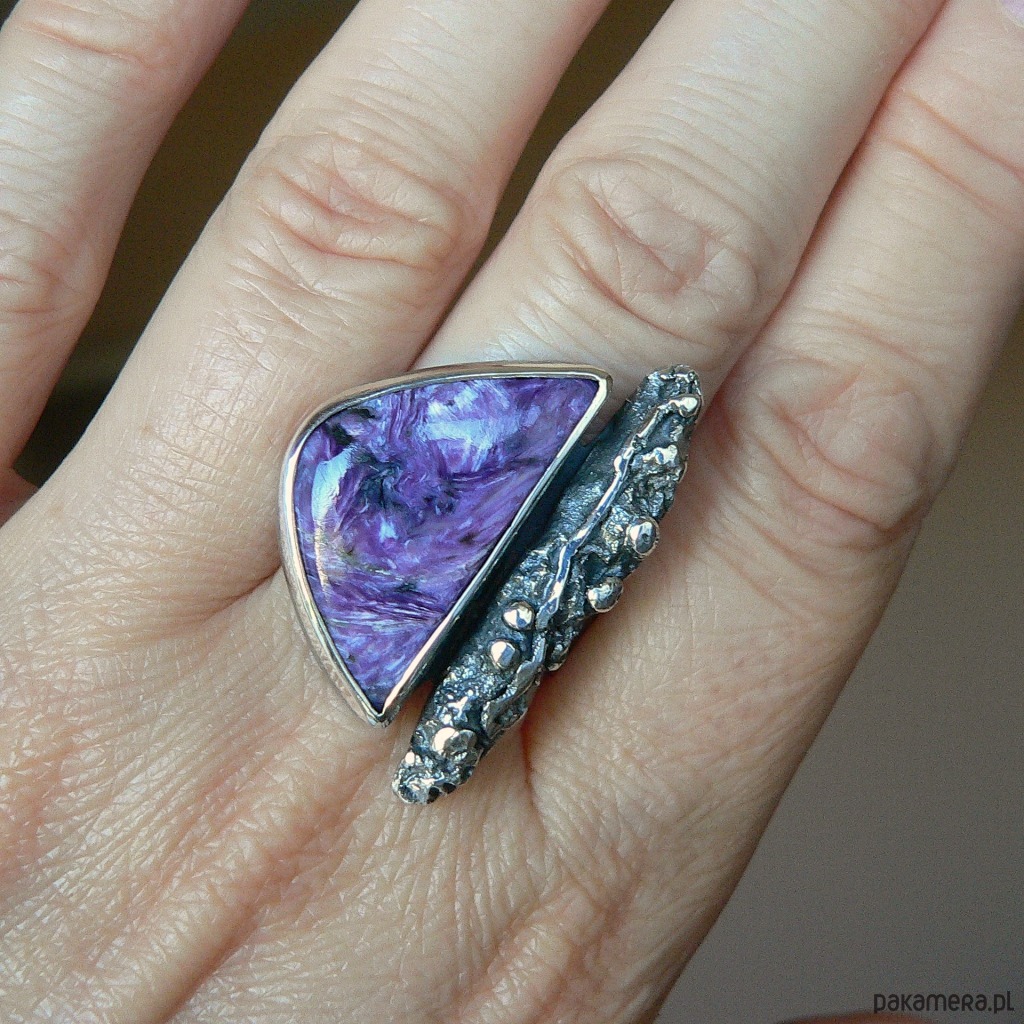 Pierścień wykonany z okazu czaroitu i srebra. Srebro kute, nadtapiane, o surowym charakterze. Całość oksydowana, detale polerowane. Wymiary frontu pierścienia 3,2/3,2 cm, bursztyn- 3,5/2,4 cm Rozmiar regulowany, przy zakupie proszę o podanie noszonego rozmiaru, ustawię obrączkę.