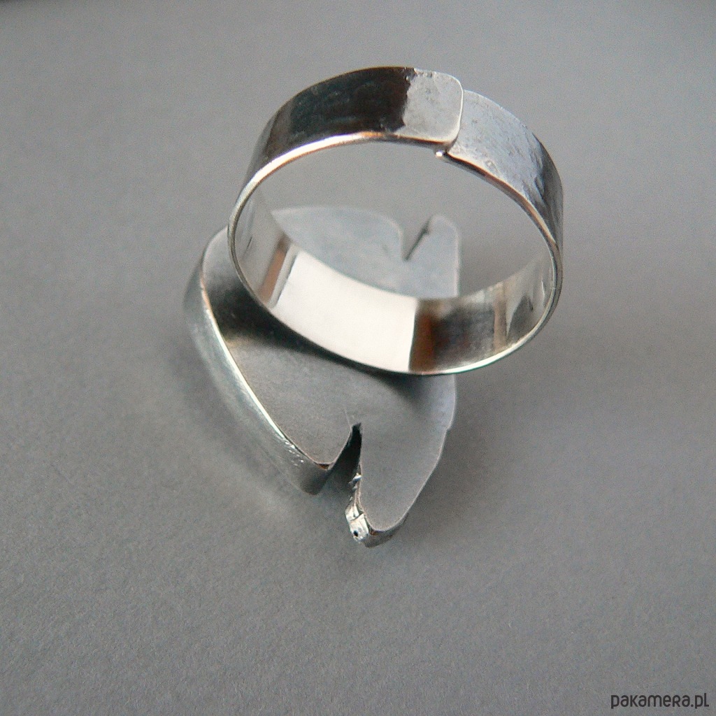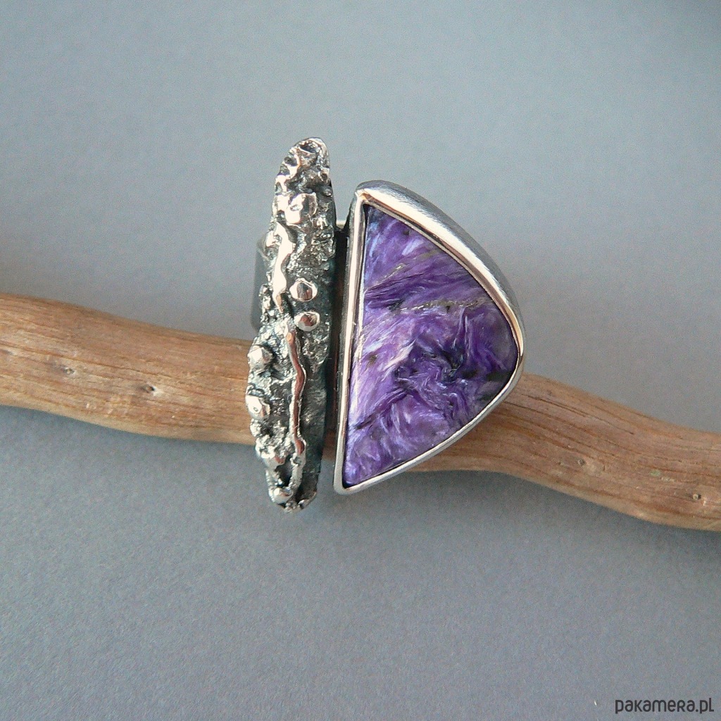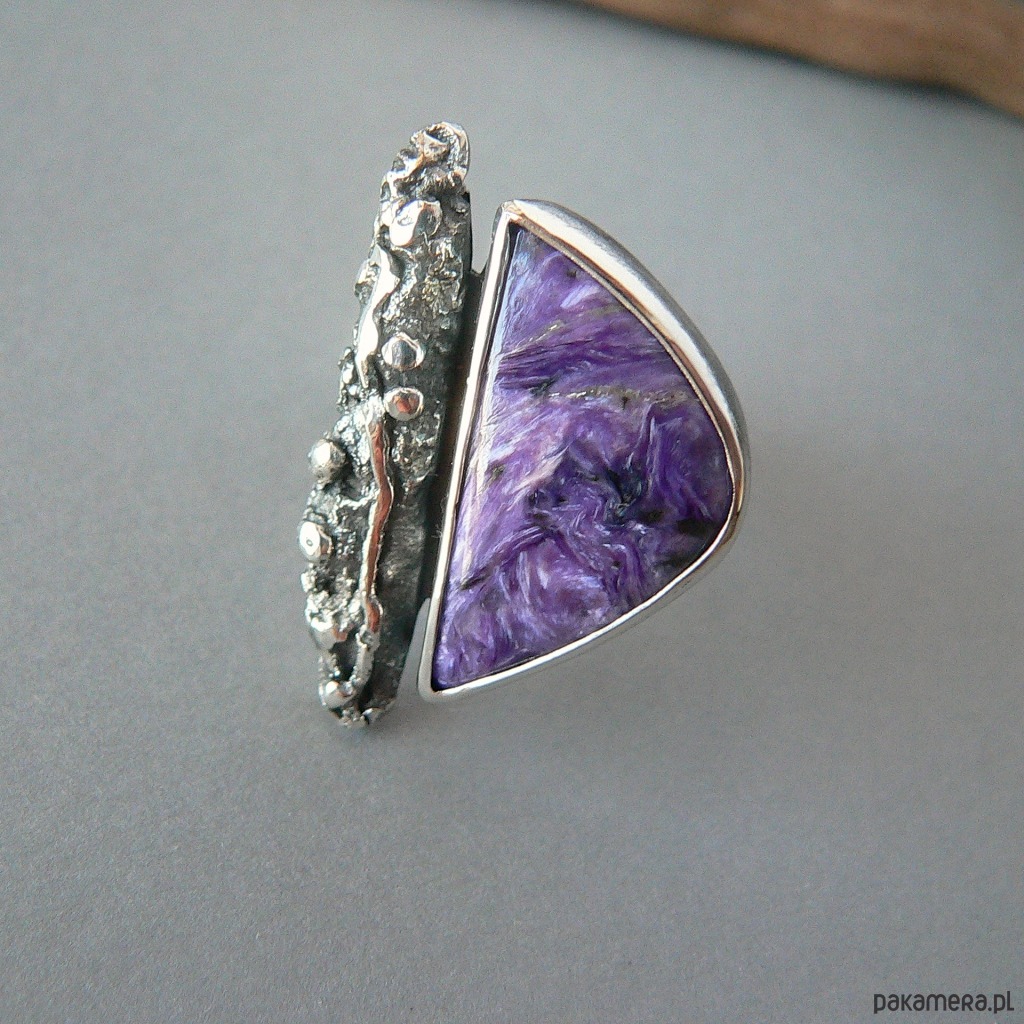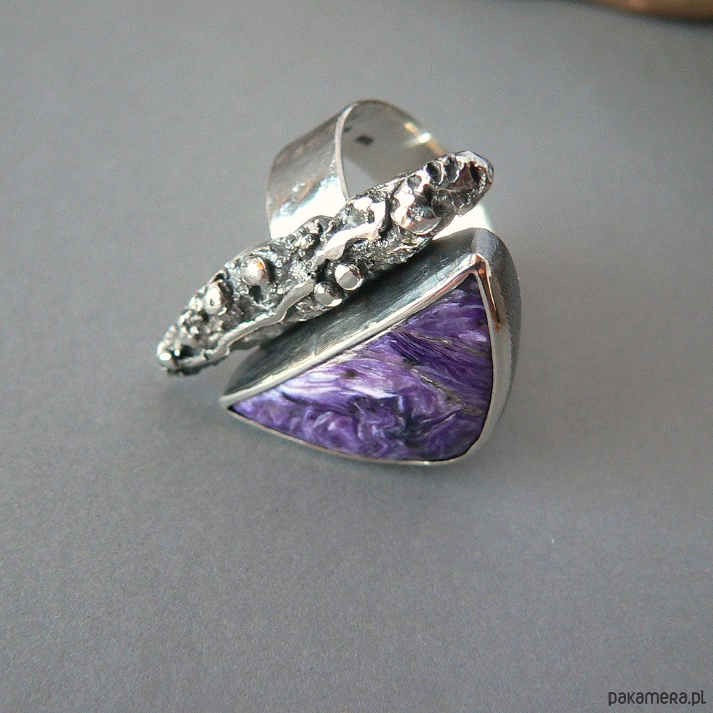Pierścień wykonany z okazu czaroitu i srebra. Srebro kute, nadtapiane, o surowym charakterze. Całość oksydowana, detale polerowane. Wymiary frontu pierścienia 3,2/3,2 cm, bursztyn- 3,5/2,4 cm Rozmiar regulowany, przy zakupie proszę o podanie noszonego rozmiaru, ustawię obrączkę.
