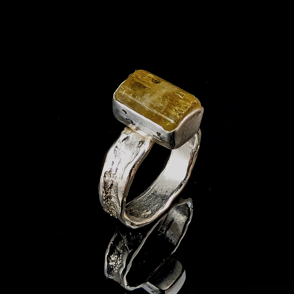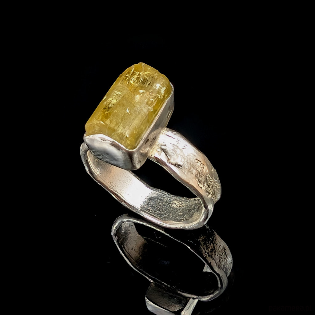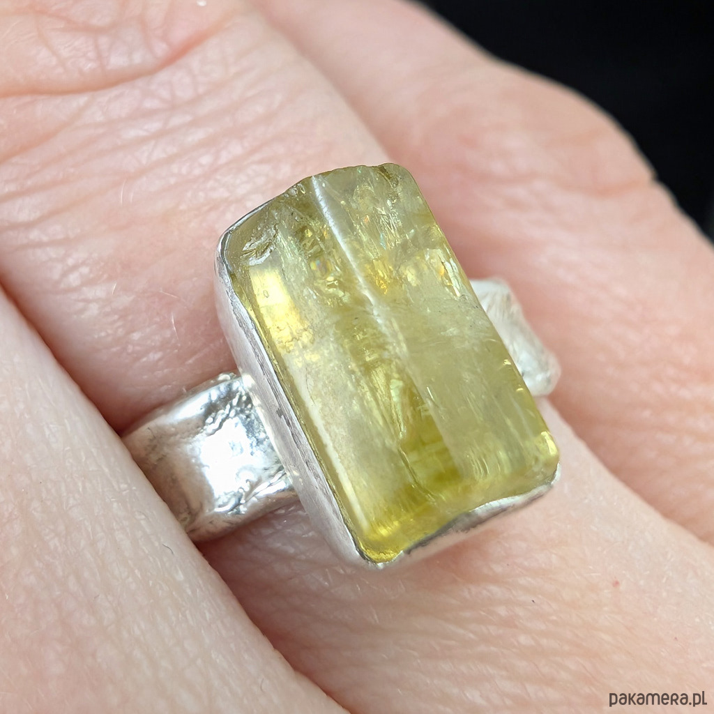 Kobiecy, oryginalny pierścionek wykonany ze srebra pr. 925 oraz świetlistego, pięknego heliodoru. . Ten rzadki kamień to cenna odmiana berylu.