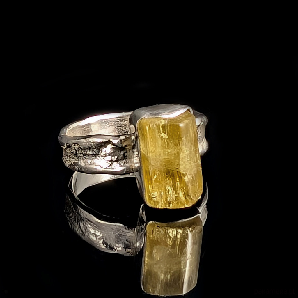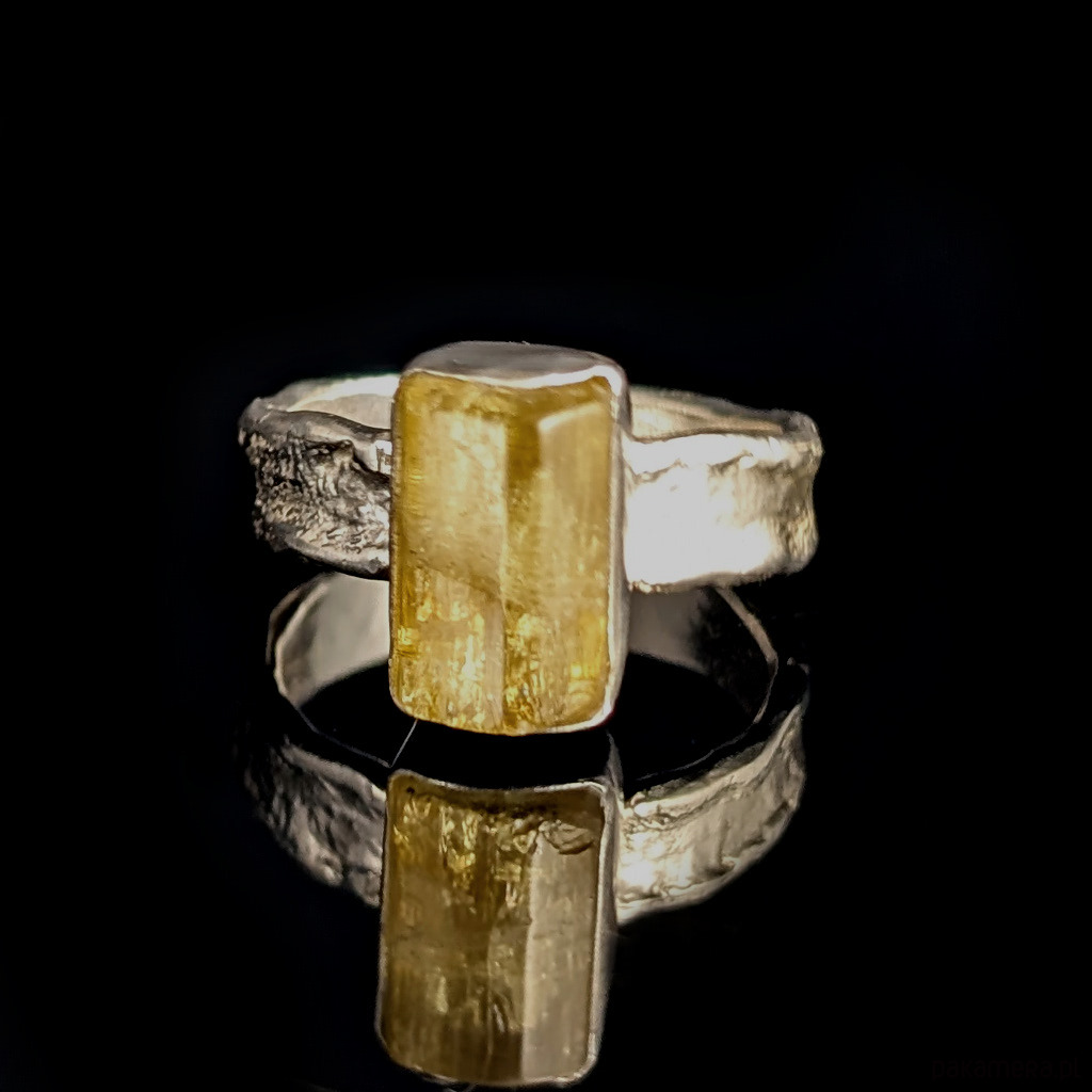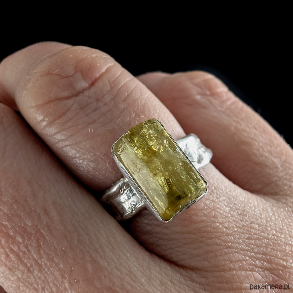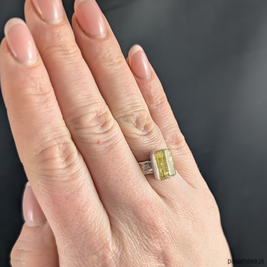 Kobiecy, oryginalny pierścionek wykonany ze srebra pr. 925 oraz świetlistego, pięknego heliodoru. . Ten rzadki kamień to cenna odmiana berylu.