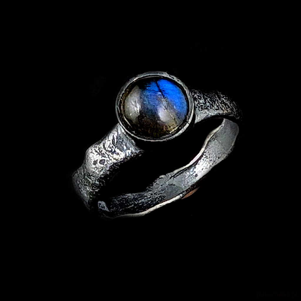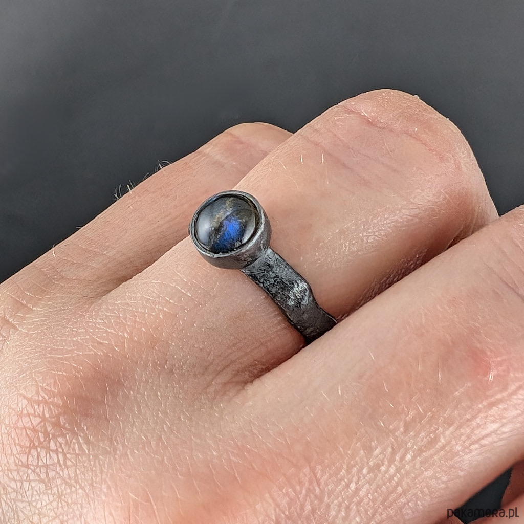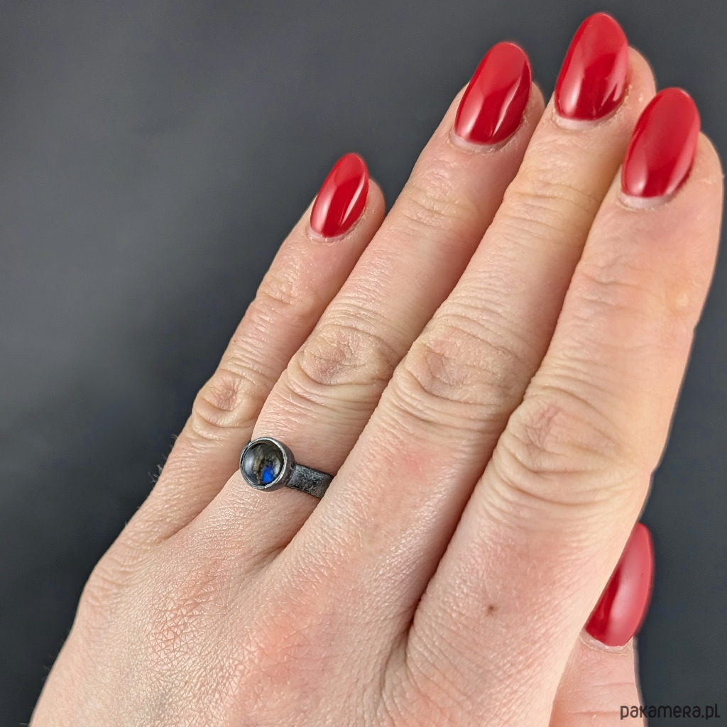 Pierścionek z oprawionym w srebrną,oksydowaną obrączkę granatowym labradorytem. Srebro 925. Oprawa kamienia 7 mm, Waga 3,8 g. Rozmiar jubilerski 14, mogę powiększyć na max. 15 Obrączka ma 4 mm szerokości. Pierścionek wysyłamy w ozdobnym pudełeczku.