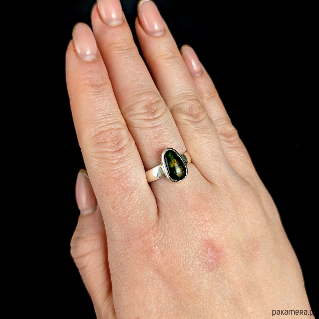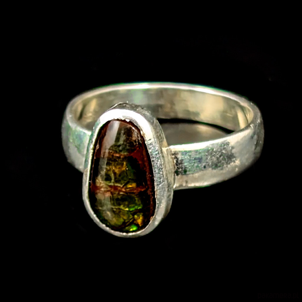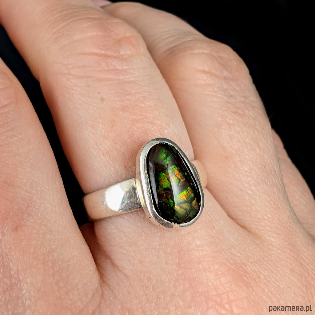 Ammolit oprawiony w srebro próby 925. Wymiary całej oprawy 14 x 9 mm. Rozmiar jubilerski 18, bez możliwości zmiany rozmiaru. Waga pierścionka4,4 grama. Wykonany przez dostawcę kamieni. Pierścień zostanie zapakowany w ozdobne pudełeczko.