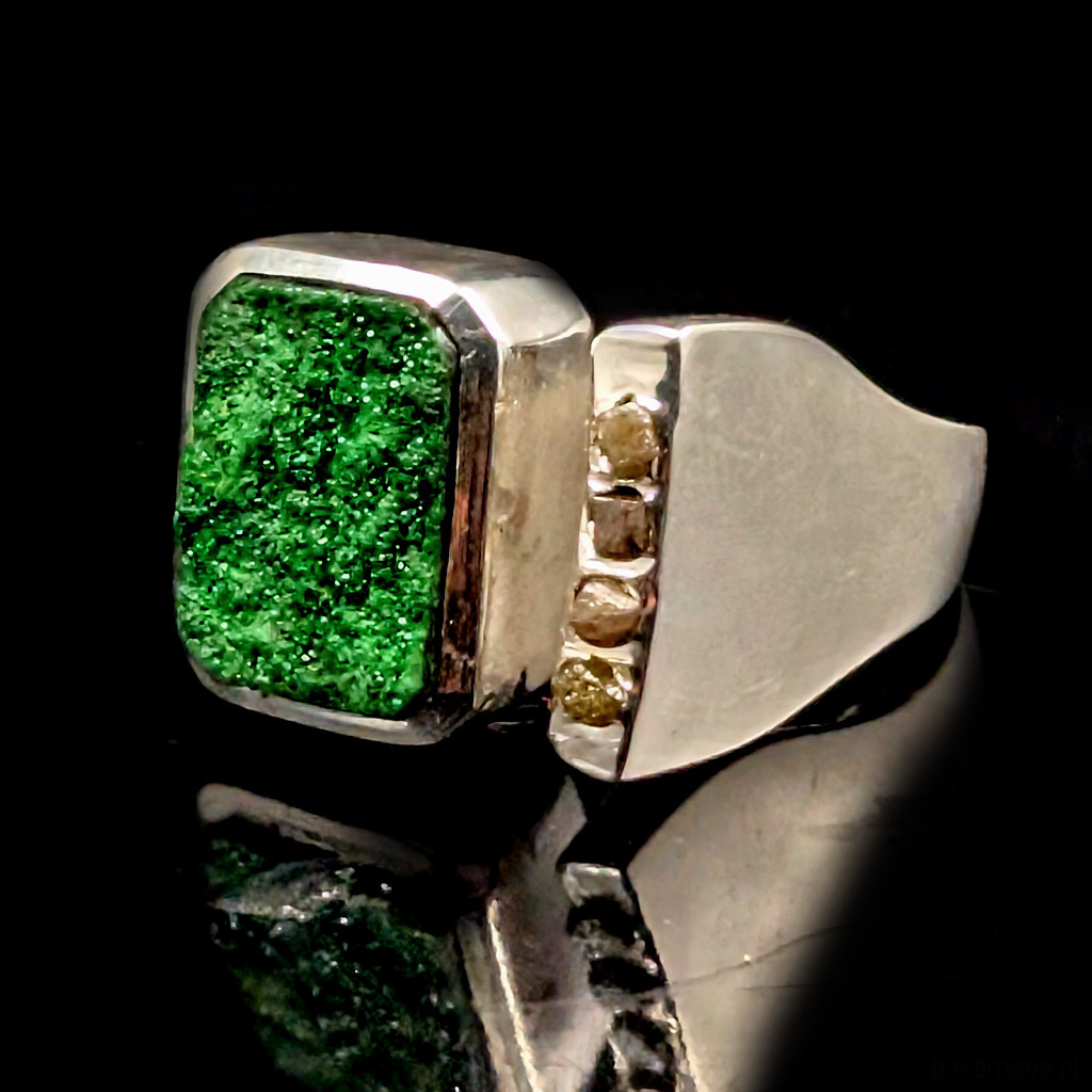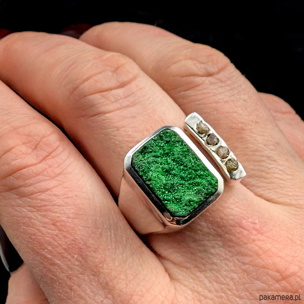 Pierścień z oprawionym w srebro próby 925 pięknym, rzadko spotykanym uwarowitem. Ciekawa, modernistyczna, nowoczesna forma. Szerokość obrączki max 13 mm, min. 3 mm. Kamień ma oprawę 15 x 11 mm. Towarzyszą mu 4 surowe, srebrzyste diamenty.Rozmiar jubilerski regulowany w wąskim zakresie,15-19 proszę napisać na jaki ustawić. Waga 10,42 grama. Wykonany przez dostawcę kamieni. Pierścień zapakowany zostanie w ozdobne pudełeczko.
