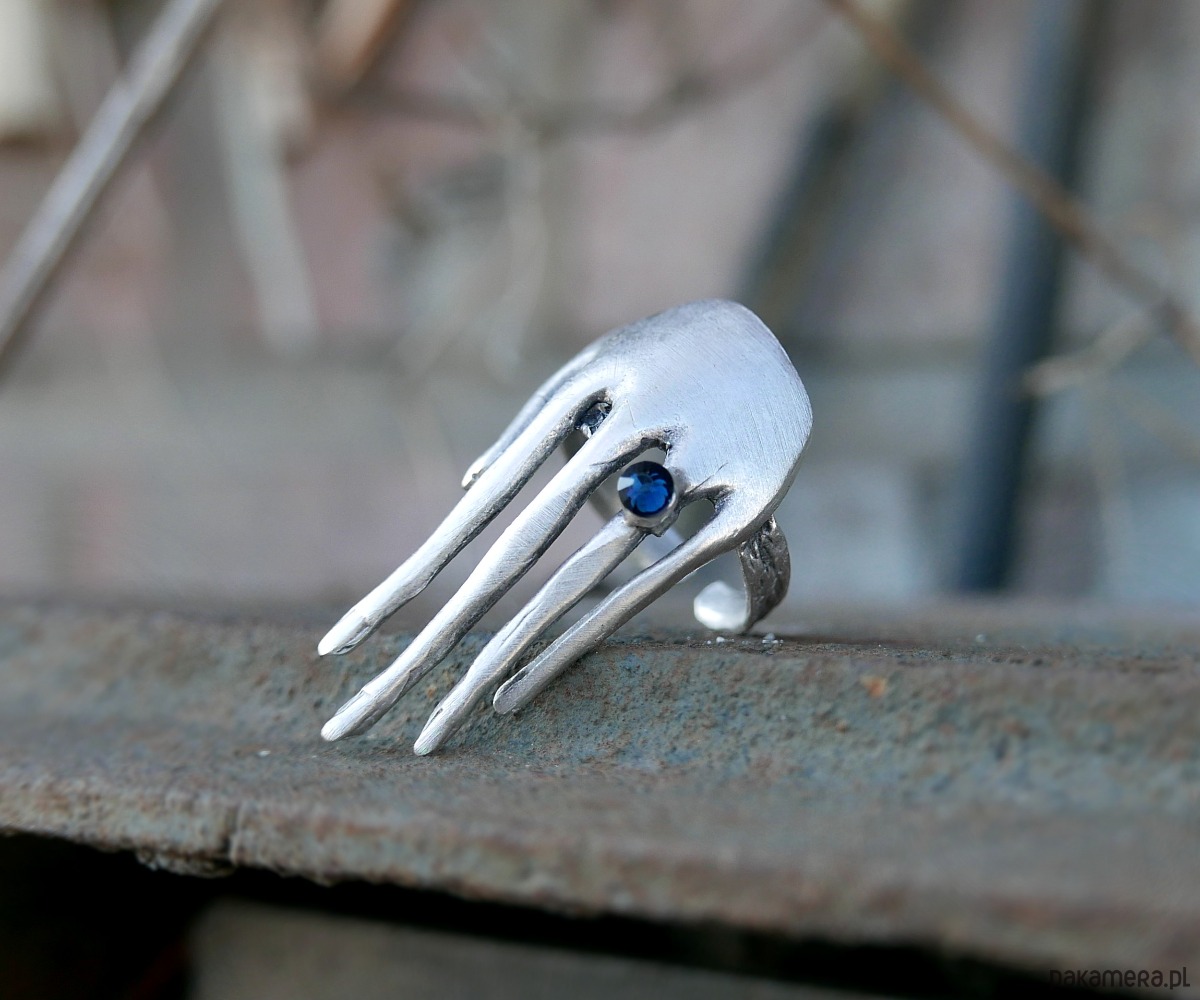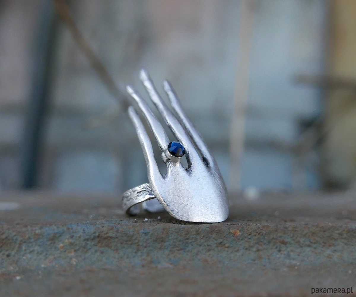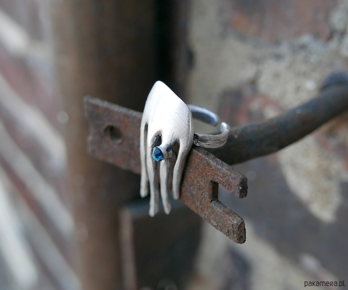 Nietypowy pierścionek z oksydowanego metalu, w kształcie stylizowanej dłoni, ozdobiony kryształkiem Swarovskiego. Jego wyjątkowy design łączy subtelną elegancję z nutą nowoczesnego stylu, tworząc niezrównany, artystyczny efekt. Oksydowane wykończenie dodaje mu tajemniczości, a kryształek przyciąga wzrok swoim blaskiem.