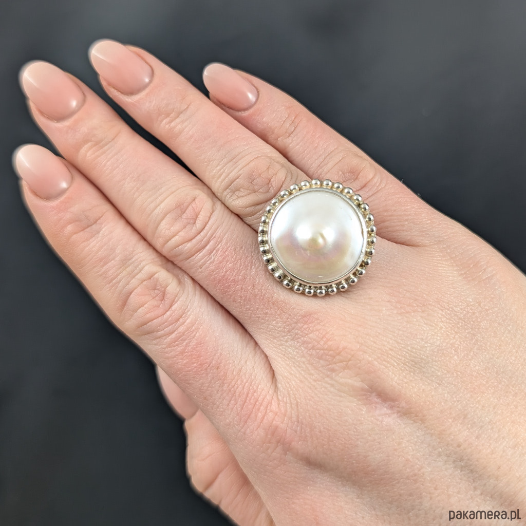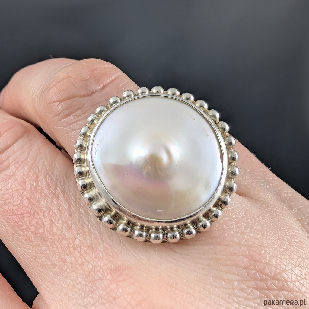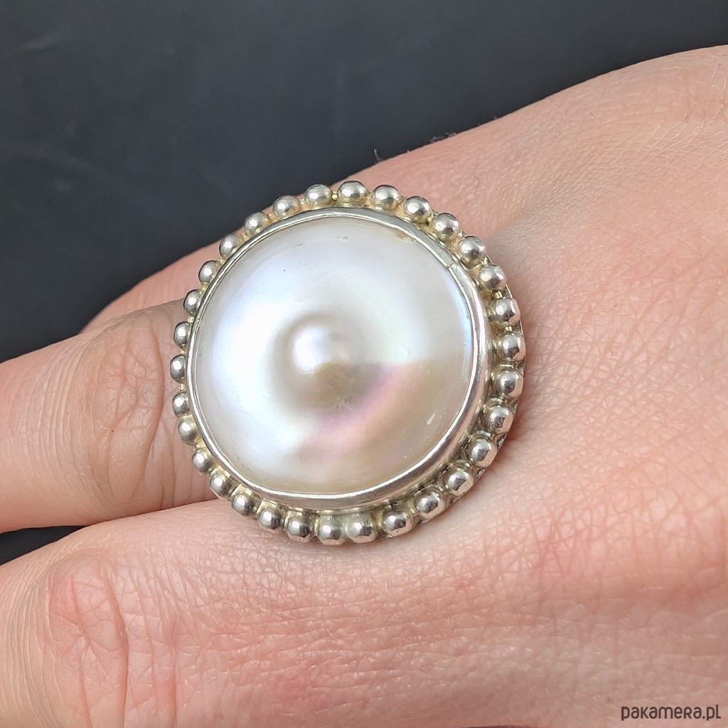 Pierścień wykonany ze srebra próby 925 z wkomponowaną naturalną słodkowodną perłą. Ponadczasowa elegancja, klasyka z nutą awangardy. Średnica 26 mm, waga pierścienia 13 g. Rozmiar jubilerski 15, mogę powiększyc na max 16. Szerokość obrączki to 5 mm Polecam, piękna, ponadczasowa biżuteria na pokolenia.