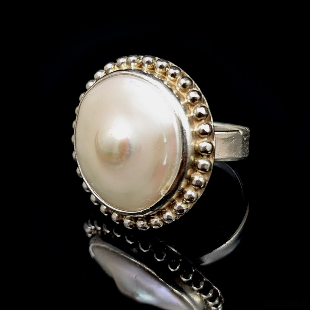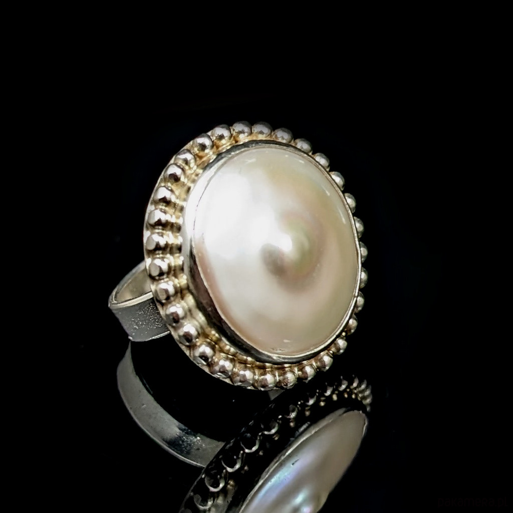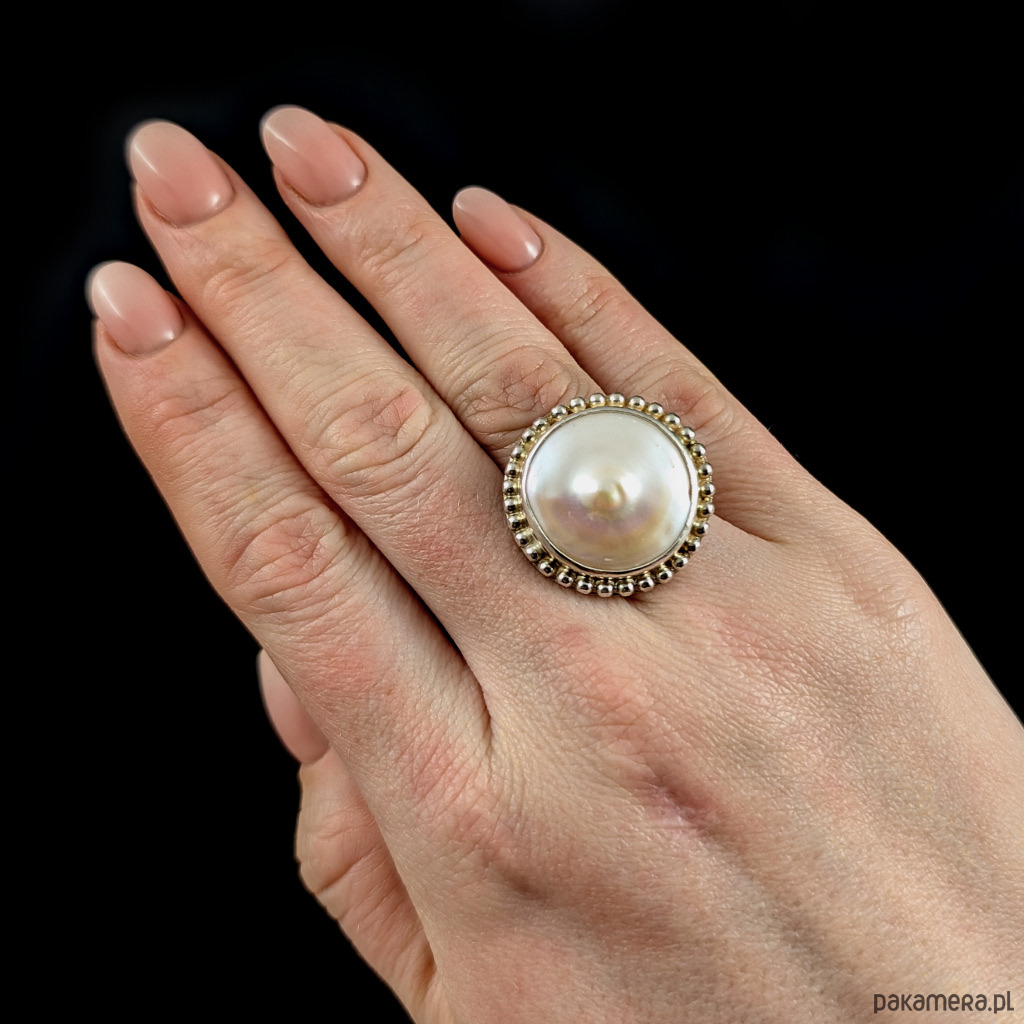 Pierścień wykonany ze srebra próby 925 z wkomponowaną naturalną słodkowodną perłą. Ponadczasowa elegancja, klasyka z nutą awangardy. Średnica 26 mm, waga pierścienia 13 g. Rozmiar jubilerski 15, mogę powiększyc na max 16. Szerokość obrączki to 5 mm Polecam, piękna, ponadczasowa biżuteria na pokolenia.