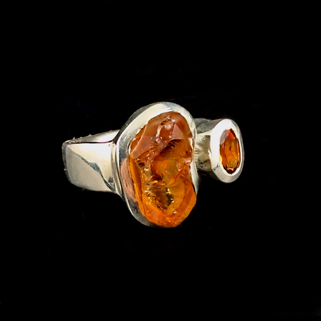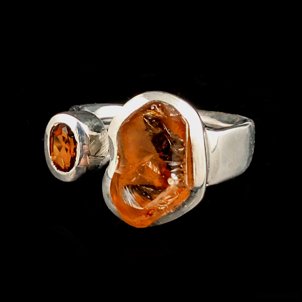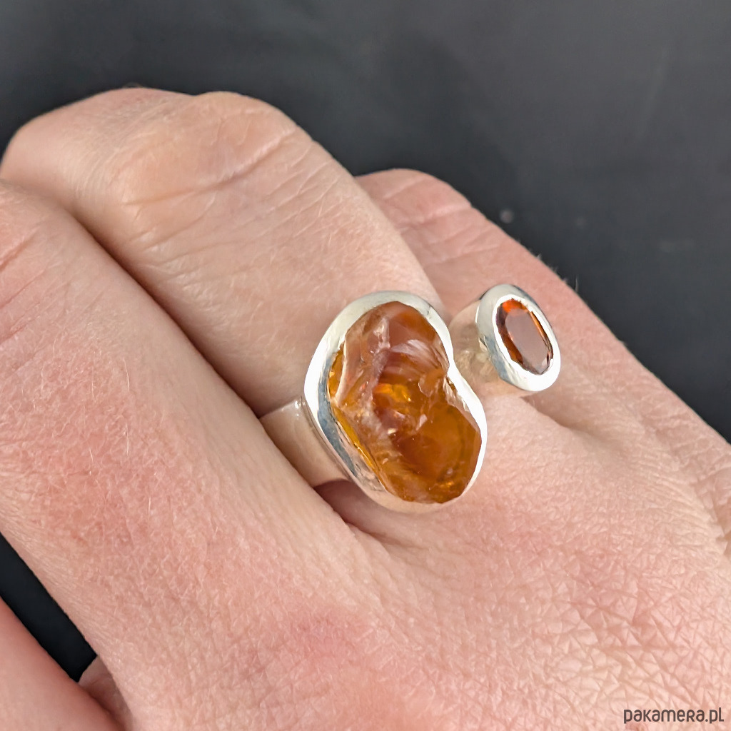 Pierścień z oprawionymi w srebro próby 925 pięknymi cytrynami- surowy oraz fasetowany. Szerokość obrączki max 5 mm min. 2 mm. Oprawa kamieni 15 x 11 mm oraz 8 x 5 mm. Rozmiar jubilerski regulowany w wąskim zakresie,13-16 proszę napisać na jaki ustawić. Waga 9 gramów. Wykonany przez dostawcę kamieni. Pierścień zapakowany zostanie w ozdobne pudełeczko.
