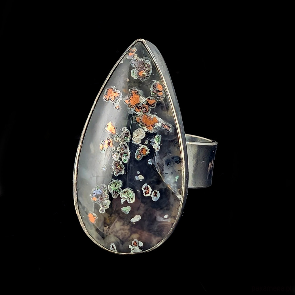 Elegancki i tajemniczy pierścień z pięknym, dostojnym kwarcem z wrostami miedzi z Indonezji. Kamień oprawiony woksydowane srebro pr. 925. Rozmiar pierścionka 18, mogę powiększyc na max 19. Wymiary oprawy 30 x 17 mm,, waga 9,7 g, obrączka szer. 6 mm. Pierścień będzie zapakowany w ozdobne pudełeczko.