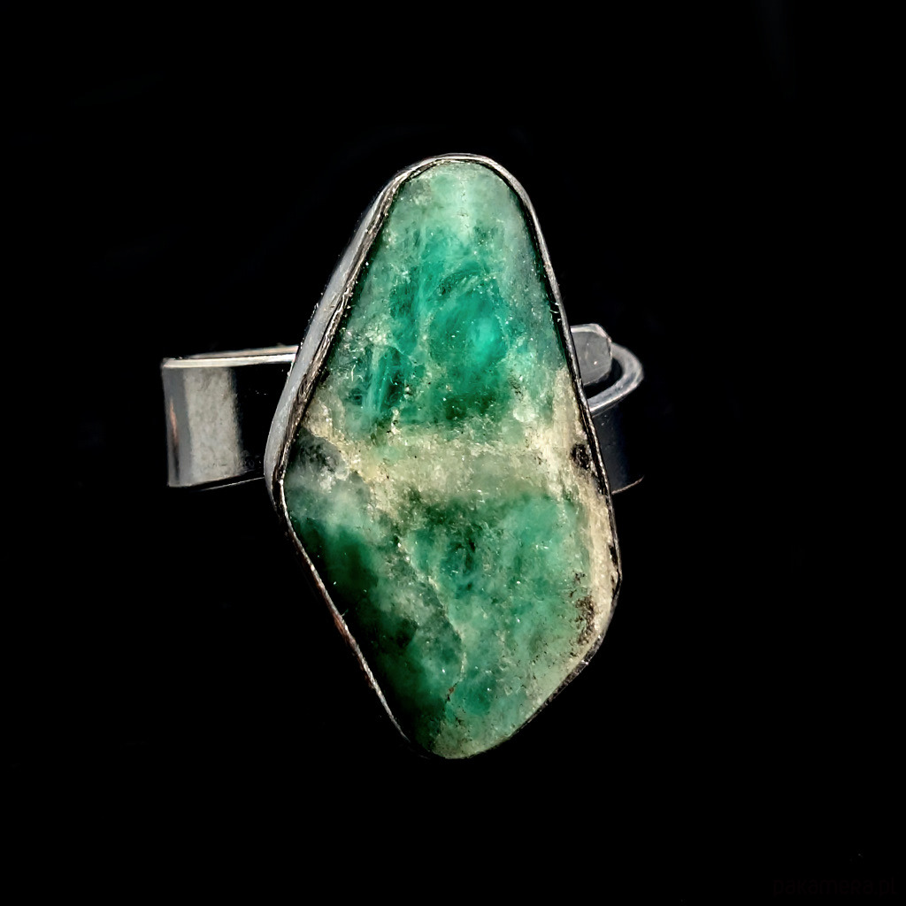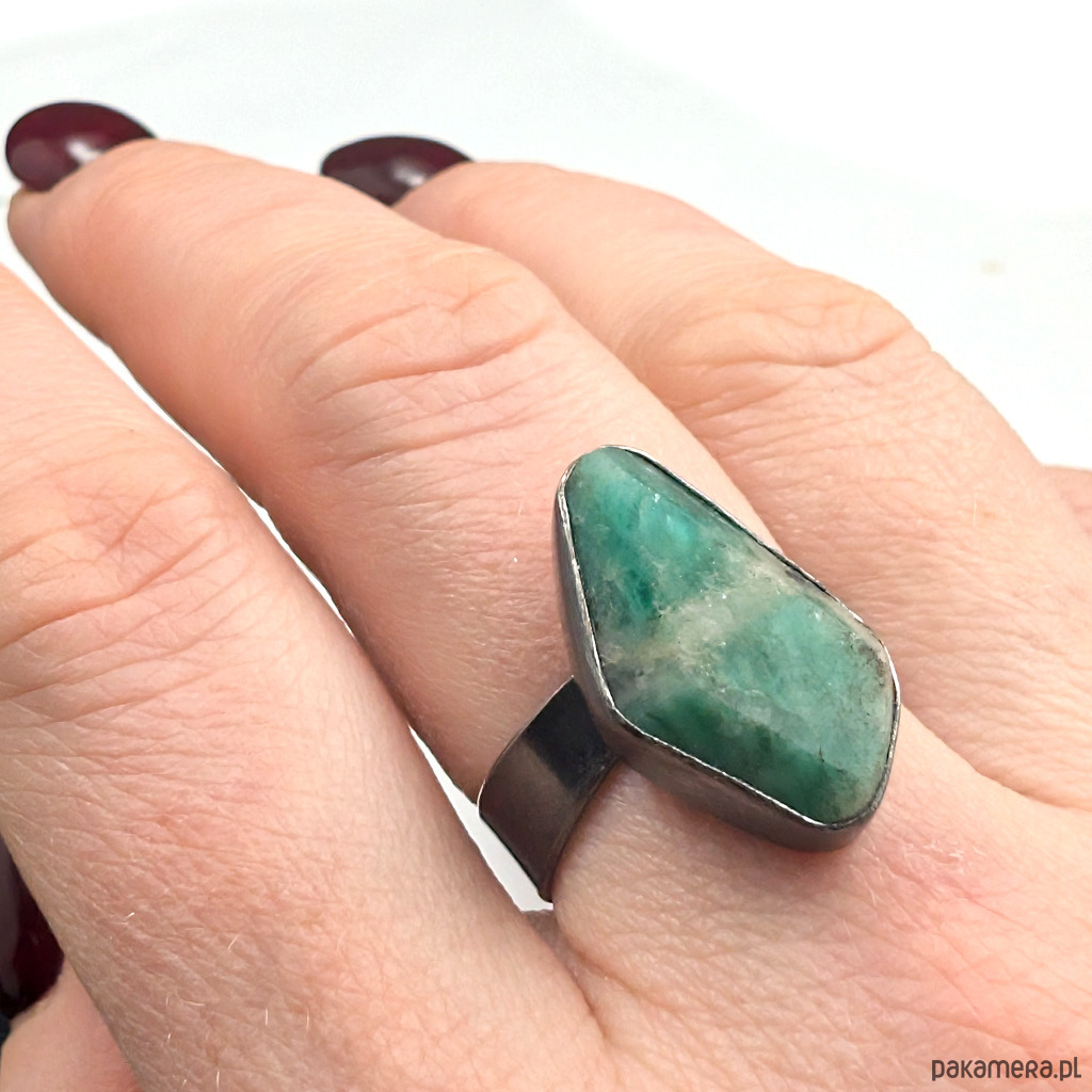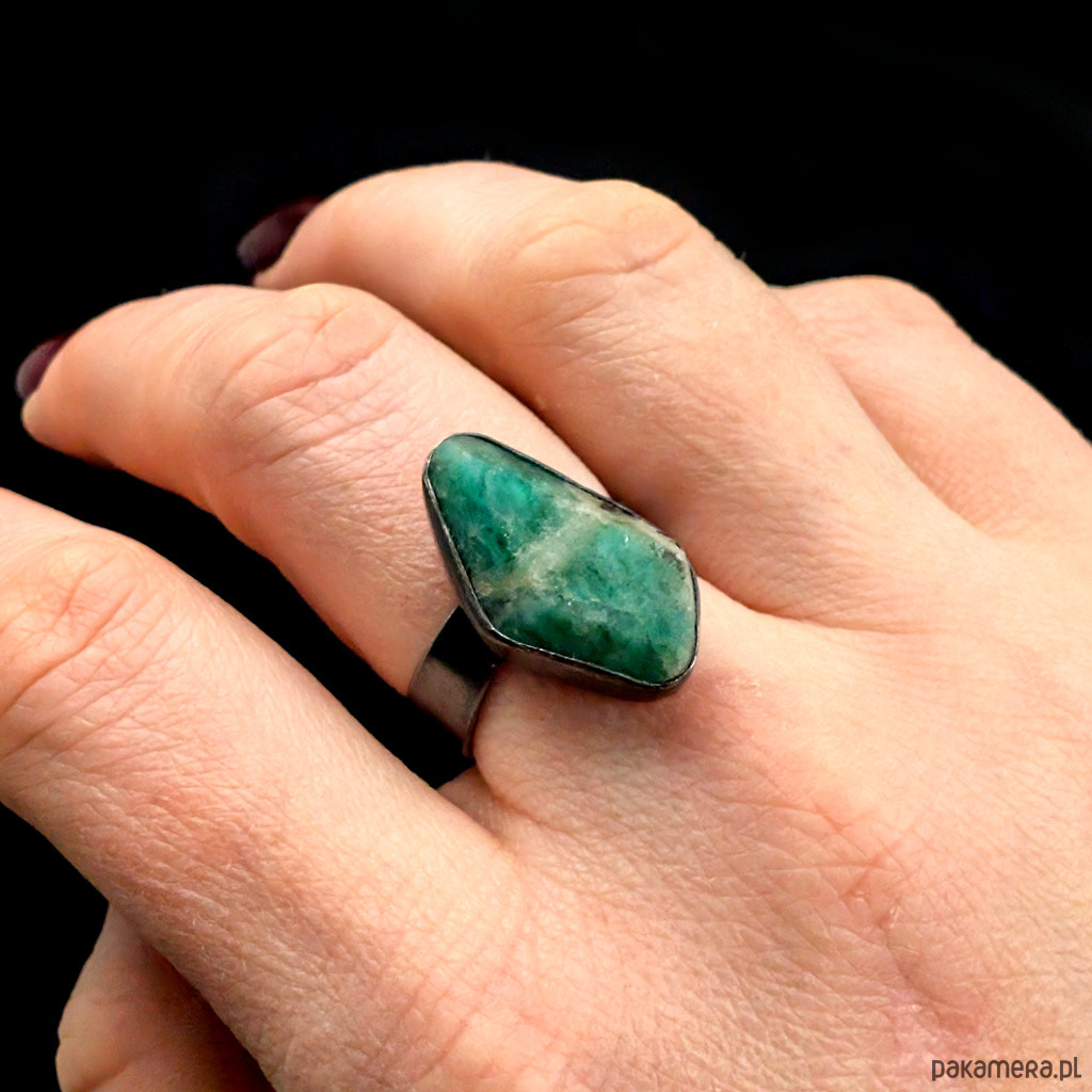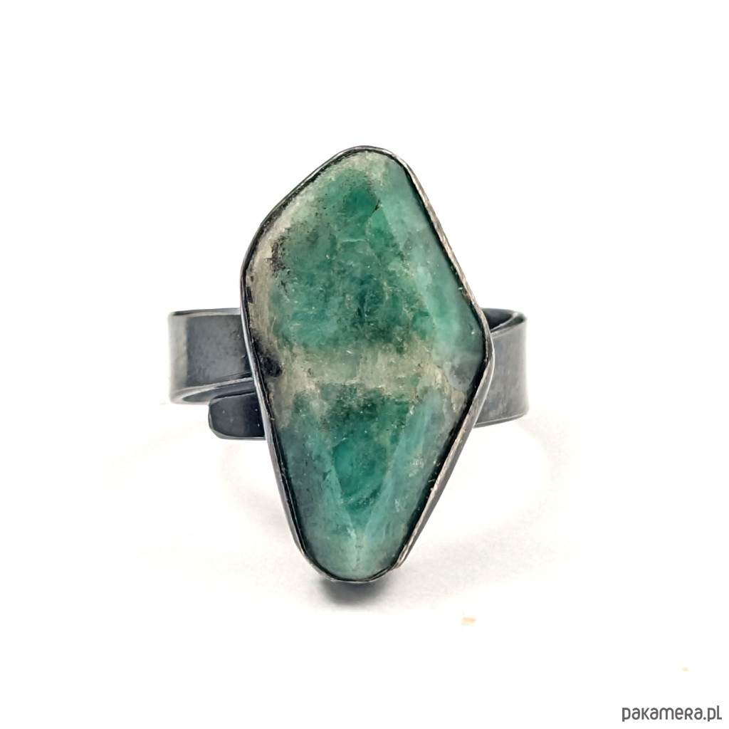 Pierścień z przepięknym, surowym szmaragdem oprawionym w klasyczną ramę srebra próby 925. Oksydowane. Wymiary oprawy 27 x 12 mm. Waga 6,1 g. Rozmiar jubilerski regulowany w szerokim zakresie, proszę napisać na jaki dopasować