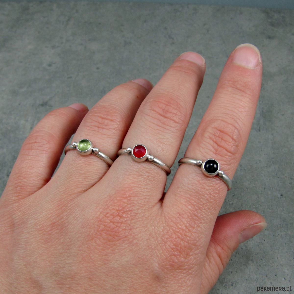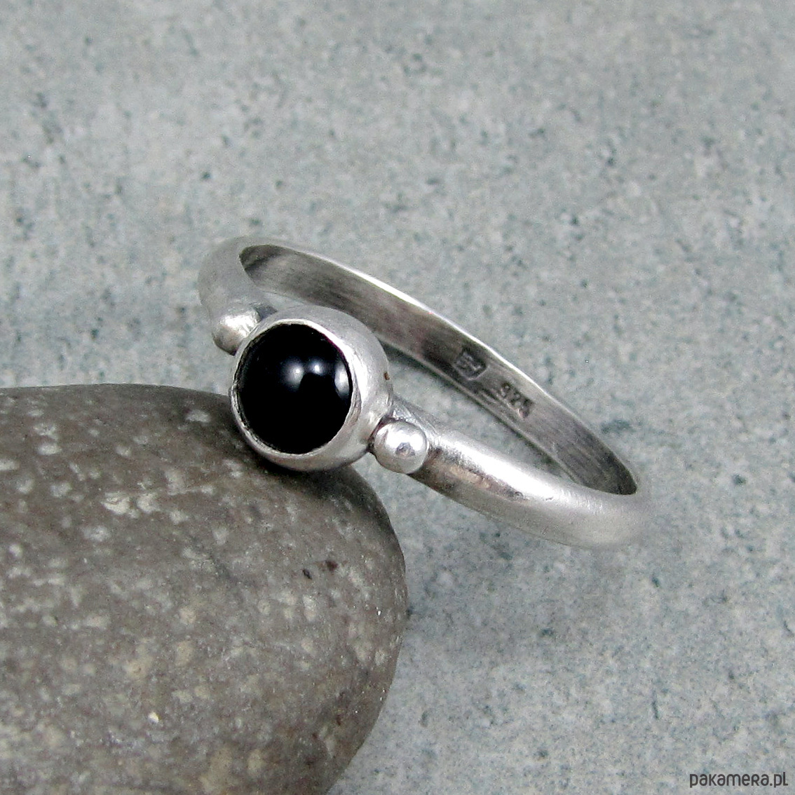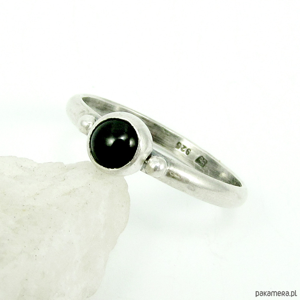 Delikatny pierścionek z drobnym kamykiem i srebrnymi kuleczkami po jego obu stronach. Wykonałam go z oksydowanego srebra próby 925 oraz oczka diopsydu gwiaździstego, w którym można dojrzeć czteroramienną gwiazdę, gdy na kamień pada ostre światło. Kamień ma ok. 5 mm średnicy, a obrączka ok. 2,5 mm szerokości. Rozmiar jubilerski pierścionka to 17,5. Biżuterię wysyłam zapakowaną w eleganckie pudełeczko.