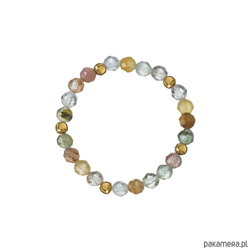 Elastyczny pierścionek z agatem odmiany botswana oraz dodatkiem drobnych pozłacanych kulek wykonanych ze srebra próby 925.