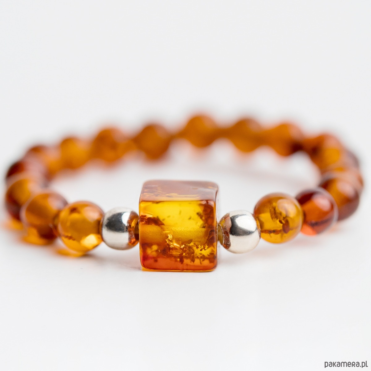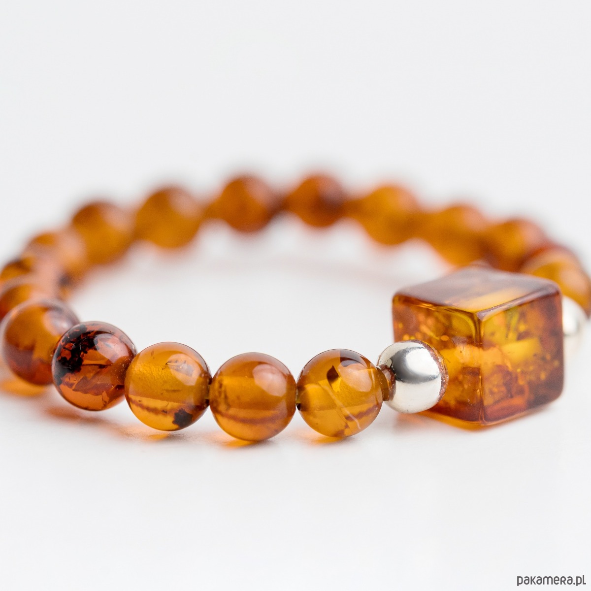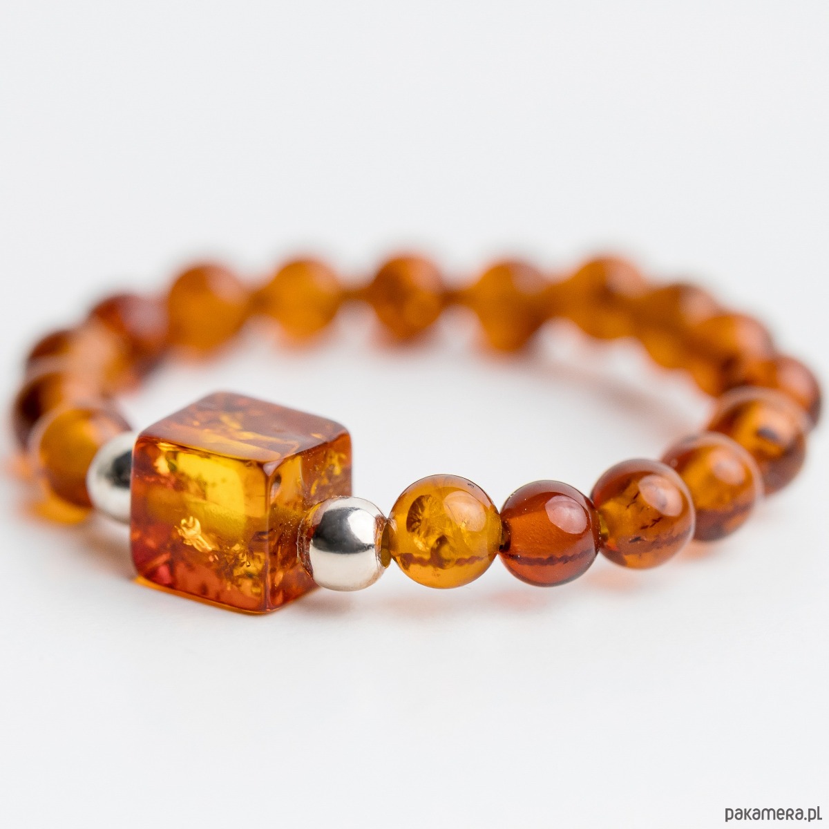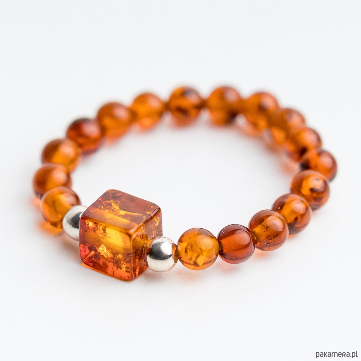 Delikatny i pełen naturalnego blasku pierścionek wykonany z prawdziwego bałtyckiego bursztynu w klasycznym, koniakowym odcieniu. Centralny element stanowi większa, kwadratowa kostka bursztynowa, otoczona idealnie gładkimi, transparentnymi koralikami. Całość uzupełniona została metalicznymi akcentami wykonanymi ze srebra, które podkreślają elegancki charakter biżuterii.