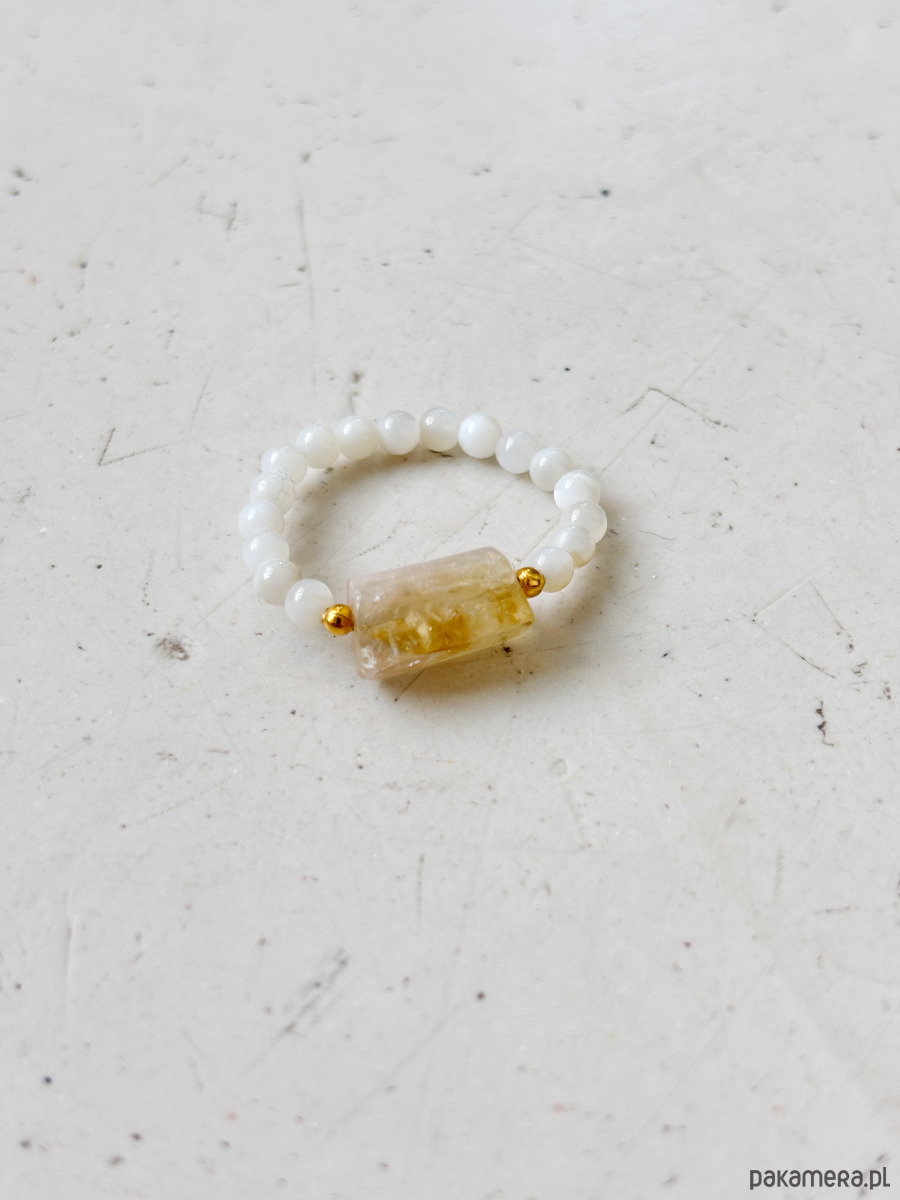 Pierścionek wykonany jest na gumce jubilerskiej z użyciem cytrynu, kamienia księżycowego i przekładek pozłacanych.