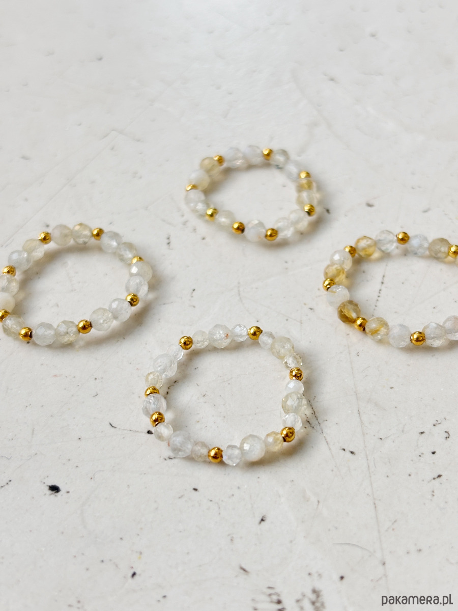 Pierścionek wykonany jest na gumce jubilerskiej z użyciem cytrynu fasetowanego i przekładek pozłacanych.