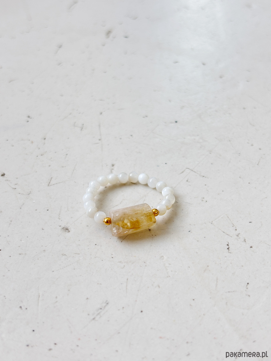 Pierścionek wykonany jest na gumce jubilerskiej z użyciem cytrynu, kamienia księżycowego i przekładek pozłacanych.