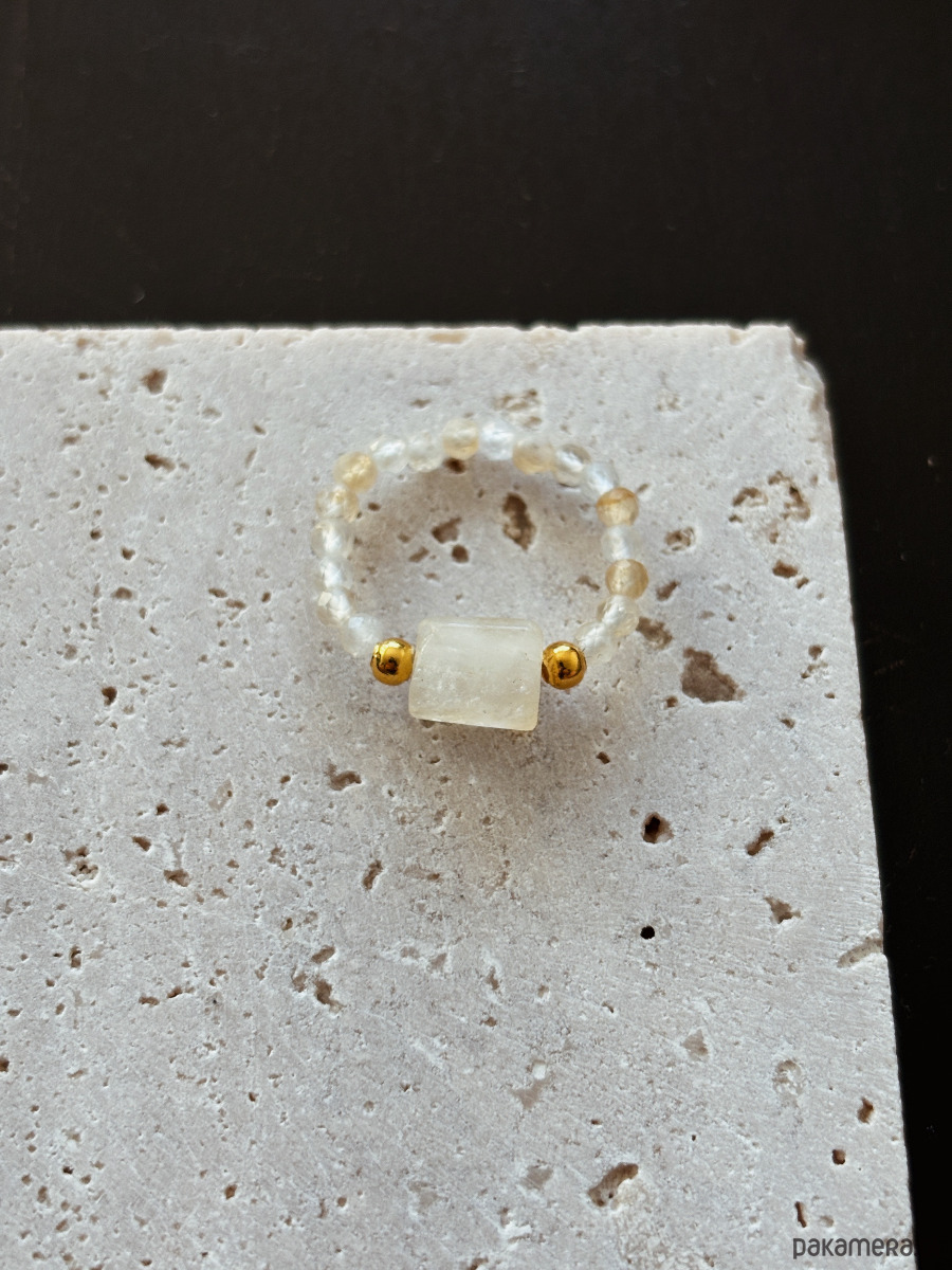 Pierścionek wykonany jest na gumce jubilerskiej z użyciem cytrynu i przekładek pozłacanych.