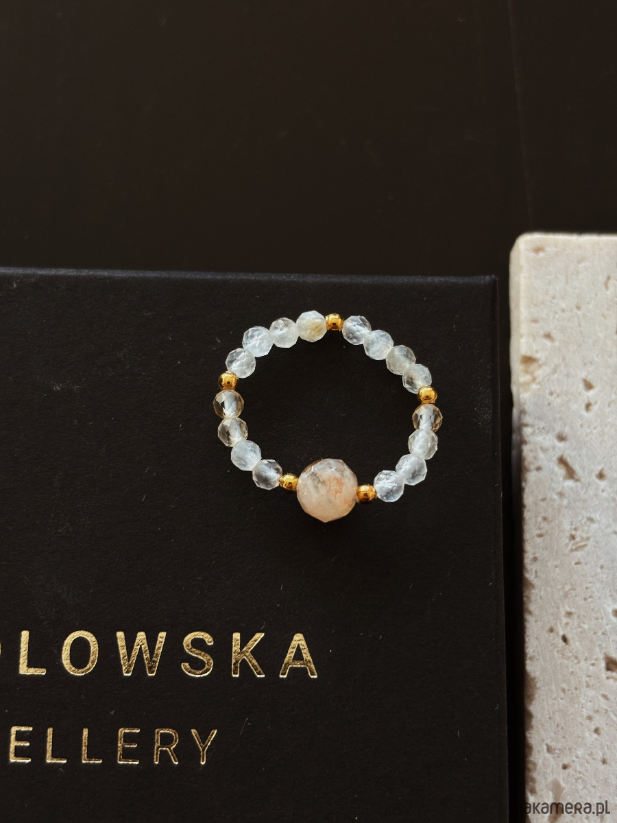 Pierścionek wykonany jest na gumce jubilerskiej z użyciem cytrynu i przekładek pozłacanych.