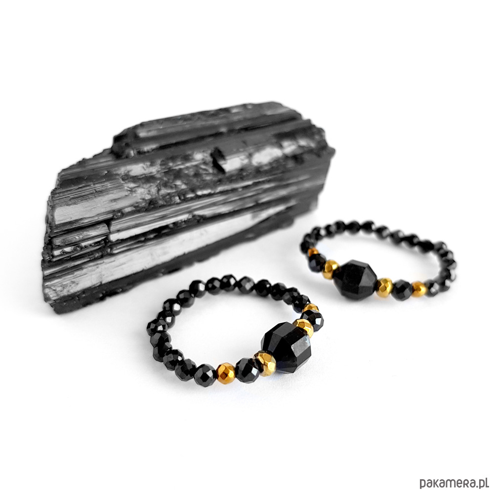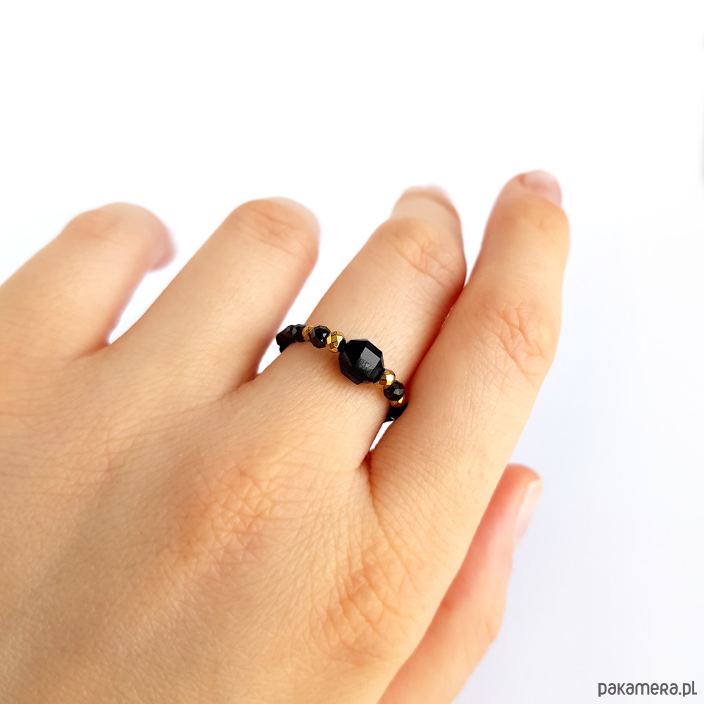 Pierścionek wykonany z kamieni naturalnych - czarnego turmalinu, hematytu i czarnego spinelu oraz mocnej, silikonowej gumki.