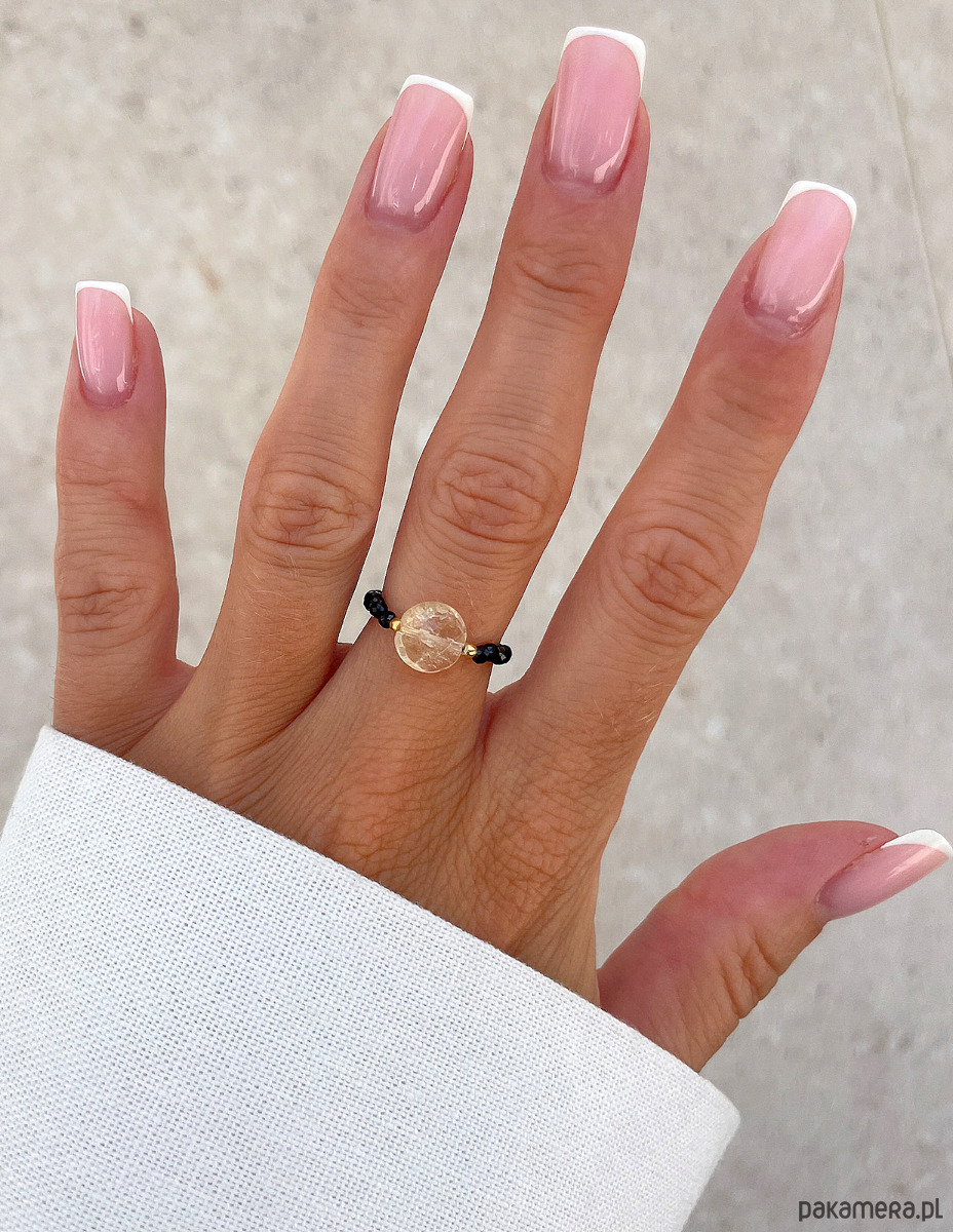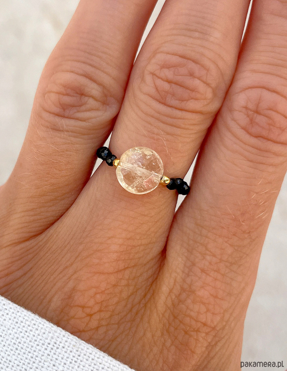 Kamienie nawleczone są na wytrzymałą, przezroczystą gumkę jubilerską, co zapewnia elastyczność i komfort noszenia. Dzięki elastycznej formie, pierścionek łatwo dopasowuje się do rozmiaru palca, eliminując potrzebę precyzyjnego mierzenia. Jest wygodny i nie uciska.