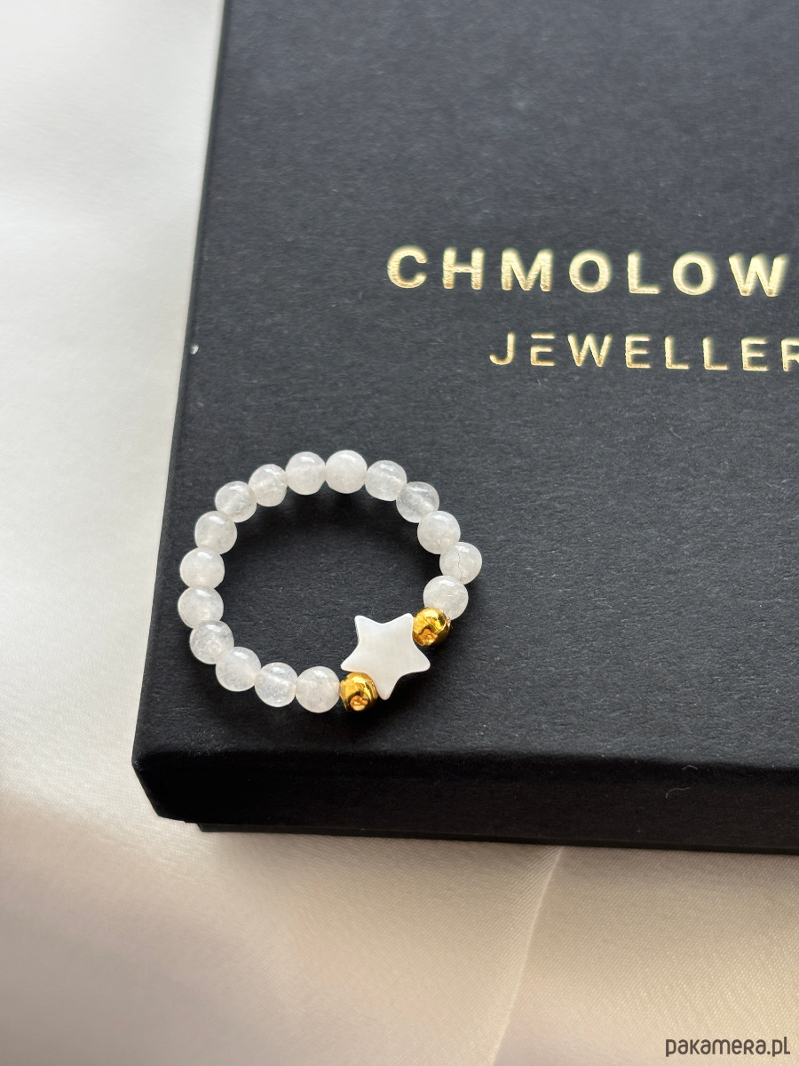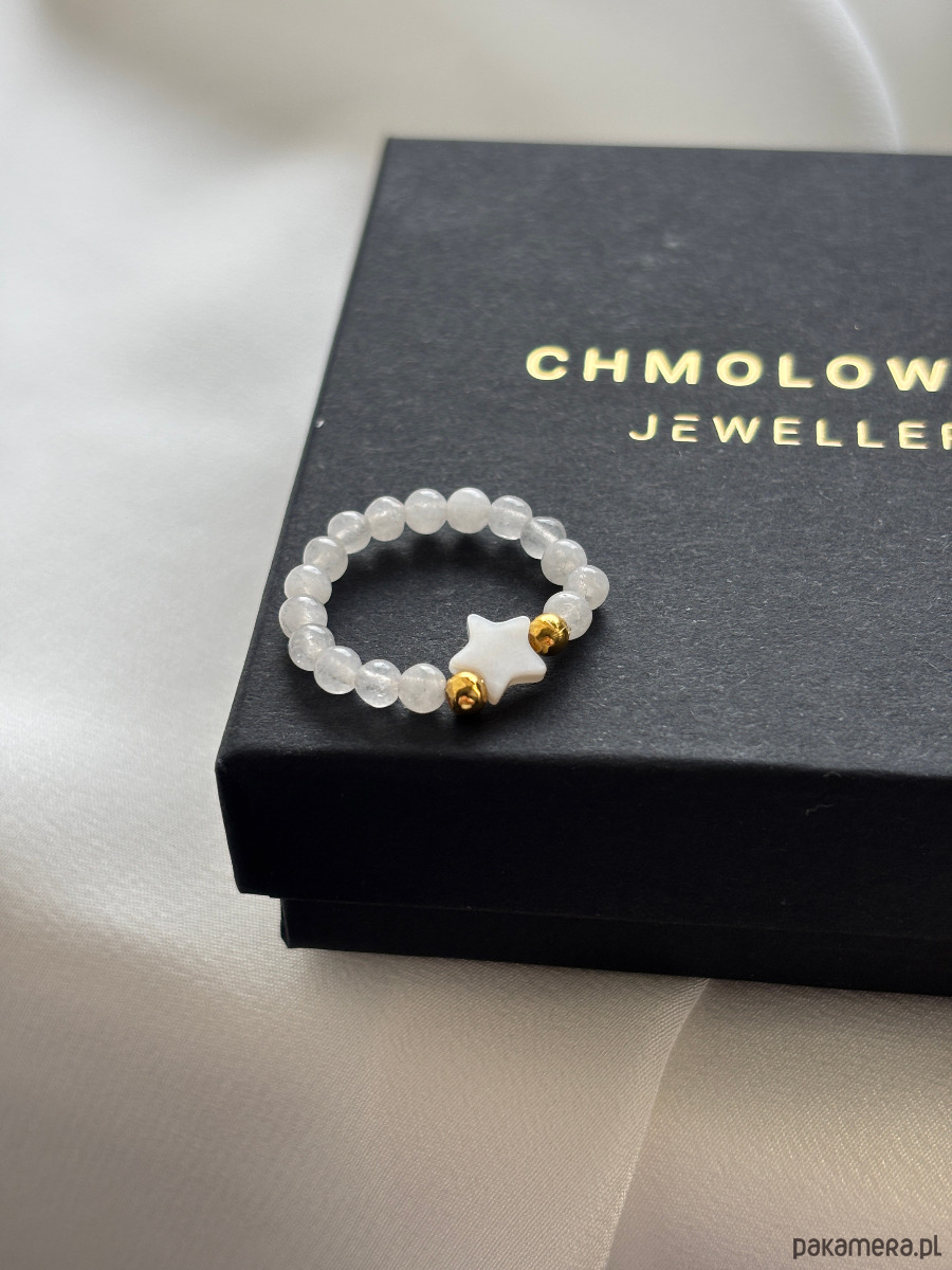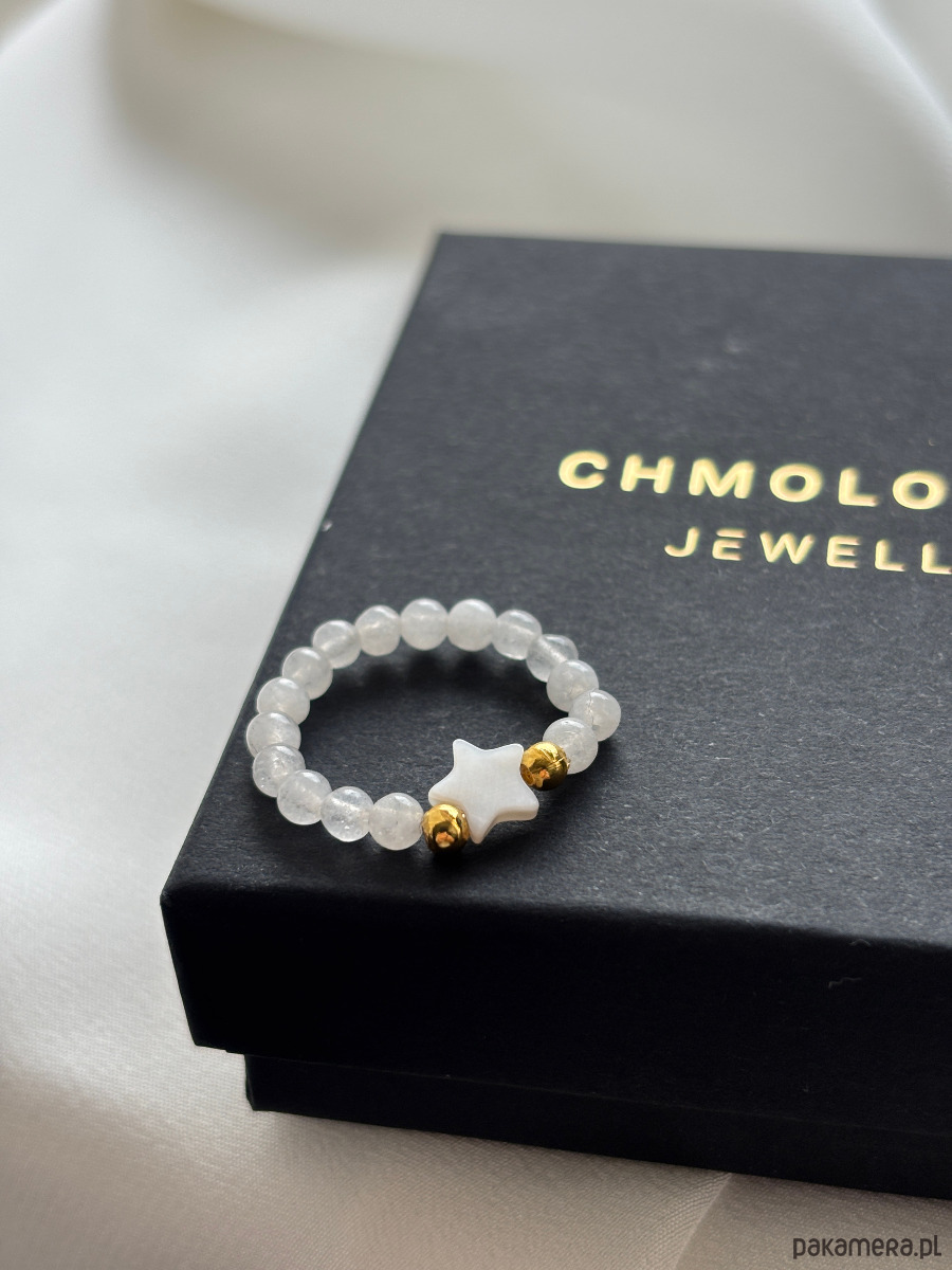 Pierścionek elastyczny wykonany jest na gumce jubilerskiej z kamienia księżycowego , gwiazdki z masy perłowej i pozłacanych przekładek.