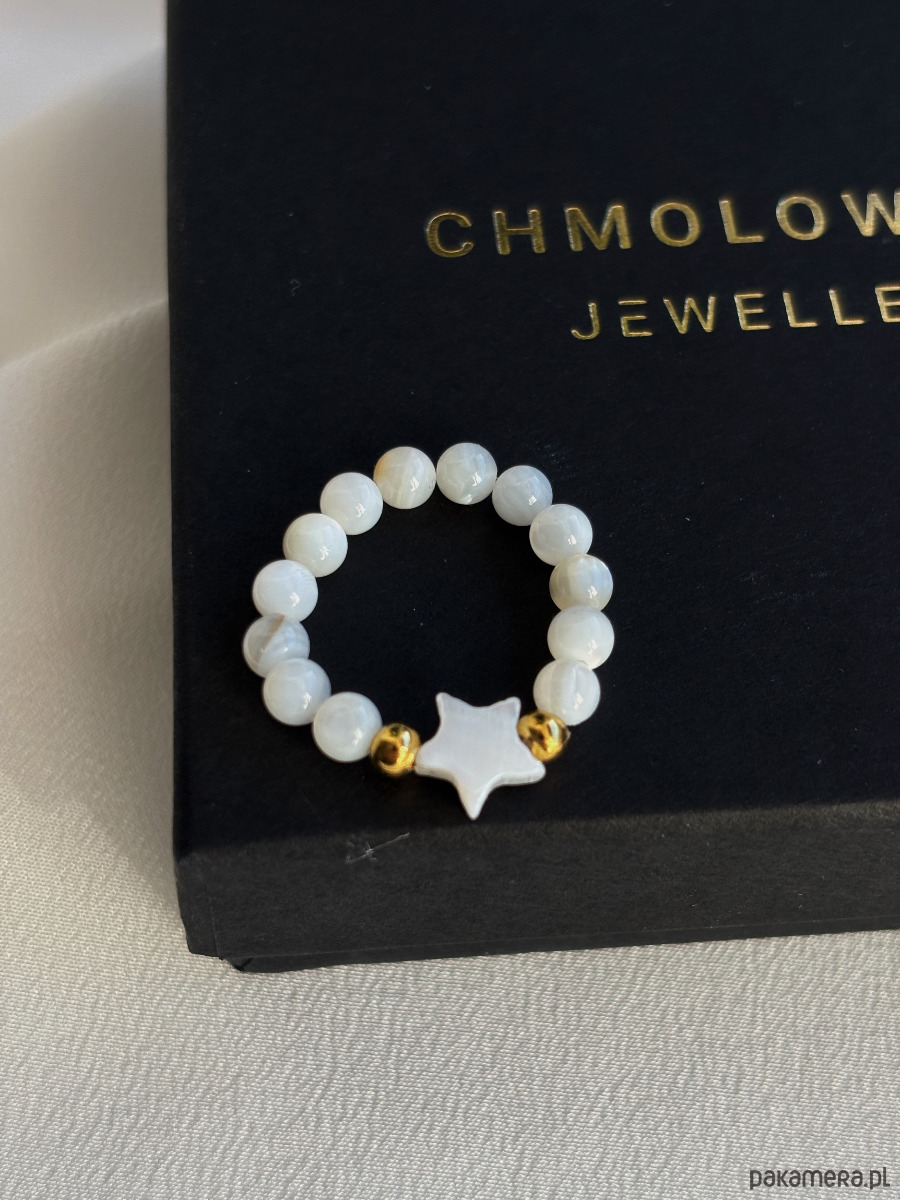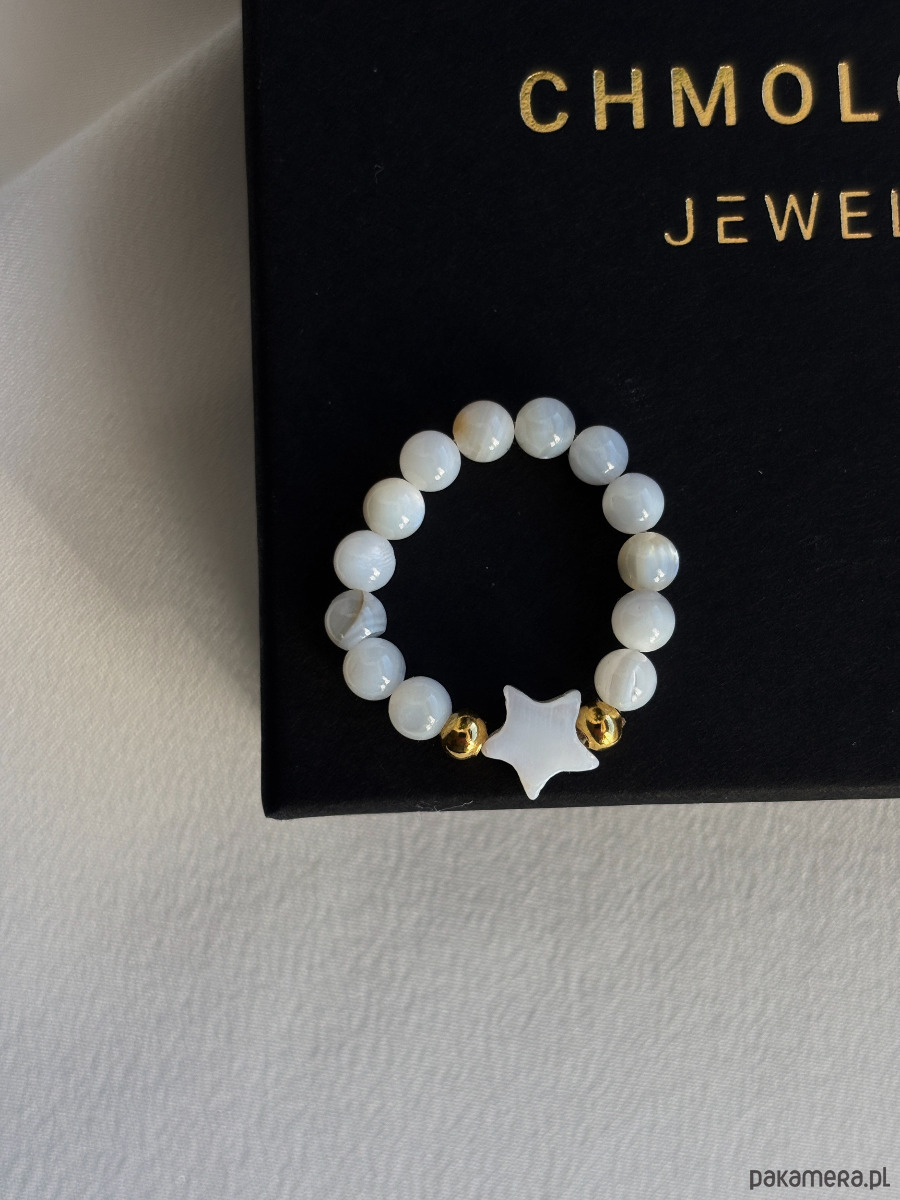 Pierścionek elastyczny wykonany jest na gumce jubilerskiej z kamienia księżycowego, gwiazdki z masy perłowej i pozłacanych przekładek.