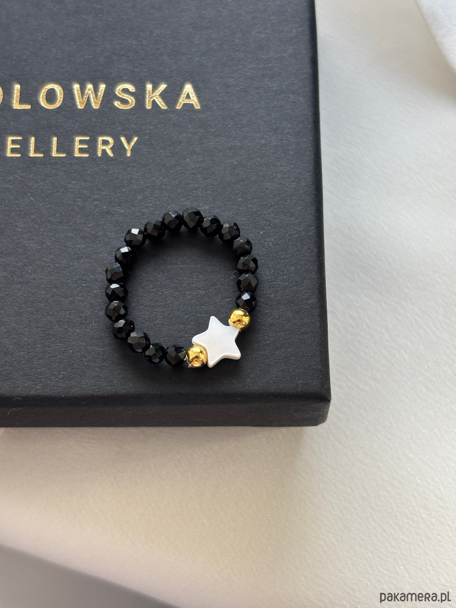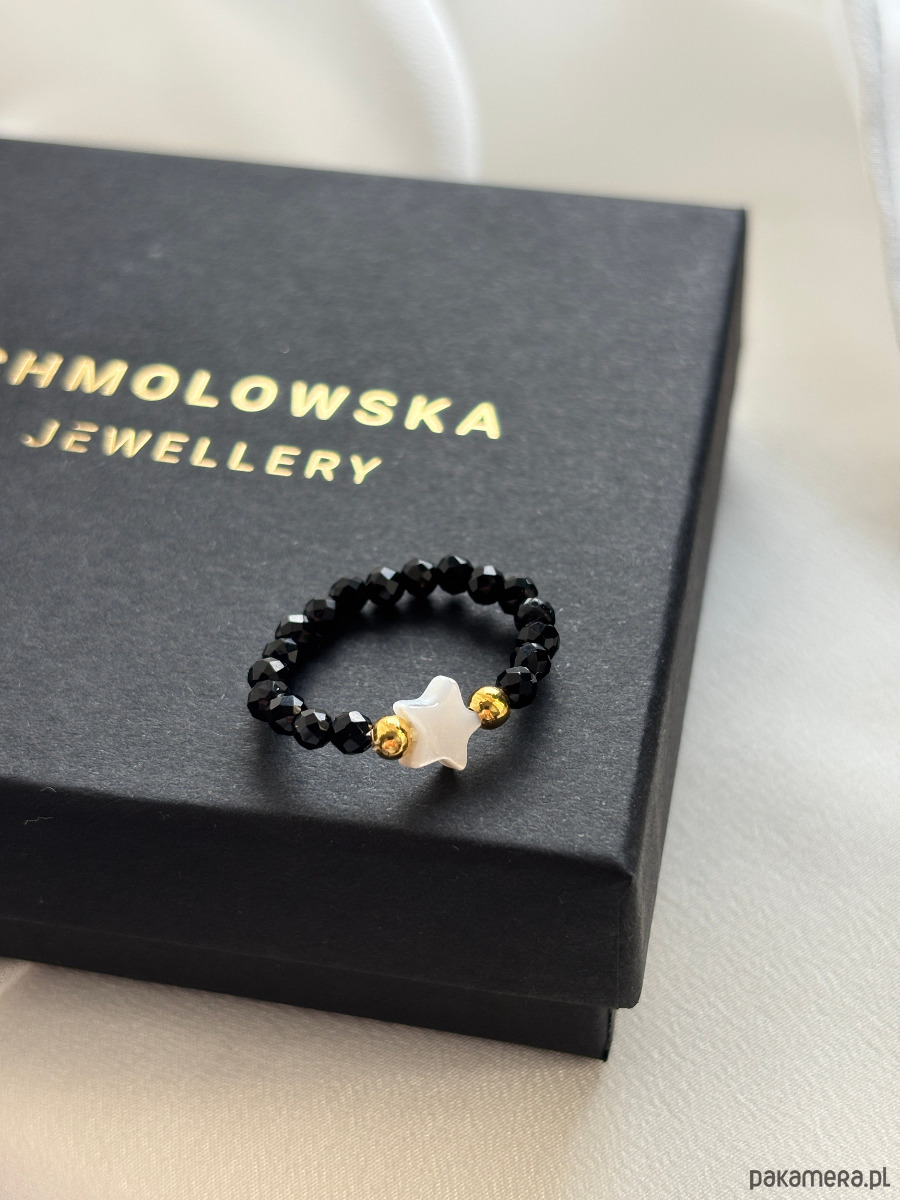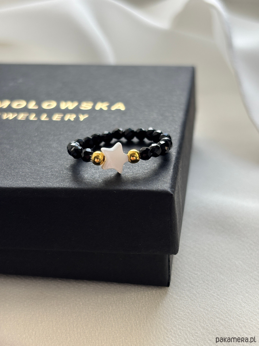 Pierścionek elastyczny wykonany jest na gumce jubilerskiej z onyksu , gwiazdki z masy perłowej i pozłacanych przekładek.