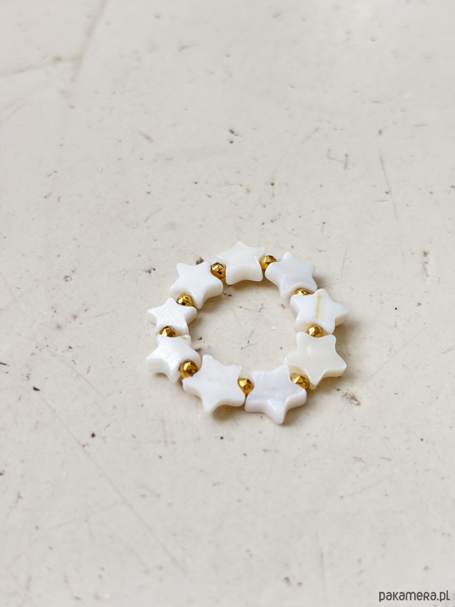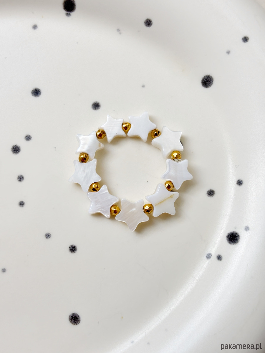 Pierścionek elastyczny wykonany jest na gumce jubilerskiej z masy perłowej i pozłacanych przekładek.