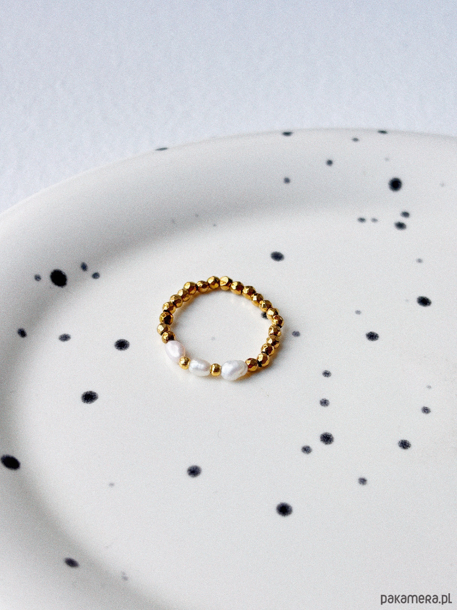 Pierścionek wykonany jest na gumce elastycznej z użyciem hematytu i perłą naturalną