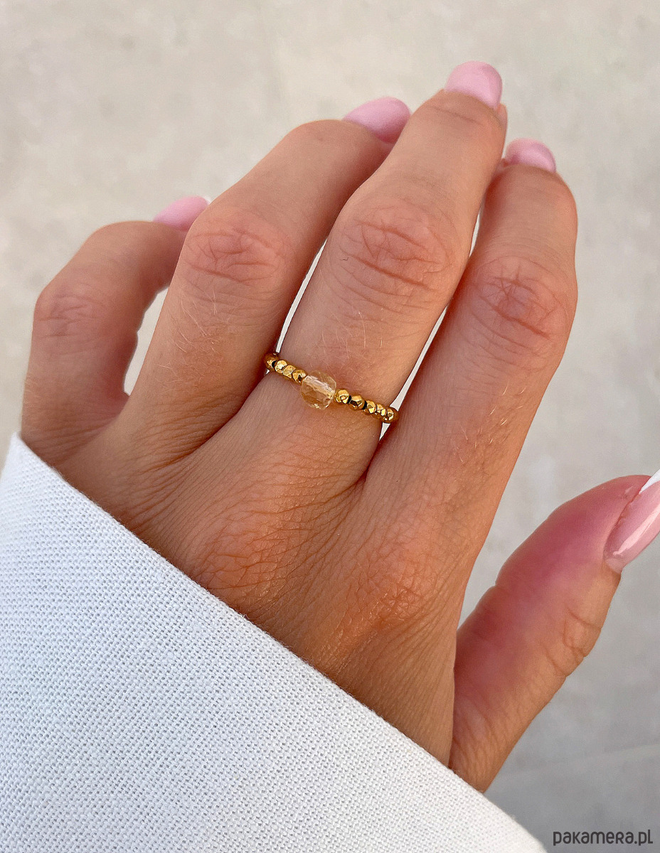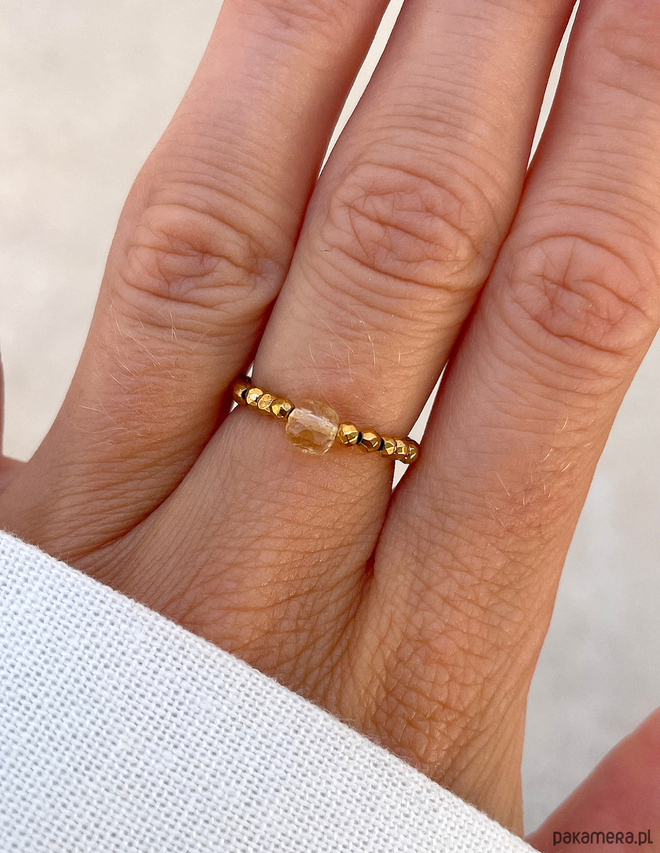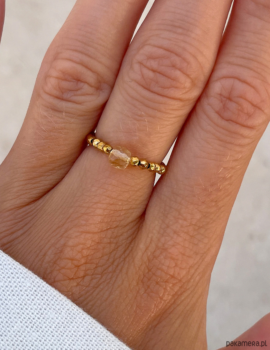 Ten energetyczny elastyczny pierścionek to promienny dodatek, który wnosi światło i optymizm do każdej stylizacji. Drobne, fasetowane kamienie hematytu w kolorze złotym (ok. 2 mm) tworzą lśniącą, metaliczną bazę, która wspaniale odbija światło, nadając biżuterii luksusowego charakteru. W centrum kompozycji dumnie prezentuje się pojedynczy, fasetowany kamień cytrynu (ok. 4 mm). Jego czysty, słoneczny żółty kolor stanowi mocny, pozytywny akcent, symbolizujący radość i witalność. To połączenie blasku złota z ciepłem cytrynu tworzy szykowny i pełen pozytywnej energii dodatek, idealny na rozjaśnienie każdego dnia.