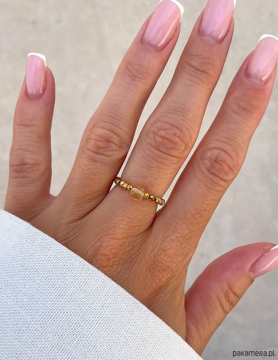 Kamienie nawleczone są na wytrzymałą, przezroczystą gumkę jubilerską, co zapewnia elastyczność i komfort noszenia. Dzięki elastycznej formie, pierścionek łatwo dopasowuje się do rozmiaru palca, eliminując potrzebę precyzyjnego mierzenia. Jest wygodny i nie uciska.