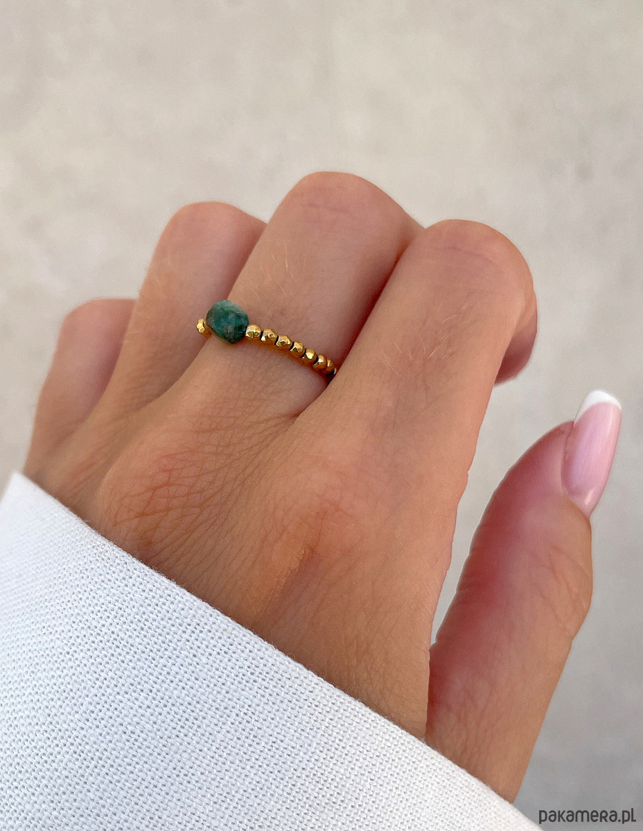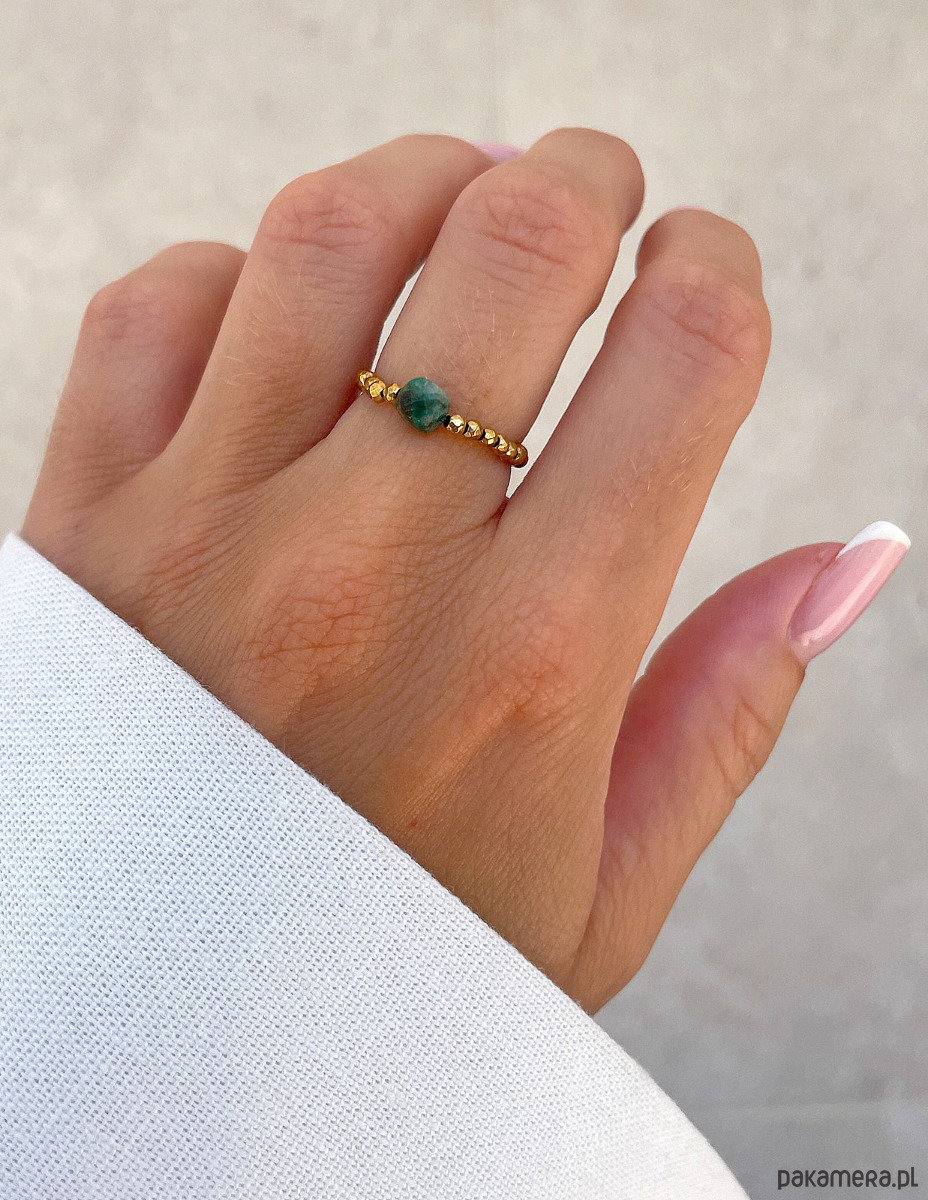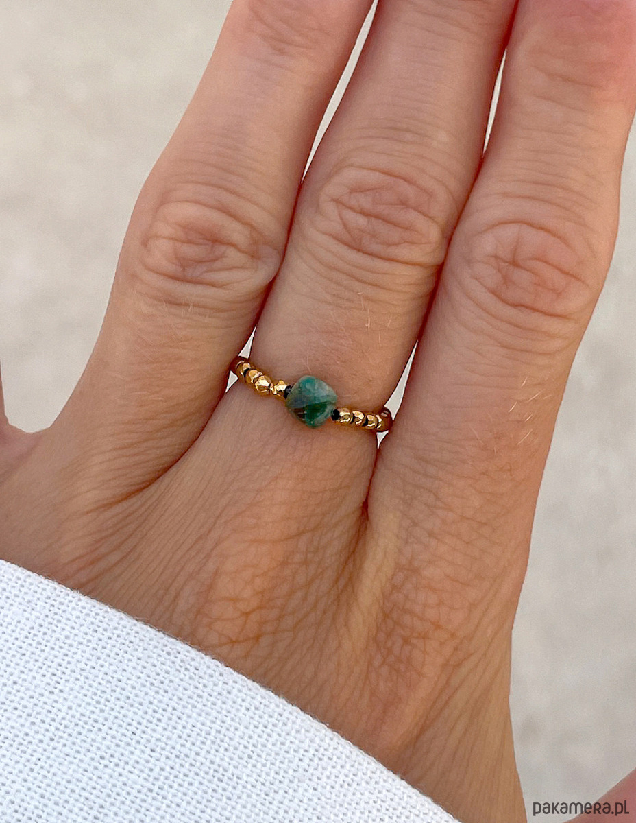Ten efektowny elastyczny pierścionek to wyrazisty dodatek, który przyciąga wzrok intensywną barwą i blaskiem. Drobne, fasetowane kamienie hematytu w kolorze złotym (ok. 2 mm) tworzą lśniącą, metaliczną bazę, której blask pięknie współgra z każdym ruchem dłoni. Hematyt nadaje biżuterii nowoczesnego i zdecydowanego charakteru. W centrum kompozycji dumnie prezentuje się pojedynczy, fasetowany turkus afrykański (ok. 4 mm). Jego głęboki, zielony kolor z naturalnymi, ciemniejszymi wtrąceniami sprawia, że jest to unikatowy kamień, stanowiący mocny, kolorystyczny akcent. To połączenie blasku złota z surowym pięknem turkusu tworzy dodatek idealny dla osób ceniących biżuterię z charakterem i duszą.