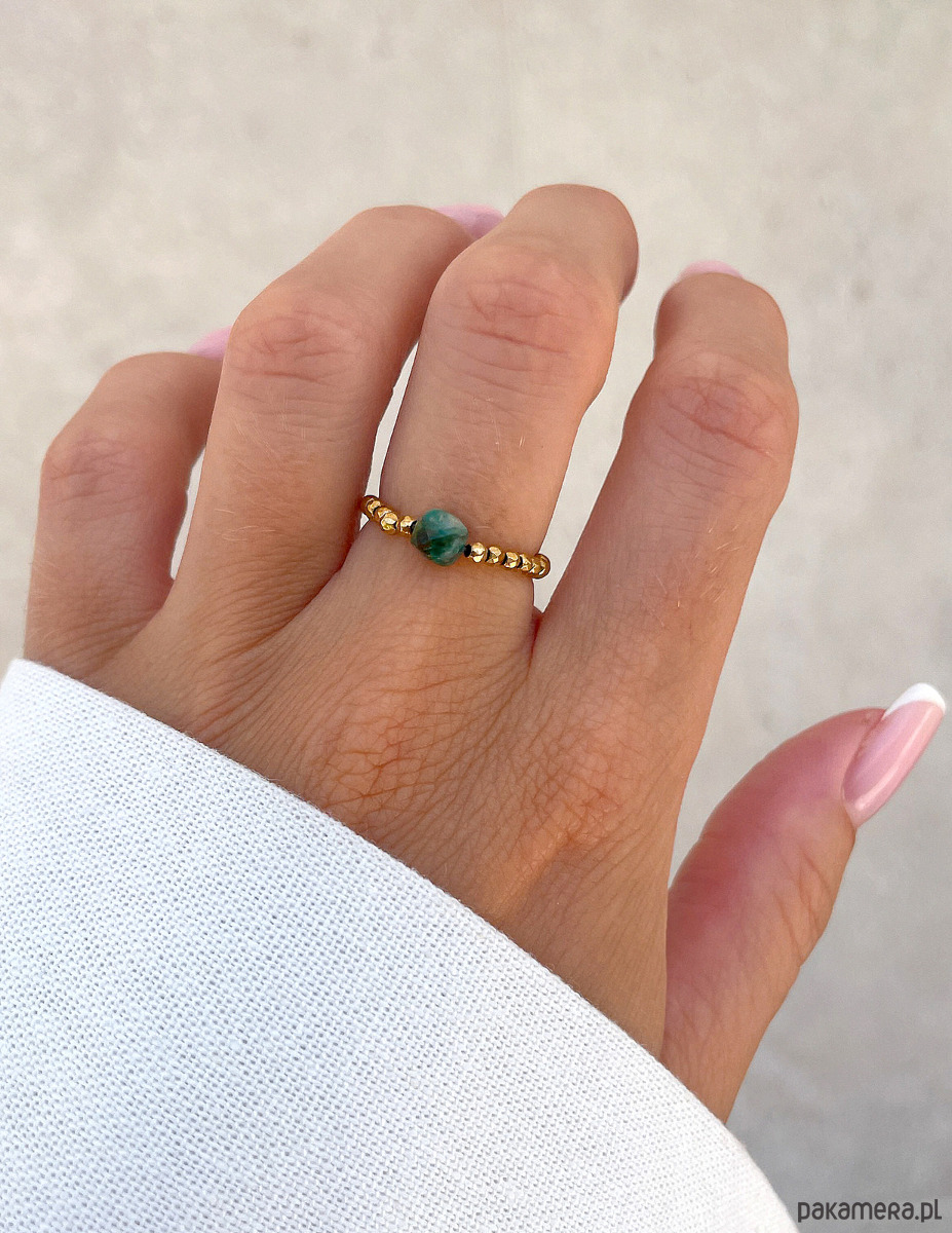 Kamienie nawleczone są na wytrzymałą, przezroczystą gumkę jubilerską, co zapewnia elastyczność i komfort noszenia. Dzięki elastycznej formie, pierścionek łatwo dopasowuje się do rozmiaru palca, eliminując potrzebę precyzyjnego mierzenia. Jest wygodny i nie uciska.