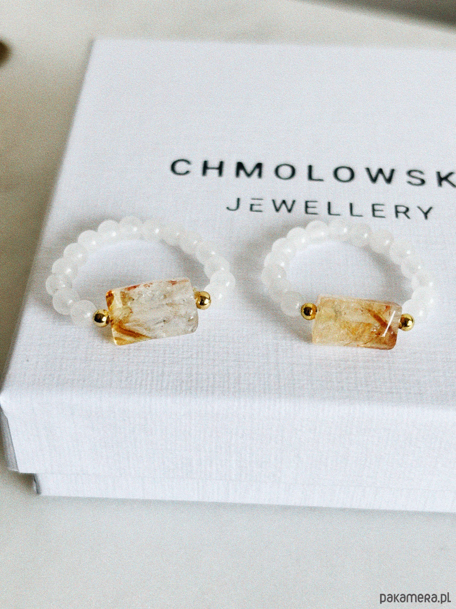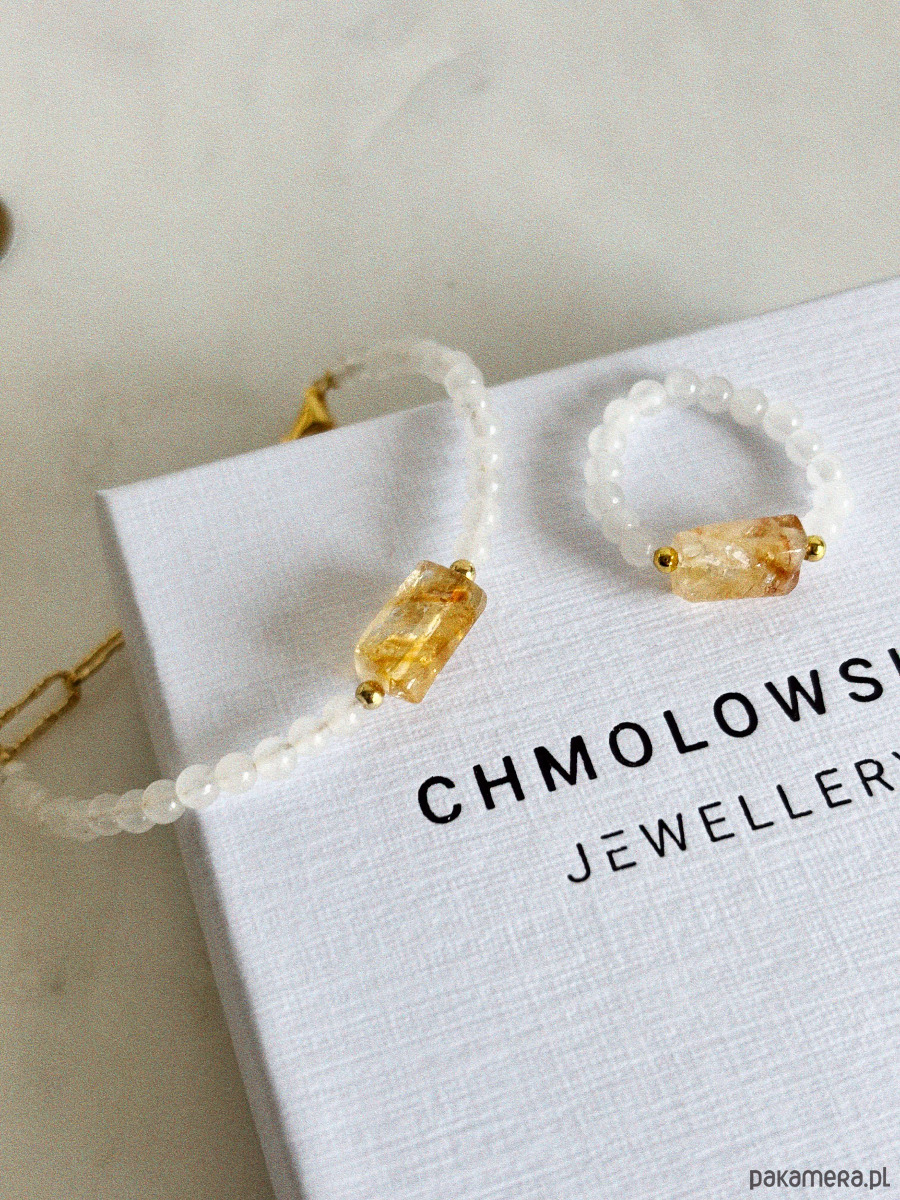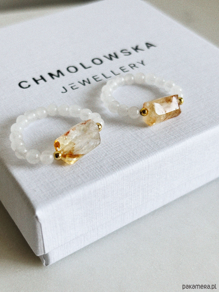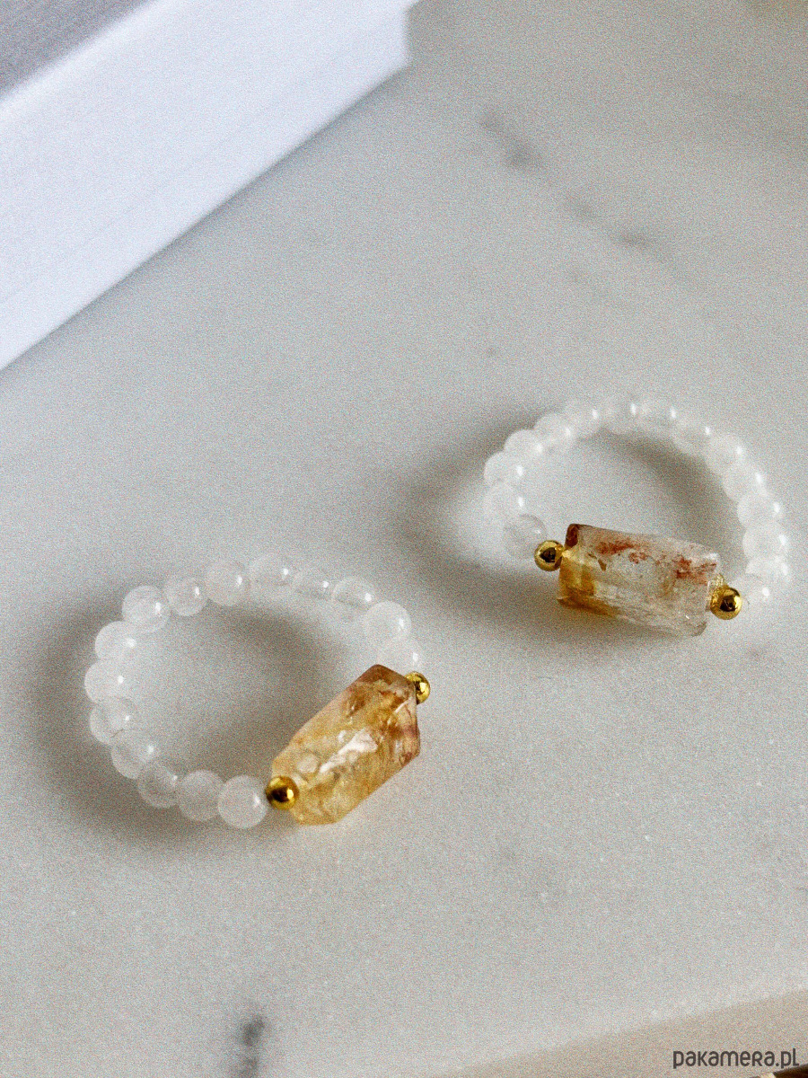 Pierścionek wykonany jest na gumce jubilerskiej z użyciem jadeitu i surowego cytrynu.