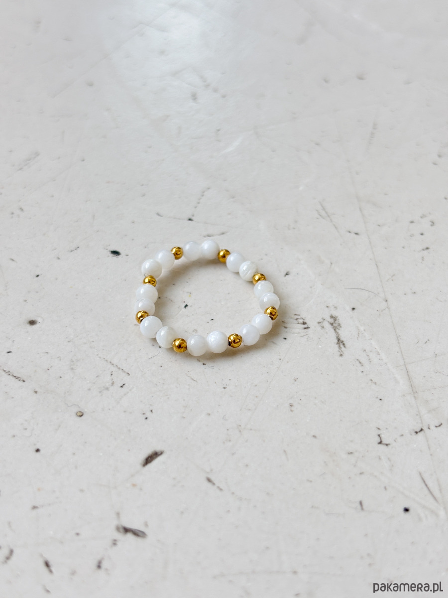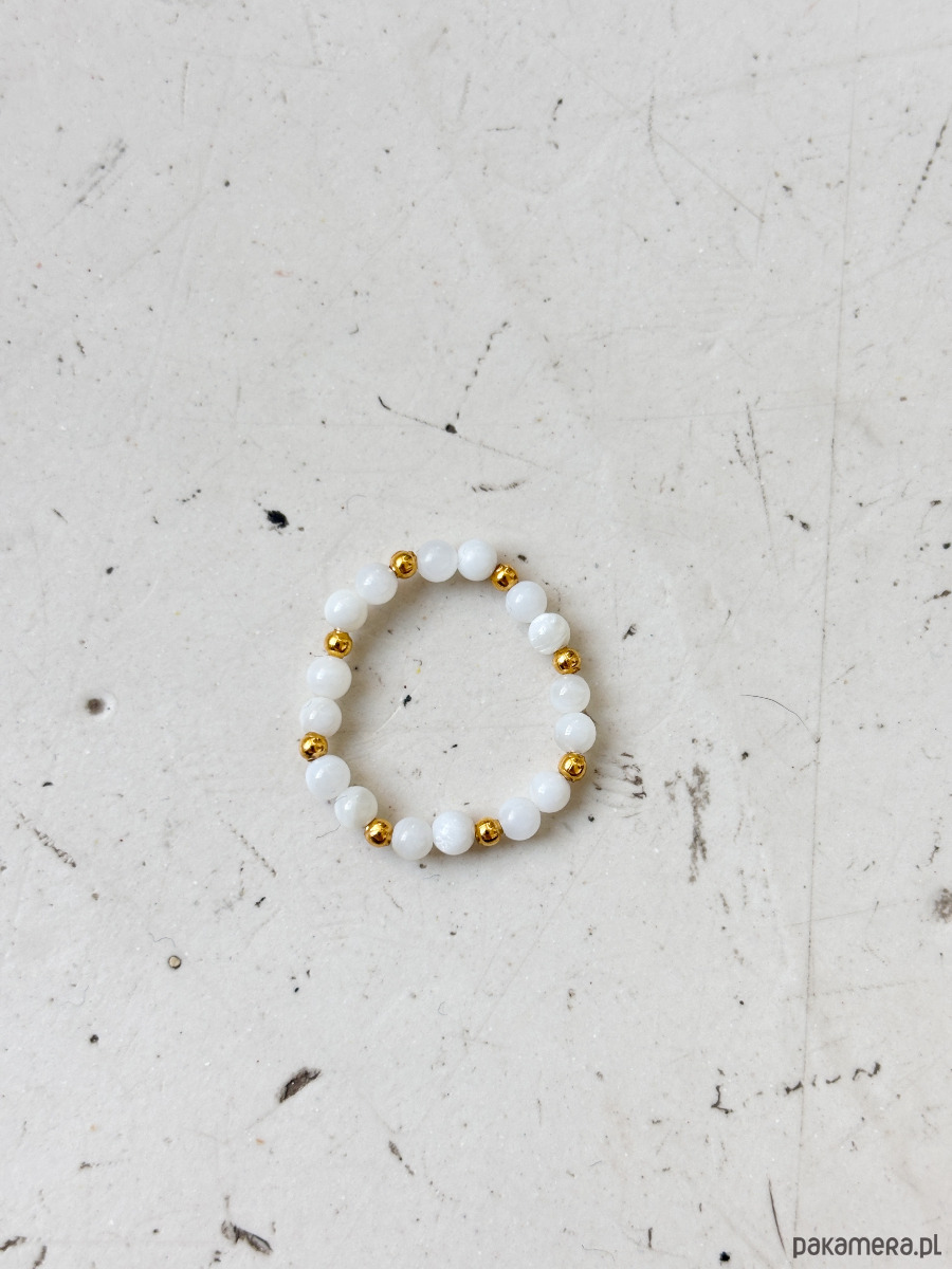 Pierścionek wykonany jest z kamienia księżycowego z przekładkami.