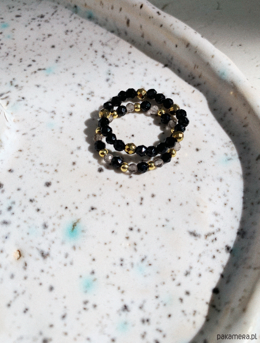 Pierścionki wykonane są z onyksu, kwarcu dymnego i hematytu.